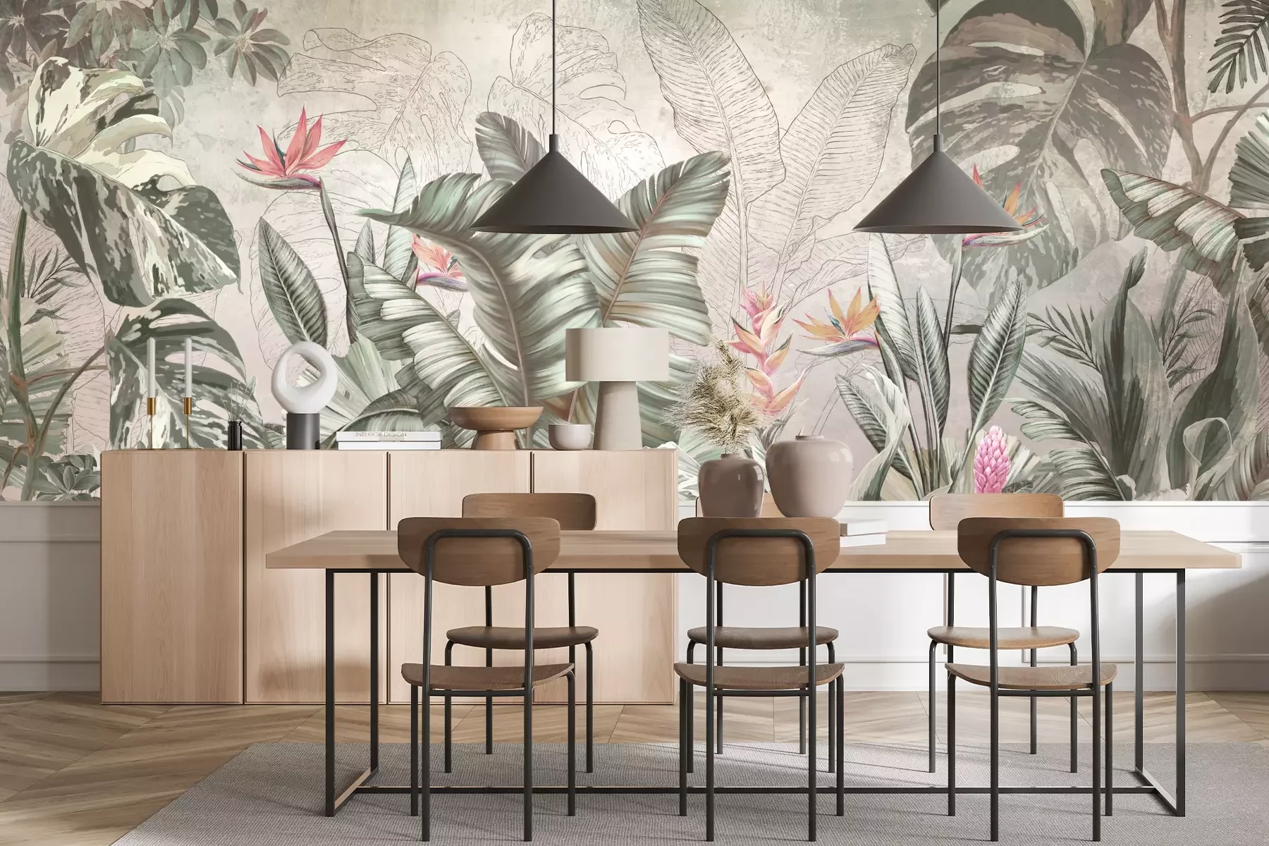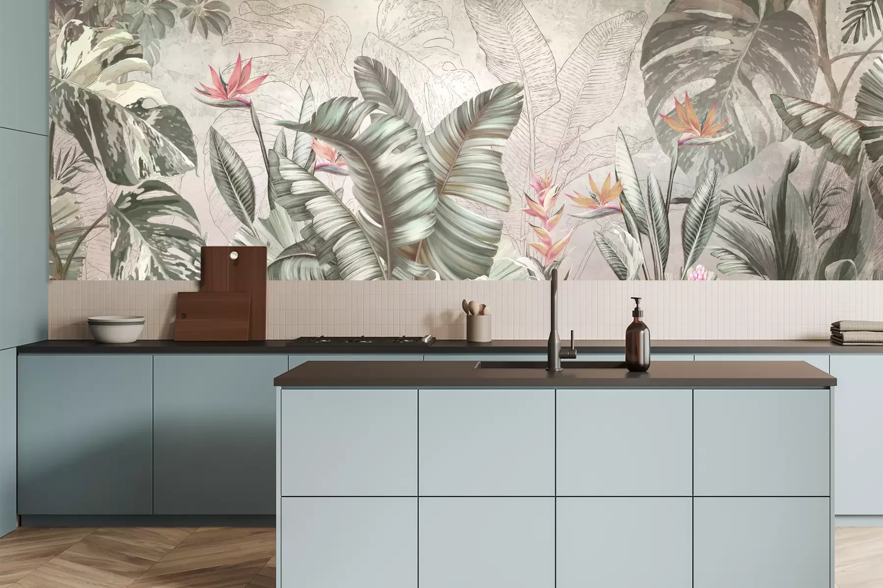 Das Material Premium+ besteht aus einer strukturierten Vinyl-Oberschicht und einem Trägermaterial (Vlies) mit einer Grammatur von 255 g/m², das kleine Unebenheiten der Wand zuverlässig kaschiert. Die feine Sandstruktur verleiht der Oberfläche eine luxuriöse Haptik, während das halbmatte Finish die Tiefe der Farben betont. Das Material ist dampfdurchlässig – so kann diese Fototapete auch in Küchen und Badezimmern eingesetzt werden. Die maximale Breite einer Tapetenbahn beträgt 100 cm. Bei größeren Abmessungen besteht die Fototapete aus mehreren gleich großen Bahnen. Der Kleber wird direkt auf die Wand aufgetragen, und die Fototapete wird auf Stoß angebracht, was für einen ästhetischen Effekt ohne sichtbare Fugen sorgt. Die Oberfläche ist pflegeleicht und kann bei Bedarf sanft mit einem feuchten Tuch abgewischt werden.