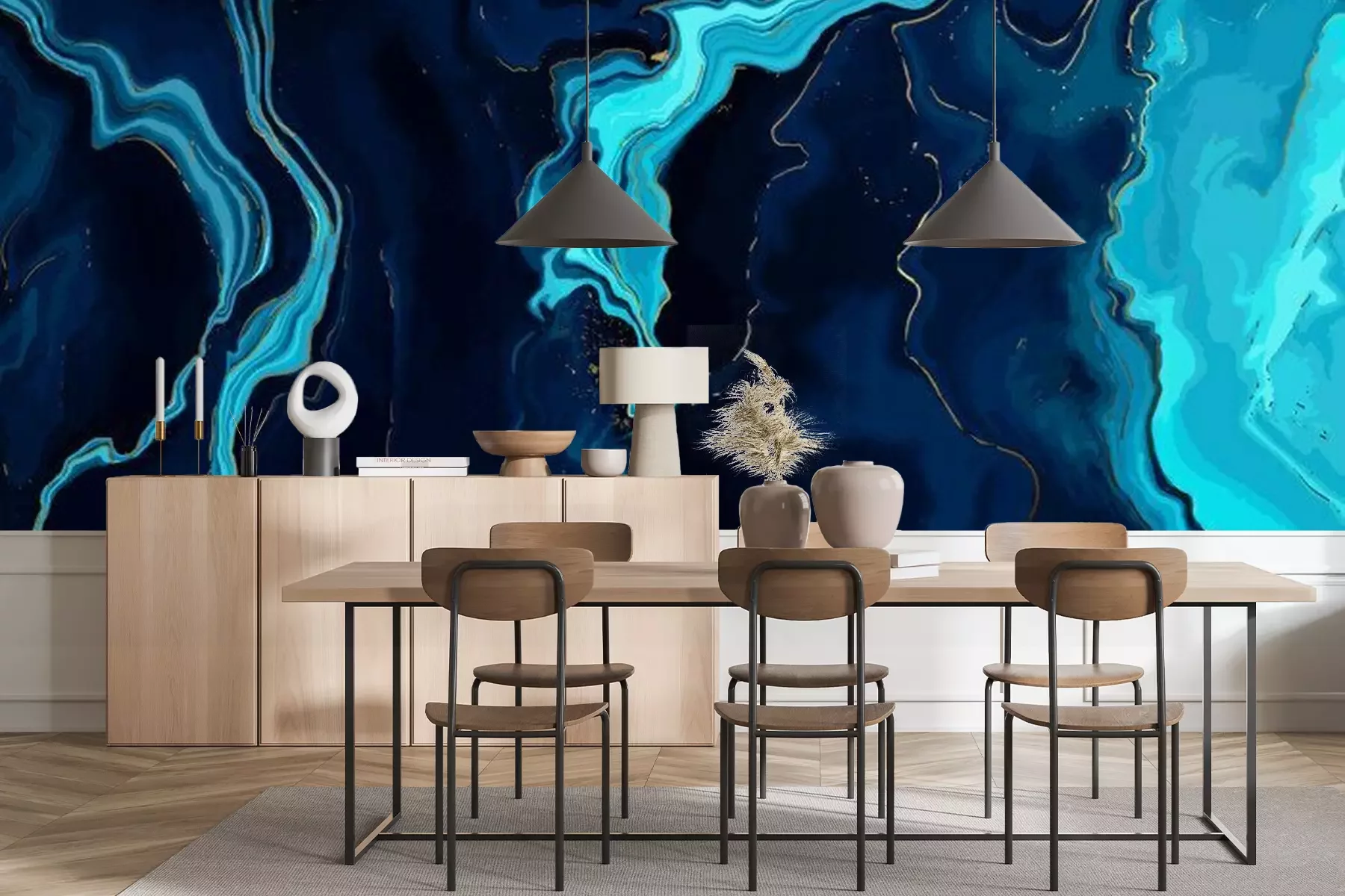 Das Material Premium+ besteht aus einer strukturierten Vinyl-Oberschicht und einem Trägermaterial (Vlies) mit einer Grammatur von 255 g/m², das kleine Unebenheiten der Wand zuverlässig kaschiert. Die feine Sandstruktur verleiht der Oberfläche eine luxuriöse Haptik, während das halbmatte Finish die Tiefe der Farben betont. Das Material ist dampfdurchlässig – so kann diese Fototapete auch in Küchen und Badezimmern eingesetzt werden. Die maximale Breite einer Tapetenbahn beträgt 100 cm. Bei größeren Abmessungen besteht die Fototapete aus mehreren gleich großen Bahnen. Der Kleber wird direkt auf die Wand aufgetragen, und die Fototapete wird auf Stoß angebracht, was für einen ästhetischen Effekt ohne sichtbare Fugen sorgt. Die Oberfläche ist pflegeleicht und kann bei Bedarf sanft mit einem feuchten Tuch abgewischt werden.