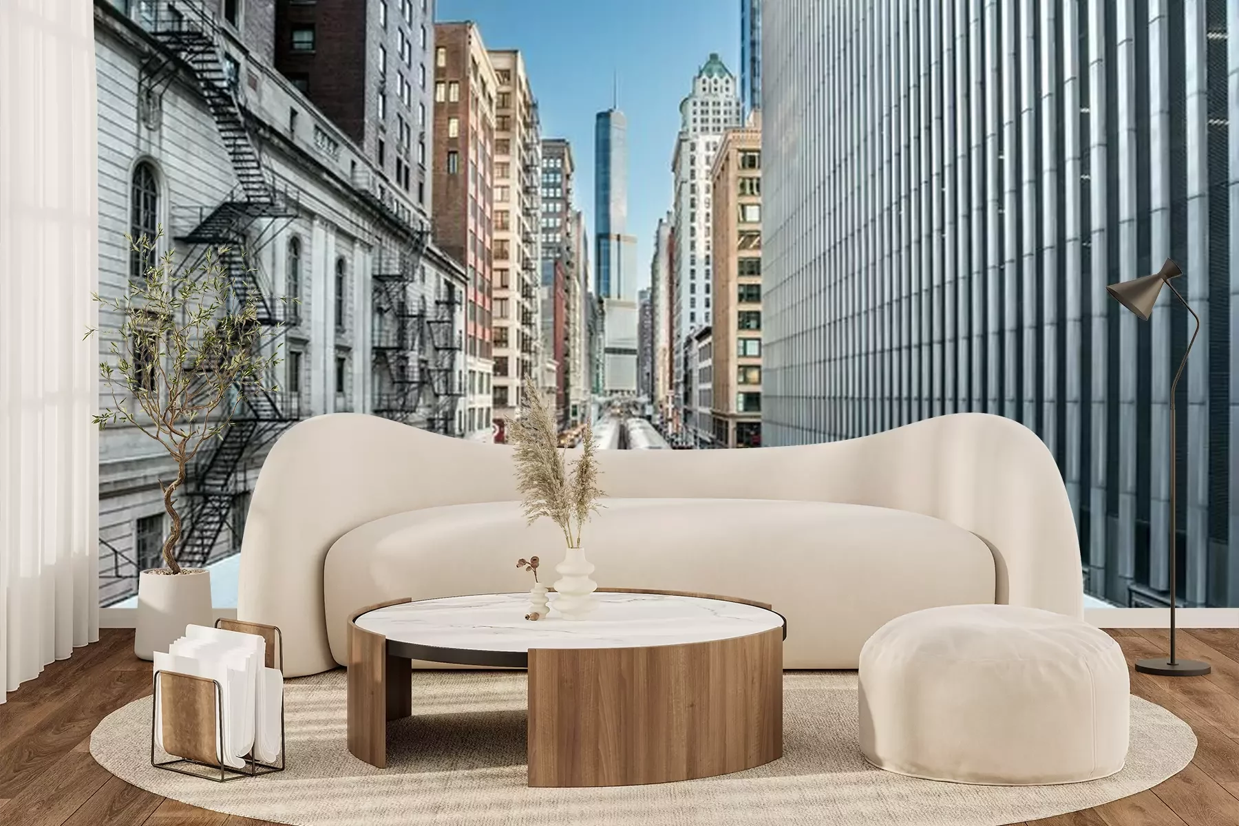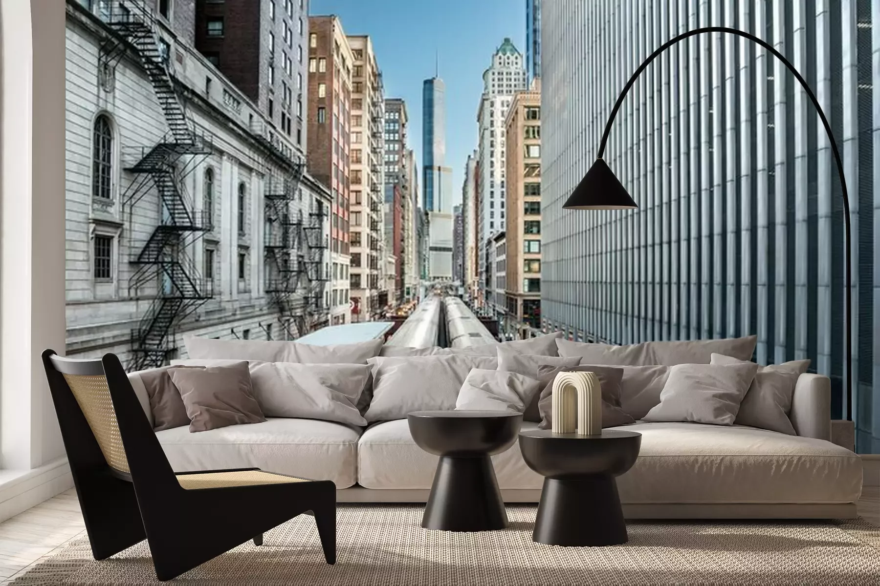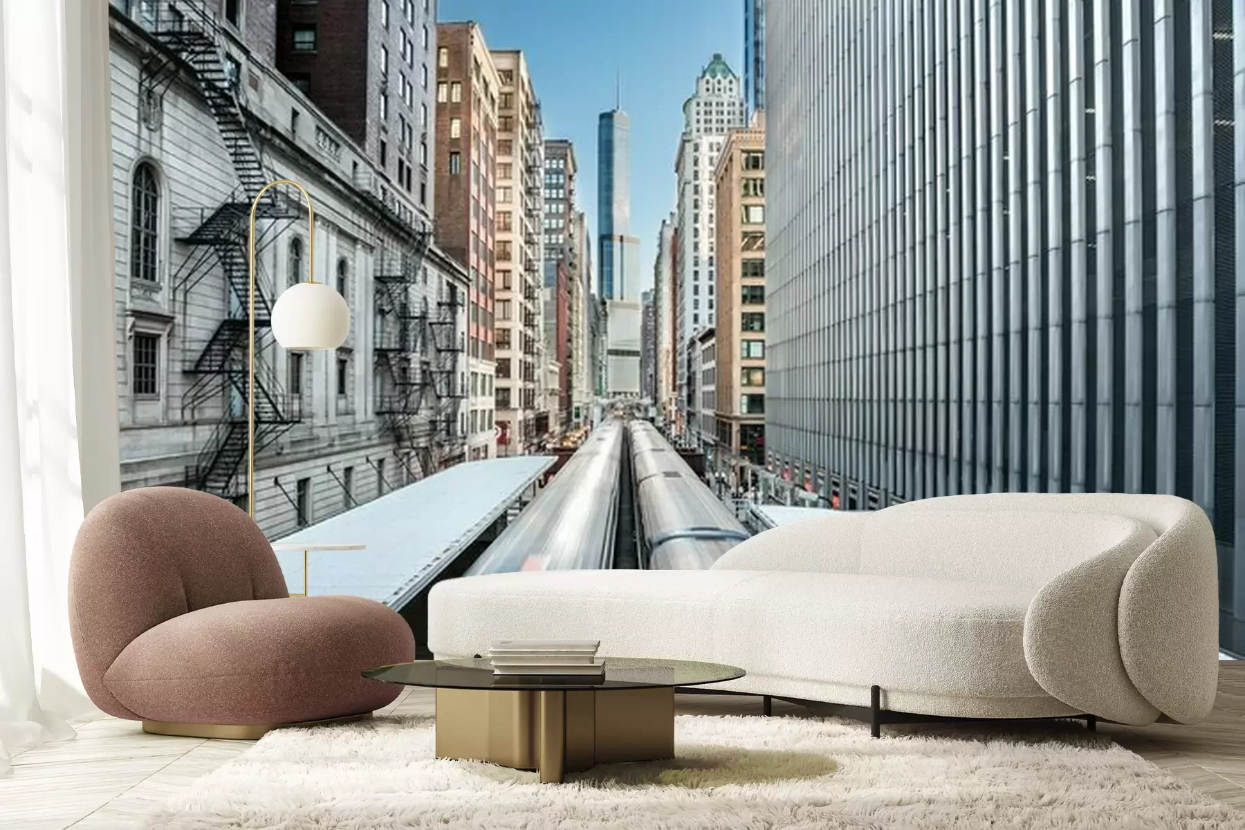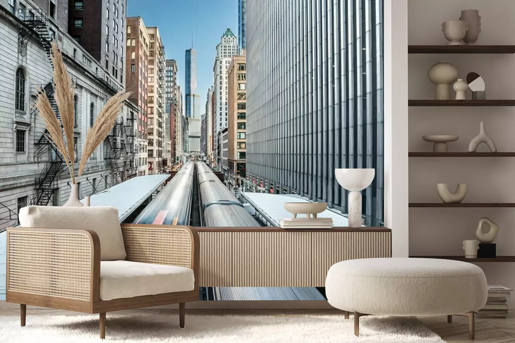 Fototapete Two trains of the Chicago metro system crossing the elevated railroad in a skyscrapers canyon in the Loop district, Chicago, Illinois, United States