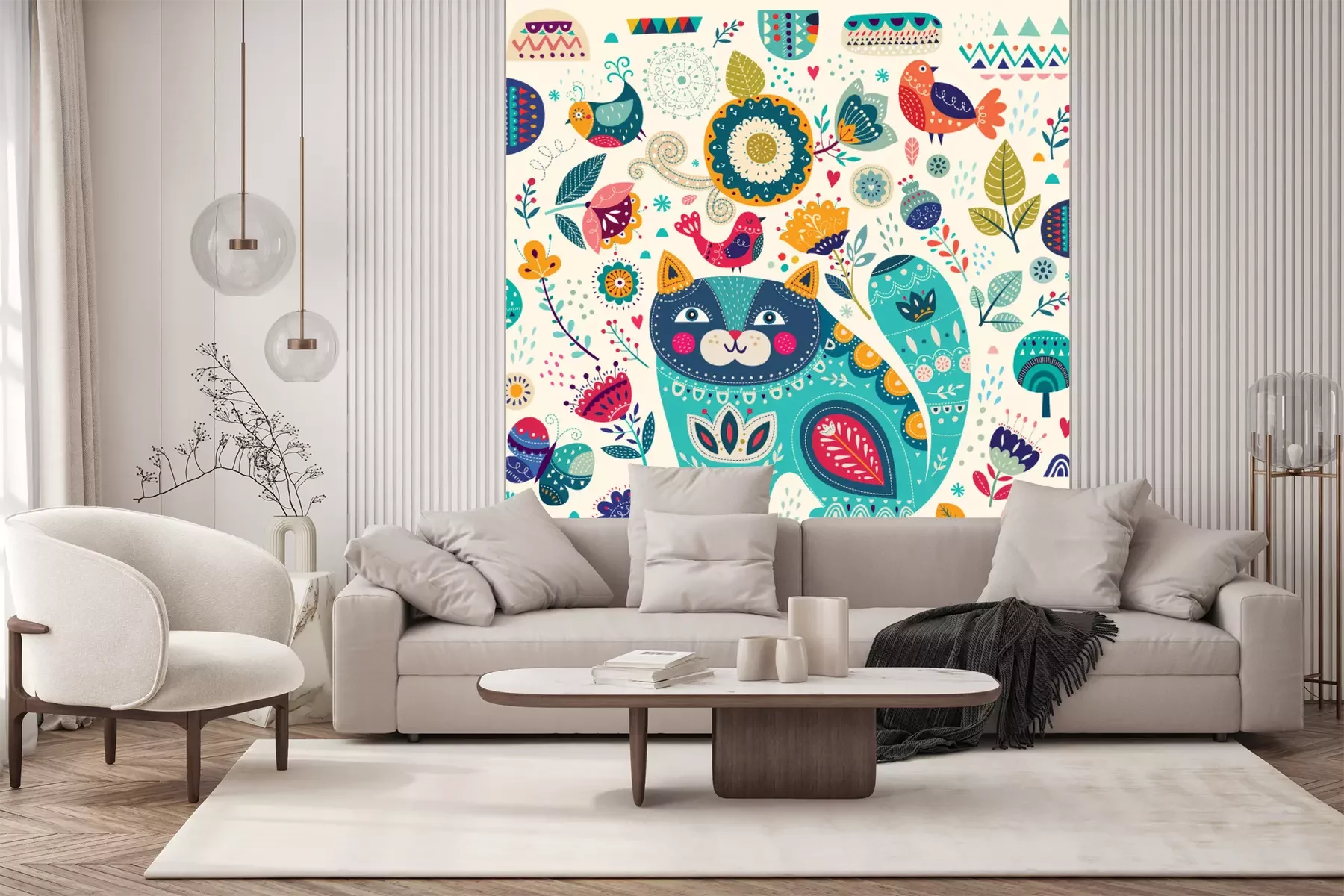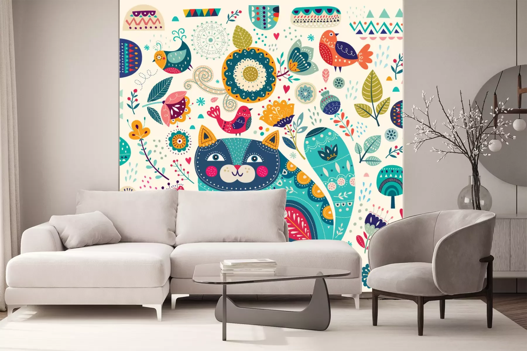 Fototapete Vector bunte Illustration mit schönen Katze, Schmetterlinge, Vögel und Blumen
