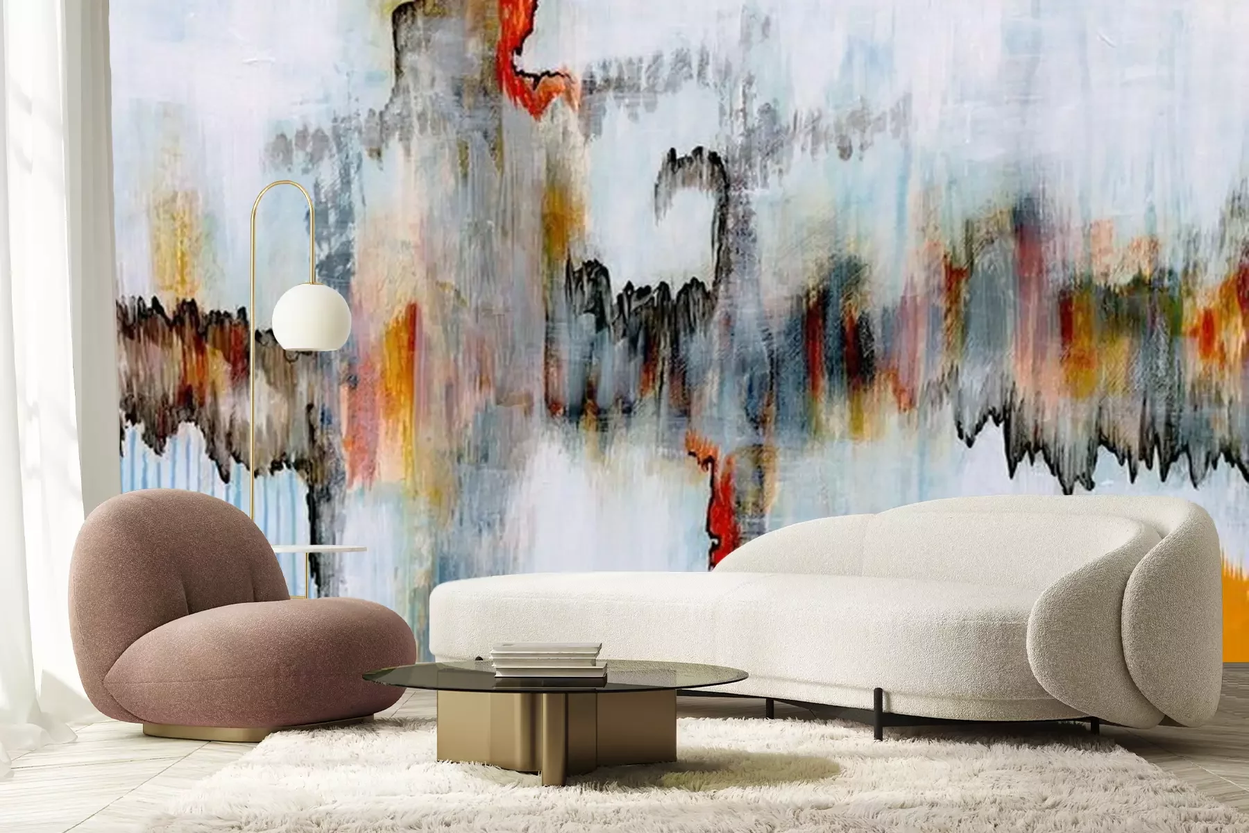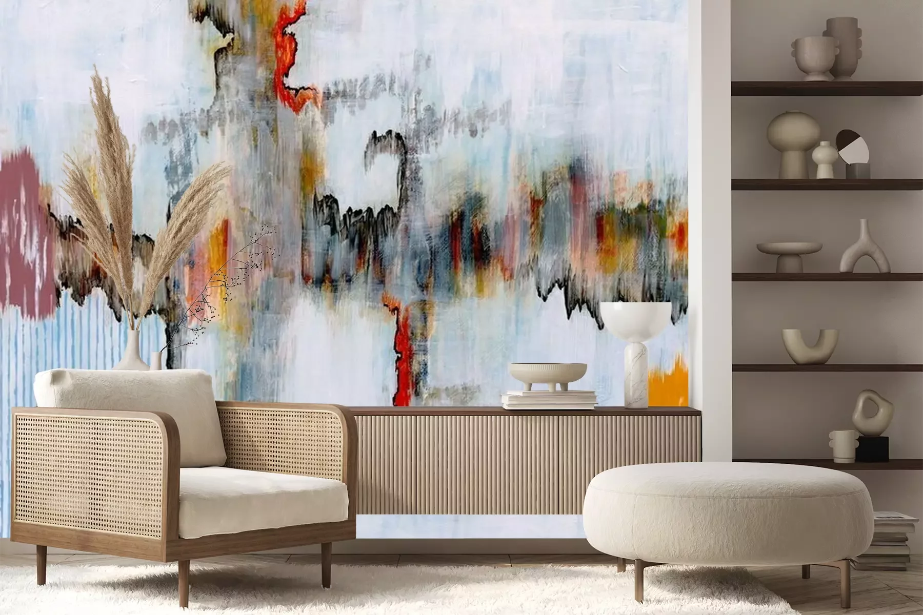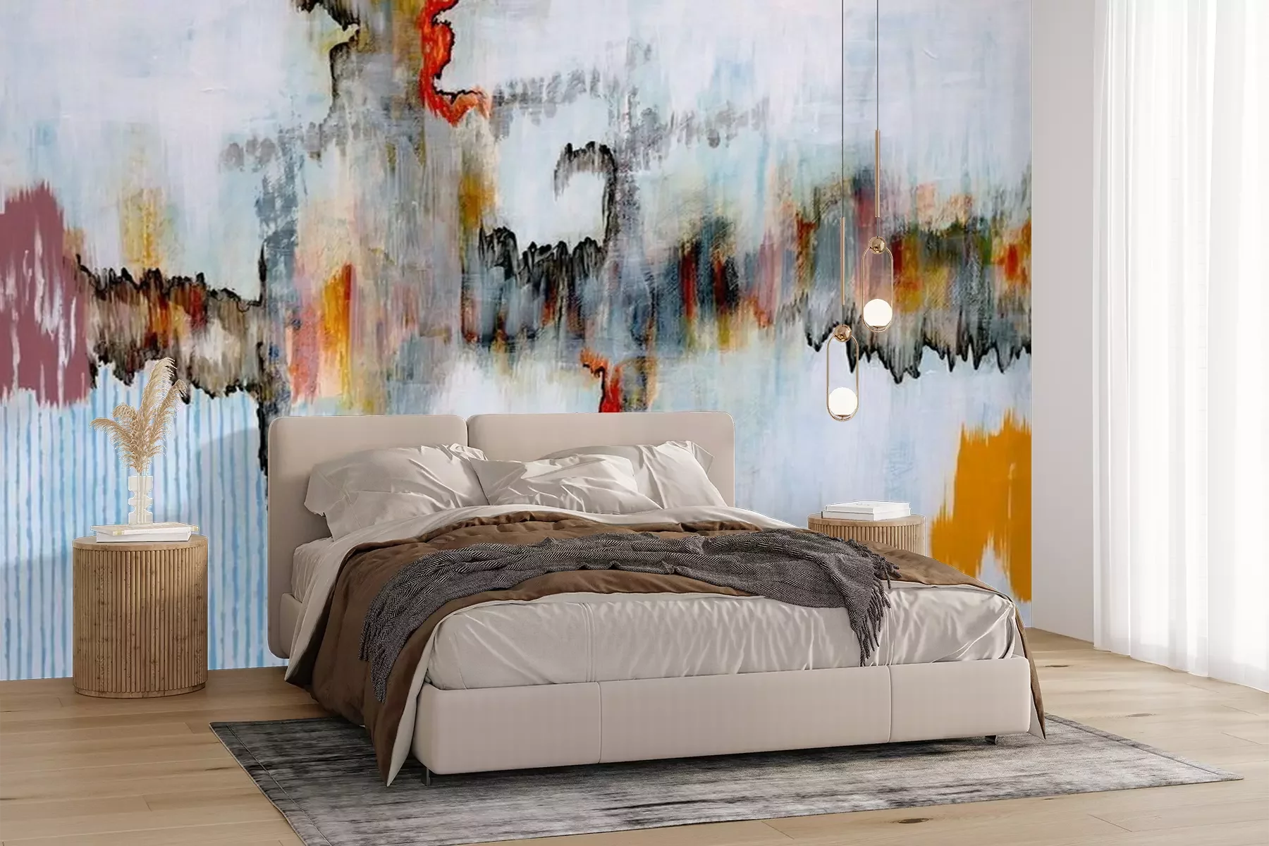 Das Material Premium+ besteht aus einer strukturierten Vinyl-Oberschicht und einem Trägermaterial (Vlies) mit einer Grammatur von 255 g/m², das kleine Unebenheiten der Wand zuverlässig kaschiert. Die feine Sandstruktur verleiht der Oberfläche eine luxuriöse Haptik, während das halbmatte Finish die Tiefe der Farben betont. Das Material ist dampfdurchlässig – so kann diese Fototapete auch in Küchen und Badezimmern eingesetzt werden. Die maximale Breite einer Tapetenbahn beträgt 100 cm. Bei größeren Abmessungen besteht die Fototapete aus mehreren gleich großen Bahnen. Der Kleber wird direkt auf die Wand aufgetragen, und die Fototapete wird auf Stoß angebracht, was für einen ästhetischen Effekt ohne sichtbare Fugen sorgt. Die Oberfläche ist pflegeleicht und kann bei Bedarf sanft mit einem feuchten Tuch abgewischt werden.