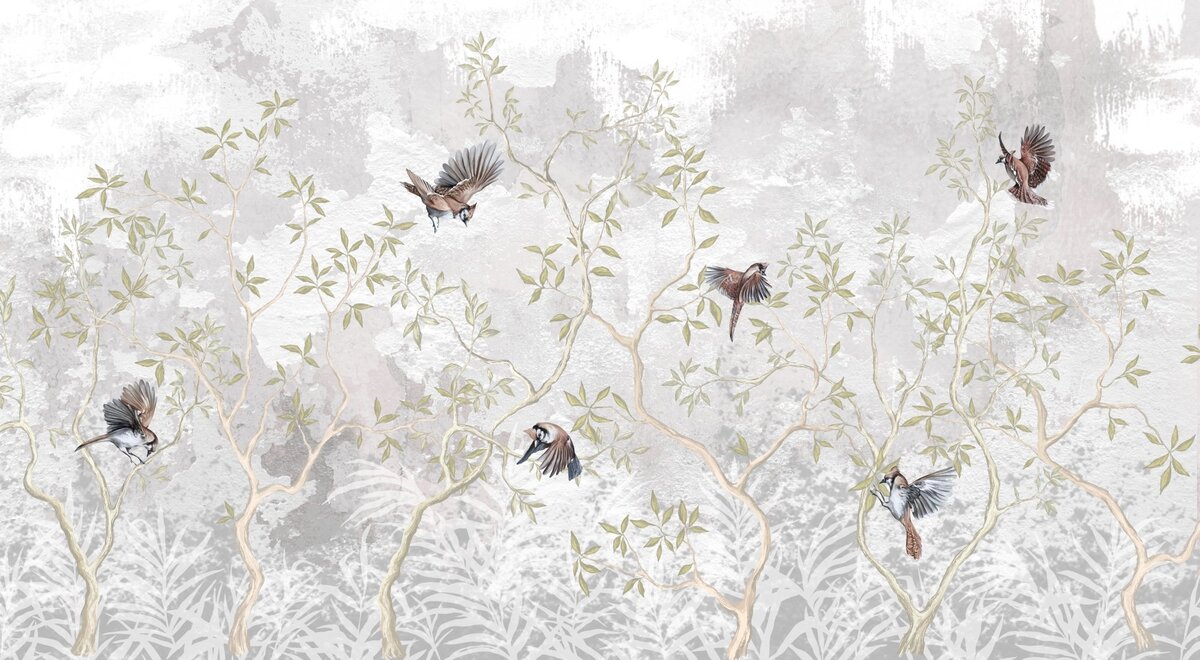 Fototapete: Vögel auf Baumzweigen, Betonhintergrund