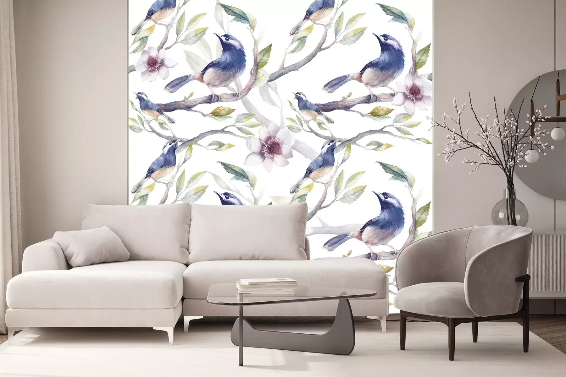 Fototapete Vögel auf Zweigen in Aquarell