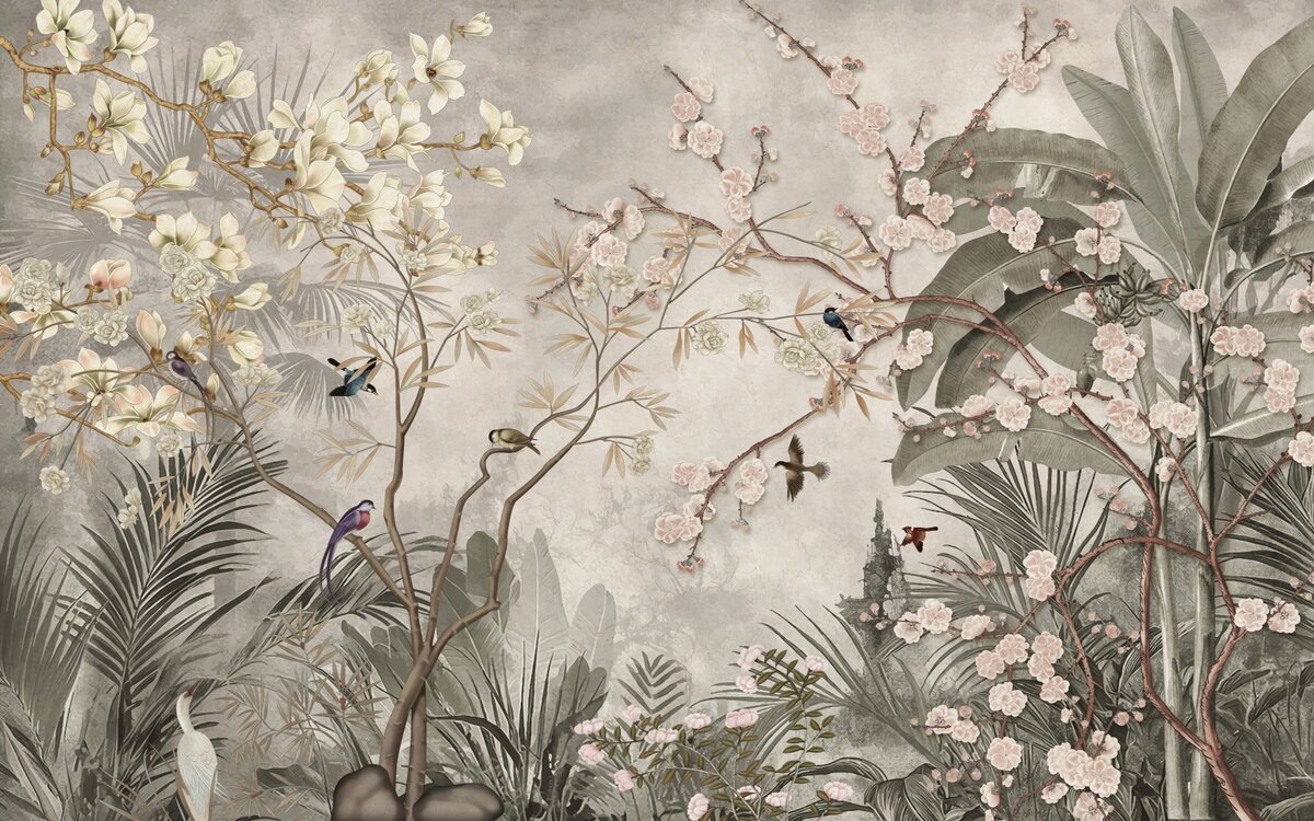 Fototapete: Vögel inmitten tropischem Dschungel und exotischen Blättern