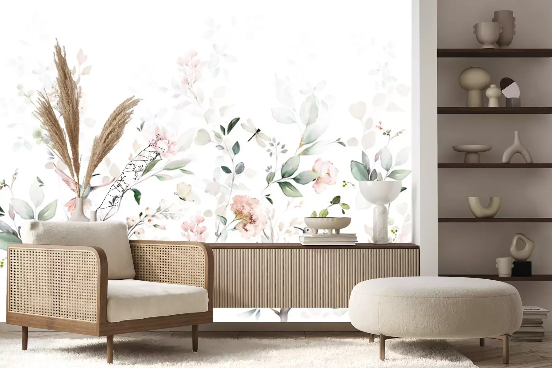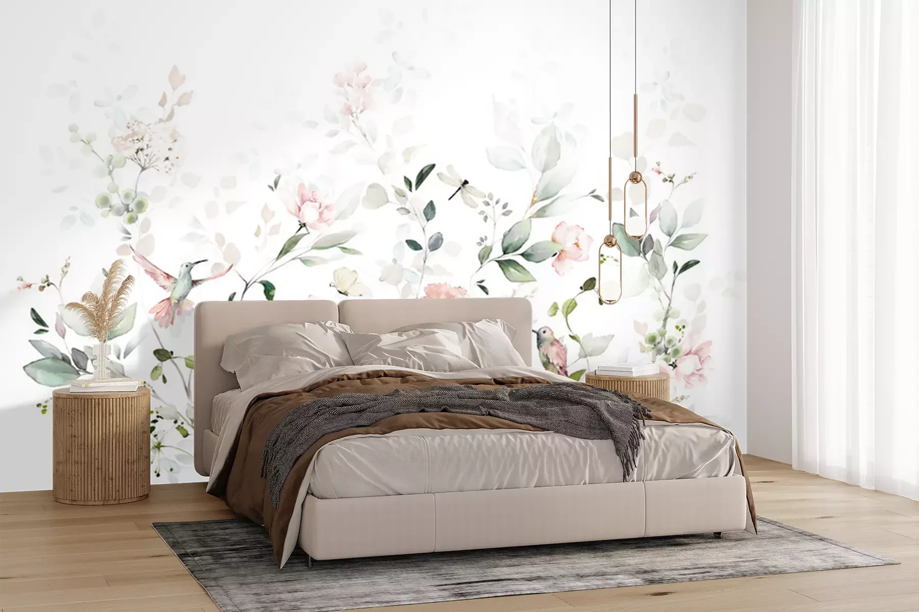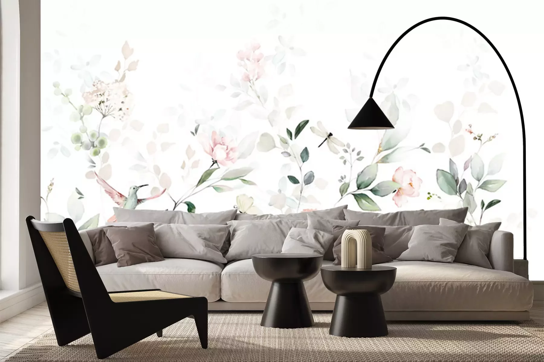 Fototapete Vögel inmitten von Aquarell-Zweigen auf weißem Hintergrund
