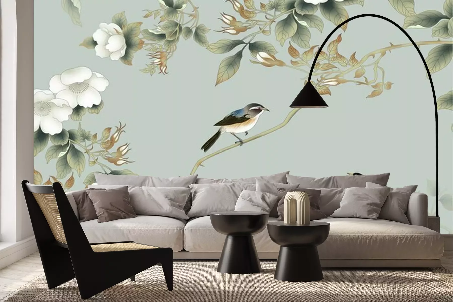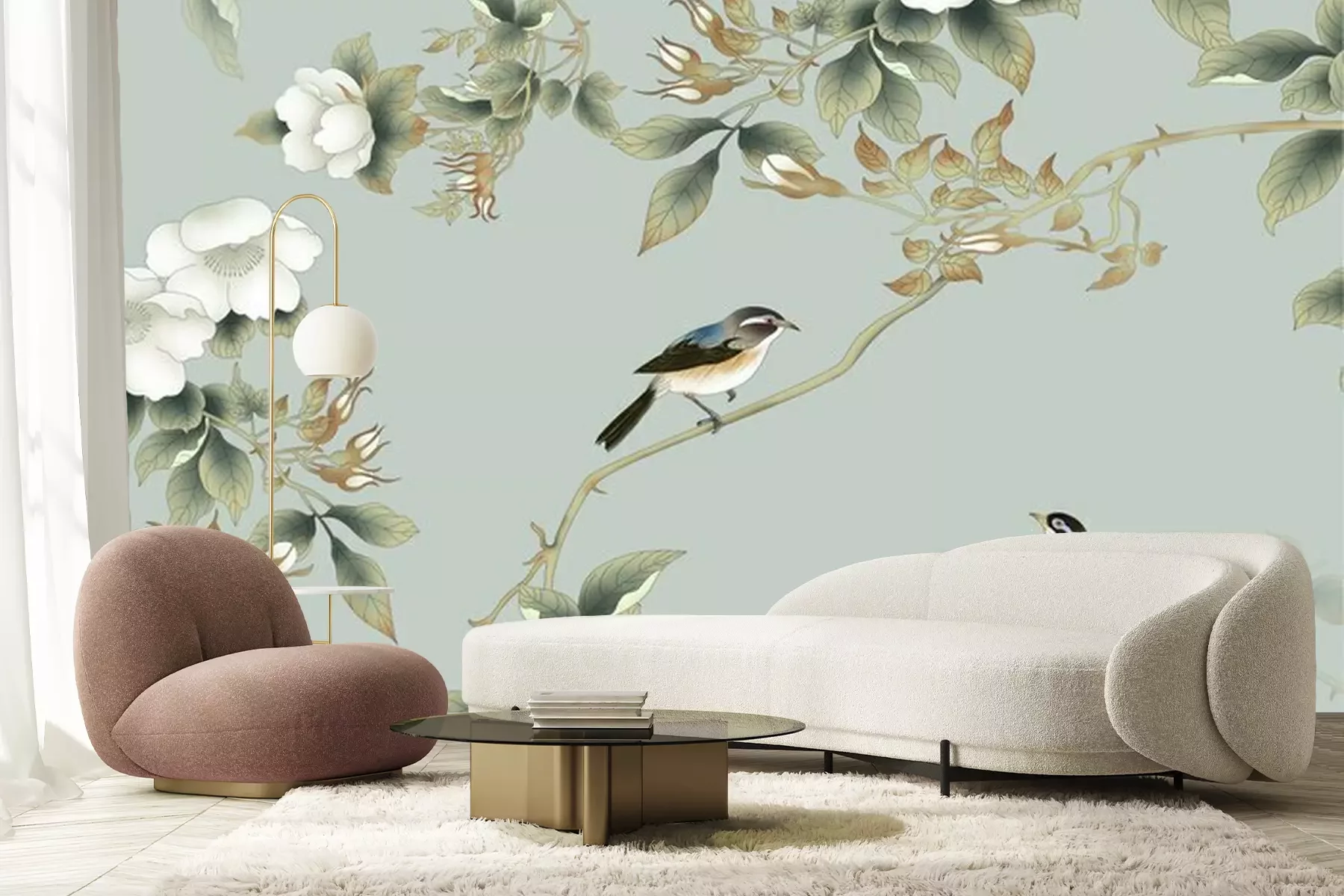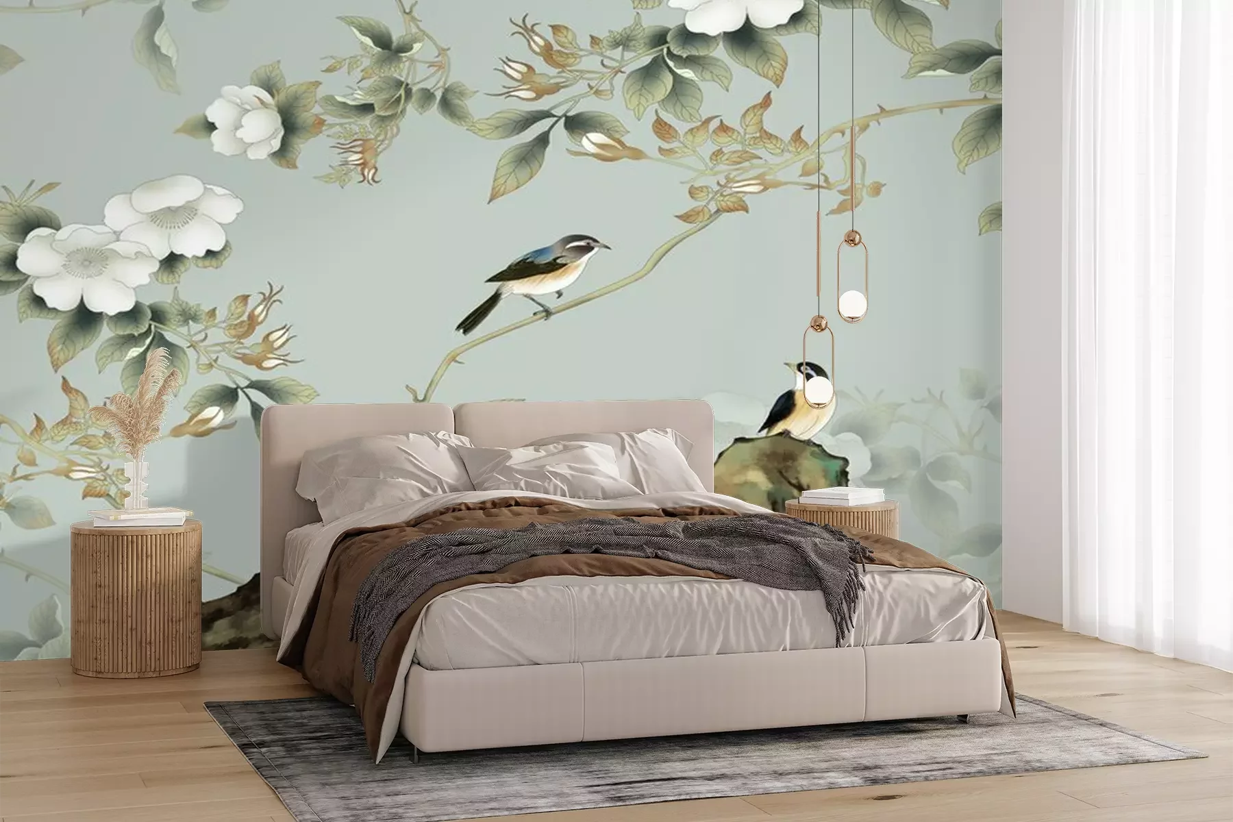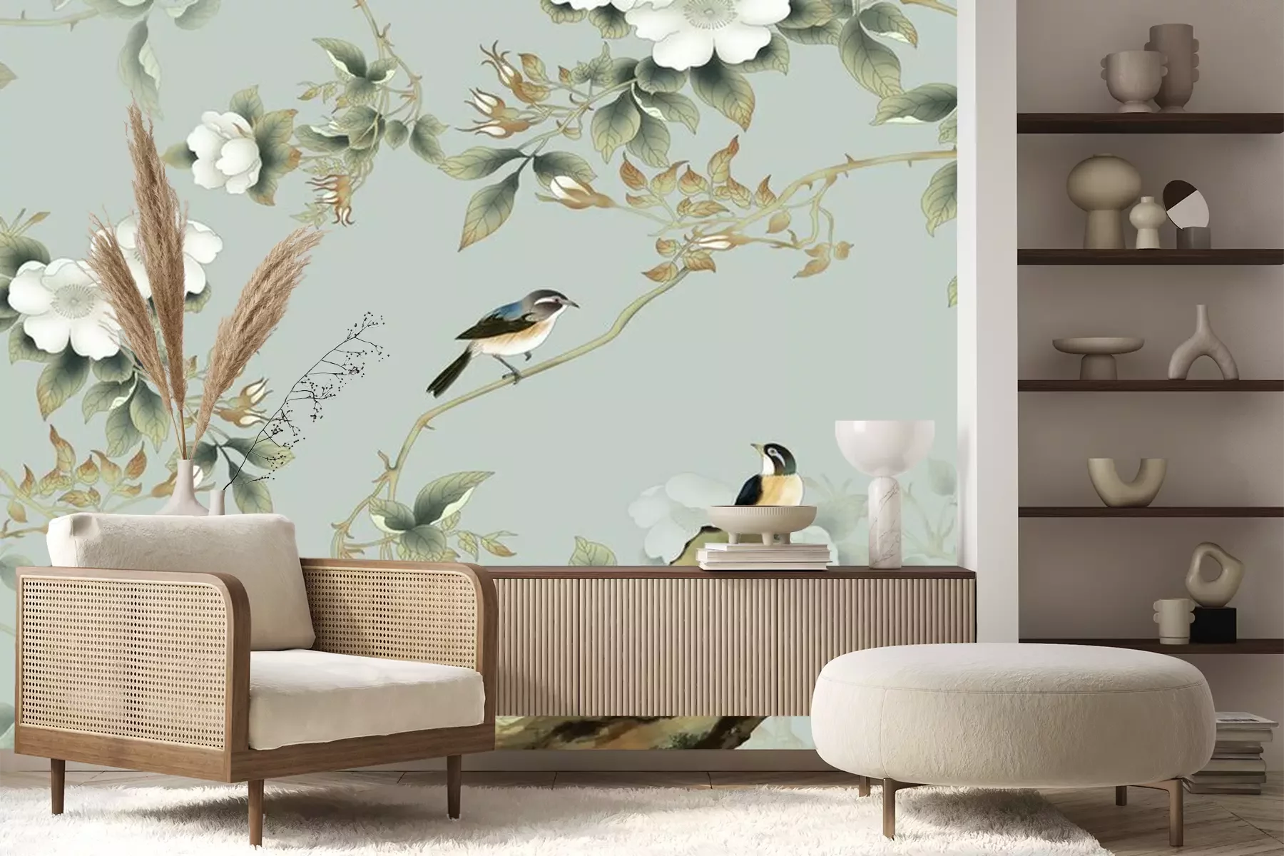 Fototapete Vögel sitzen auf Zweigen mit weißen Blüten