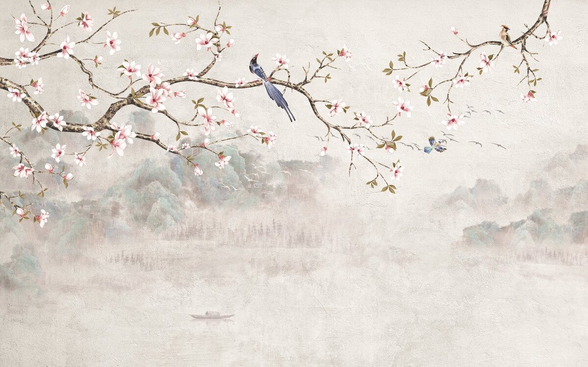 Fototapete: Vogel auf einem Kirschzweig vor Bergen und See