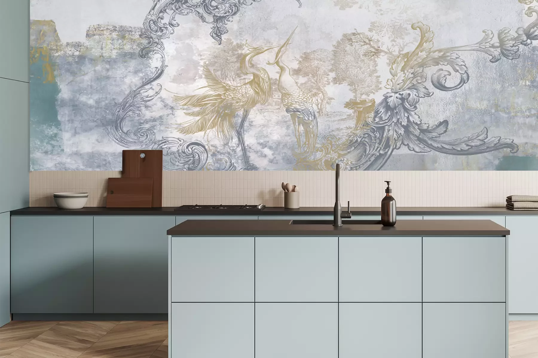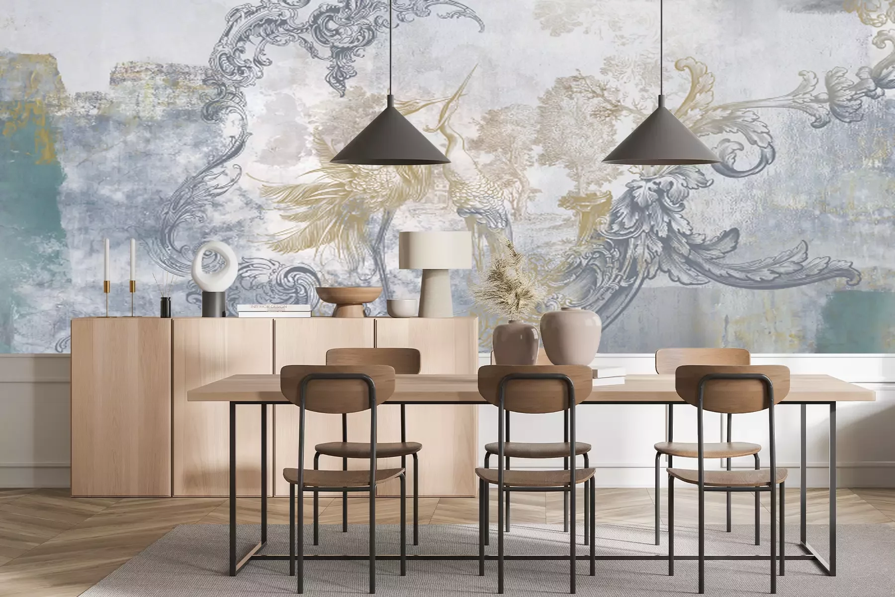 Fototapete Wall mural, wallpaper, in the style of classic, baroque, modern, rococo. Wall mural with birds and concrete grunge background. Light, delicate photo wallpaper design.