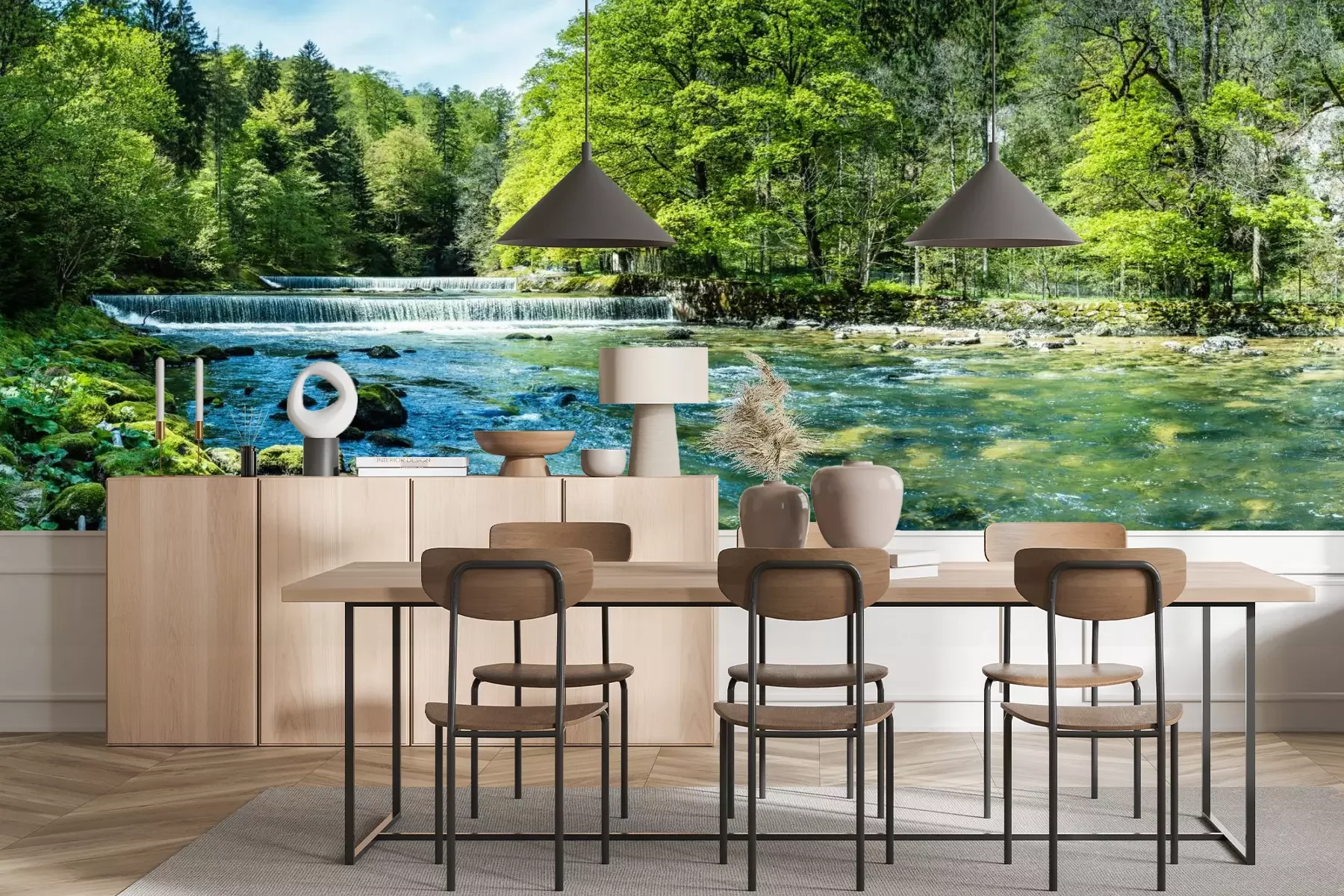 Das Material Premium+ besteht aus einer strukturierten Vinyl-Oberschicht und einem Trägermaterial (Vlies) mit einer Grammatur von 255 g/m², das kleine Unebenheiten der Wand zuverlässig kaschiert. Die feine Sandstruktur verleiht der Oberfläche eine luxuriöse Haptik, während das halbmatte Finish die Tiefe der Farben betont. Das Material ist dampfdurchlässig – so kann diese Fototapete auch in Küchen und Badezimmern eingesetzt werden. Die maximale Breite einer Tapetenbahn beträgt 100 cm. Bei größeren Abmessungen besteht die Fototapete aus mehreren gleich großen Bahnen. Der Kleber wird direkt auf die Wand aufgetragen, und die Fototapete wird auf Stoß angebracht, was für einen ästhetischen Effekt ohne sichtbare Fugen sorgt. Die Oberfläche ist pflegeleicht und kann bei Bedarf sanft mit einem feuchten Tuch abgewischt werden.