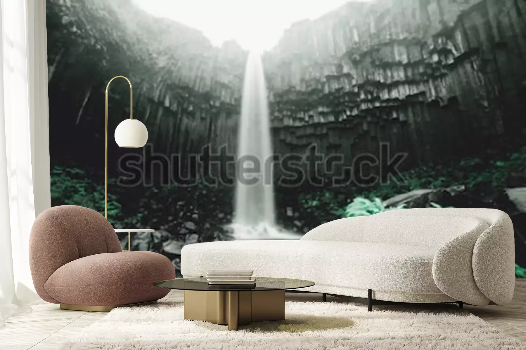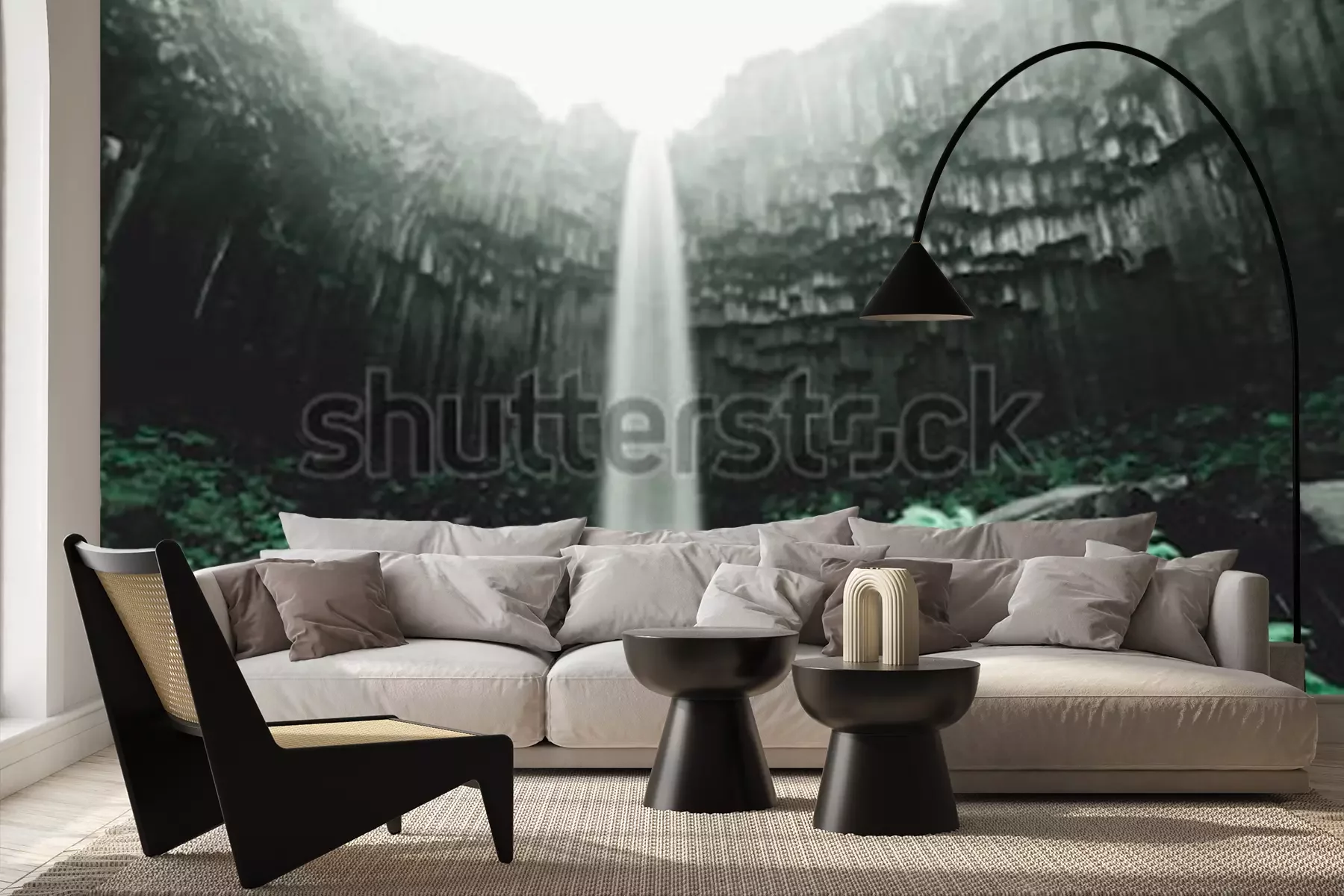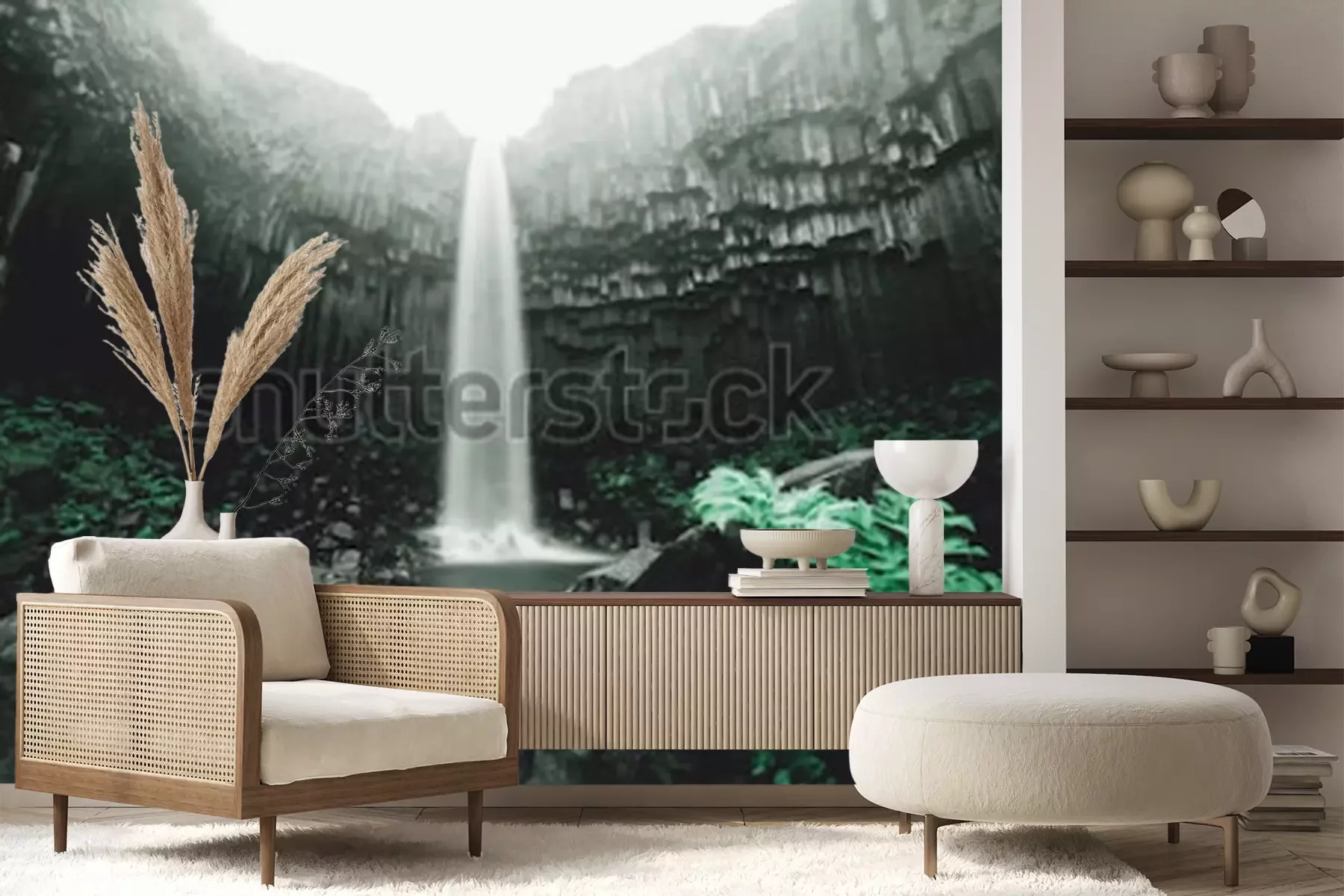 Fototapete Wasserfall in der Höhle und grüne Pflanzen