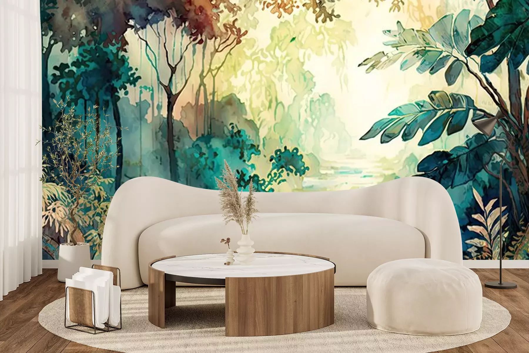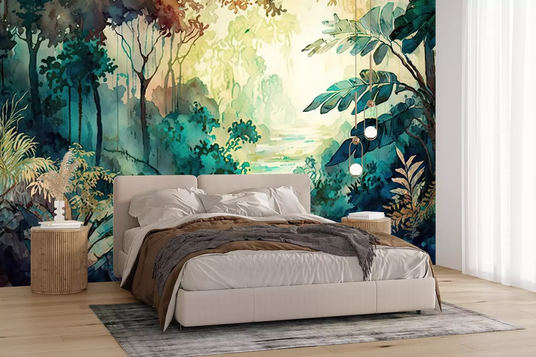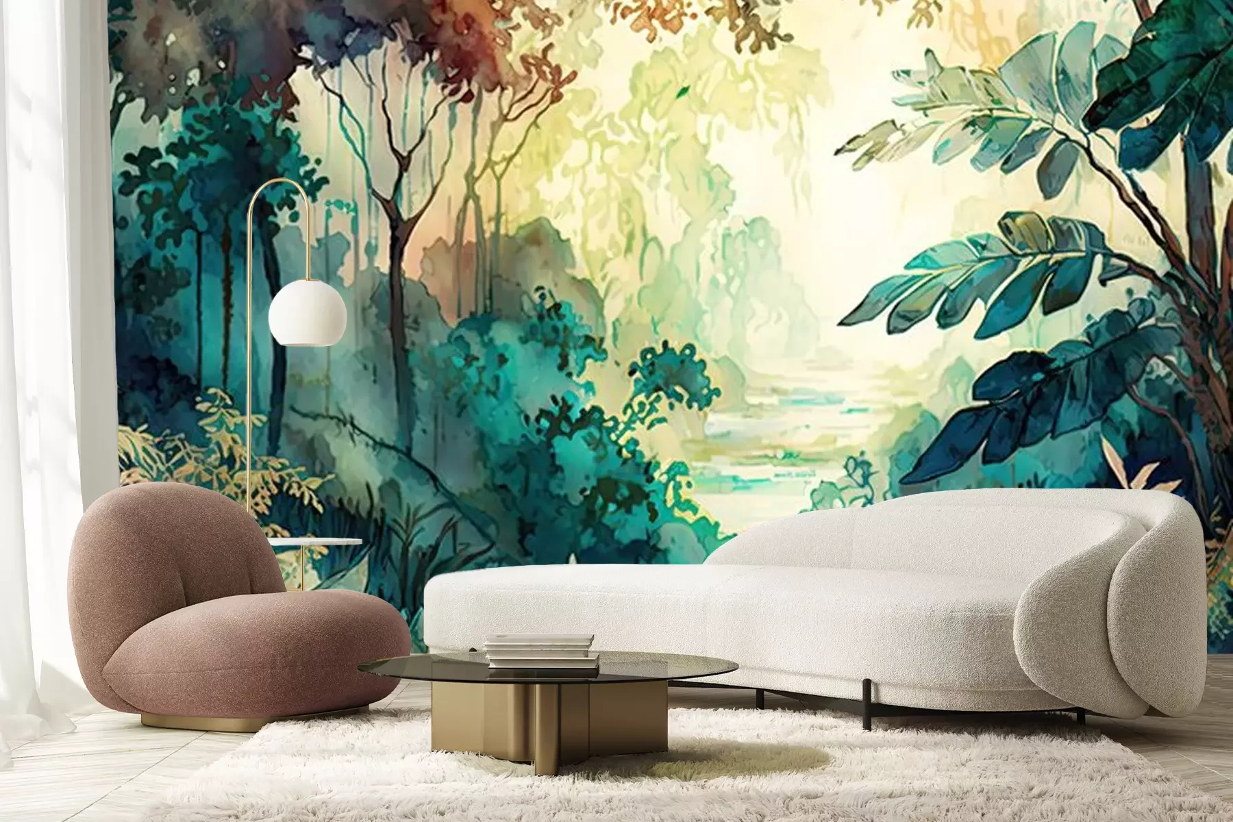 Fototapete Watercolor pattern wallpaper, digital painting of the Amazon forest landscape, generative AI