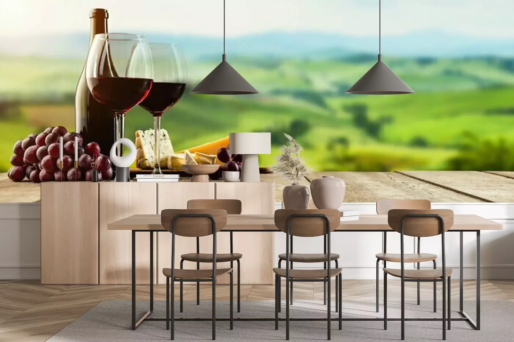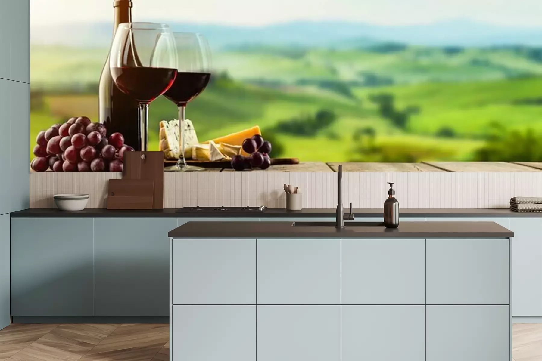 Fototapete Wein mit Käse auf Brettern
