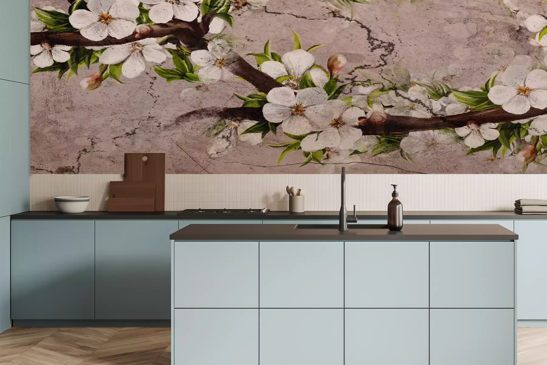 Weiße Magnolienblüte und Goldene BlätterWenn du davon träumst, dass die Einrichtung deiner Wohnung jeden Tag aufblüht, unabhängig von der Jahreszeit, entscheide dich für eine florale Fototapete. Blumen sind nicht nur Dekoration. Dank ihnen erhält die Einrichtung einen gemütlichen Charakter, und um dich herum erscheint die Natur, so dass dein Zuhause sich in deine private Oase der Ruhe verwandelt. Unsere Wahl fiel auf zarte, weiße Blumen. Fototapete mit einem solchen Muster lässt sich sehr leicht arrangieren, da sie zu sehr unterschiedlichen Stilen und Räumen passt. Beginnen wir mit den Merkmalen unserer Fototapete mit Blumen. Die Zweige blühender Kirschbäume sind vor einem Hintergrund aus gerissenem Beton dargestellt. Diese Kombination eines zarten pflanzlichen Motivs und einer rohen Textur erzeugt einen äußerst interessanten Effekt. Die Dekoration kann sowohl in einer eleganten als auch in einer industriellen Einrichtung, in einem gemütlichen Styling und in einem minimalistisch eingerichteten Raum verwendet werden. Eine solche Blumen-Fototapete passt sich der Umgebung an wie ein Chamäleon und hebt den Aspekt der Einrichtung hervor, der für dich wichtiger ist. Dies lässt sich am besten anhand einiger Gestaltungsbeispiele zeigen. Es ist eine hervorragende Wahl für ein Wohnzimmer im asiatischen Stil. Wenn im Raum japanische Akzente vorhanden sind, wie z.B. ein Papier-Paravent und Reproduktionen von Holzschnitten an den Wänden, setze auf die wunderbare Ergänzung des Ganzen, d.h. eine solche Fototapete. Weiße Blümen auf den Zweigen spielen auf das Symbol dieses Landes an. Aufgrund des gerissenen Betons ist es ein Muster, das auch in einem modernen, industriellen oder minimalistischen Wohnzimmer gut funktioniert. Die Pflanzen durchbrechen die asketische Atmosphäre des Interieurs, betonen aber gleichzeitig seinen zeitgenössischen Charakter. Gerissener Beton, der auf das Vergehen der Zeit hinweist, ist auch ein Motiv, das sowohl zu einem rustikalen als auch zu einem im Vintage-Stil eingerichteten Interieur passt. Dies ist eine interessante Einsatzmöglichkeit für eine solche Fototapete. Blumen werden nicht zu einem kitschigen Akzent, sondern zu einem Element, das dem Ganzen Ausdruck verleiht. Und zu welchen Accessoires passt eine solche Fototapete? Blätter tropischer Pflanzen – Monsterae und Palmen – sind eine großartige Idee. Stelle große Topfpflanzen in den Raum oder hänge Poster mit Blätter-Kompositionen an die Wände.