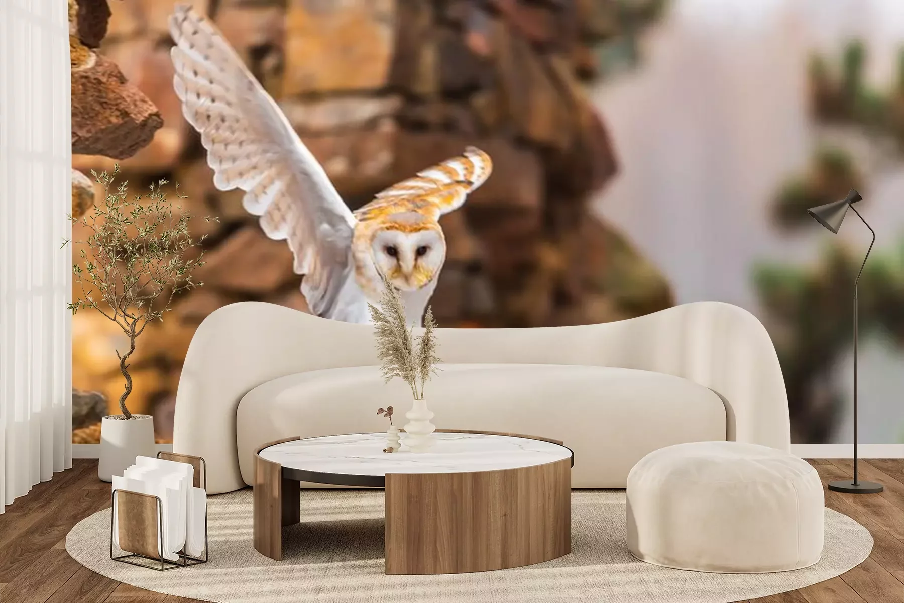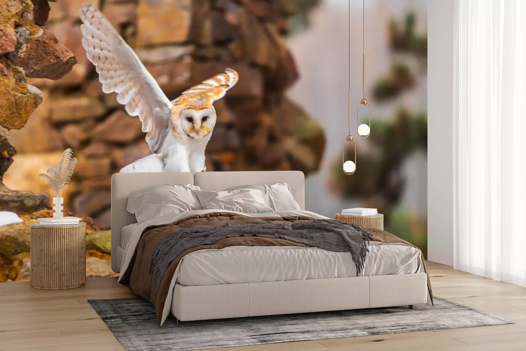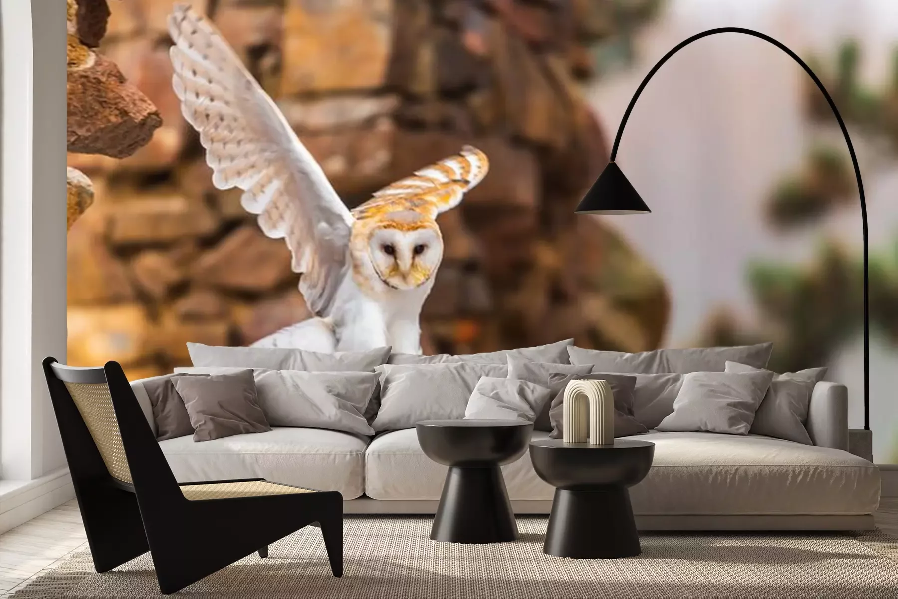 Fototapete Weiße Eule mit Steinen im Hintergrund