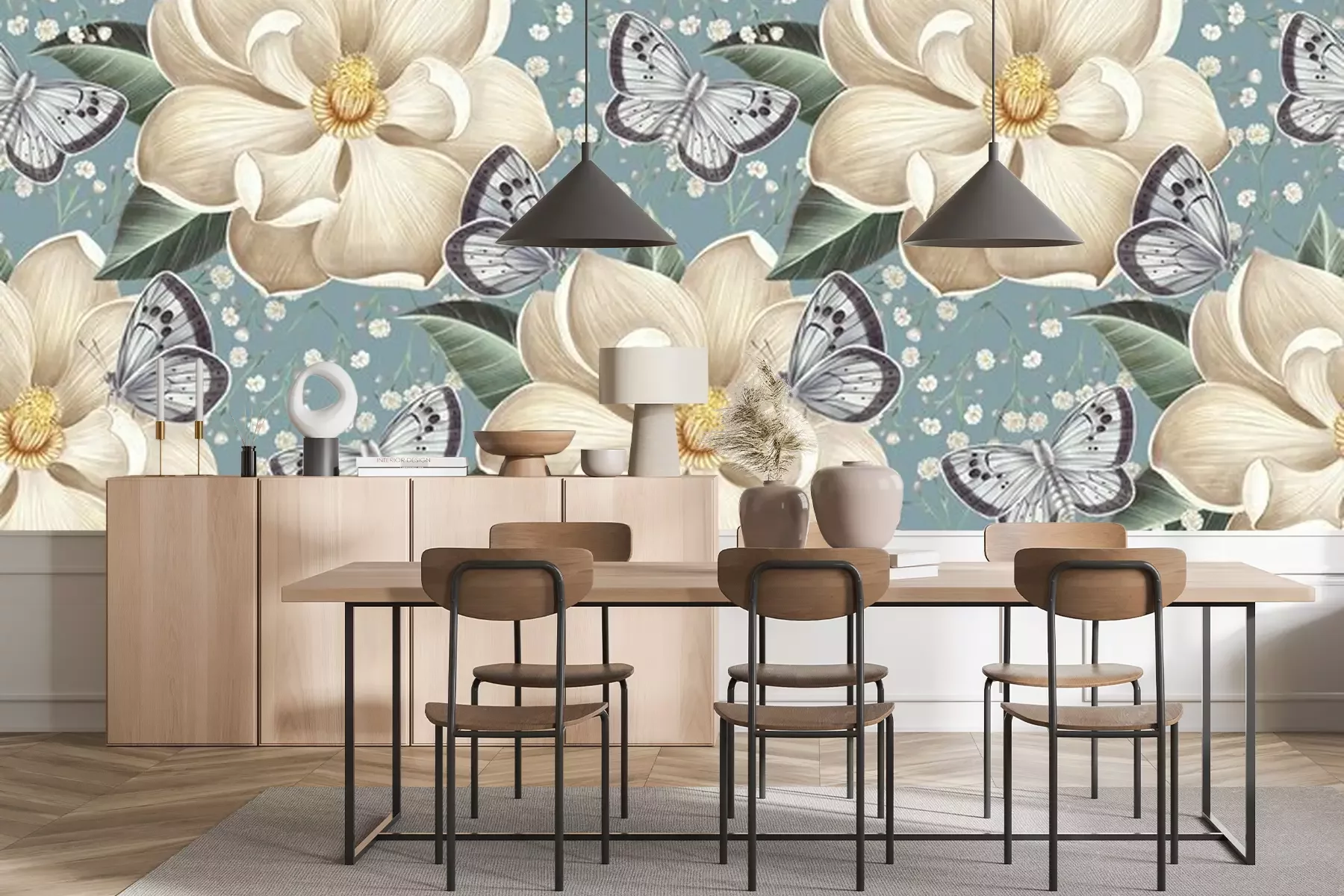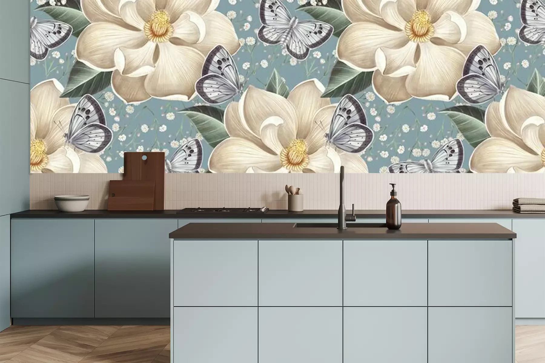 Fototapete Weiße Frühlingsblumen und Schmetterlinge