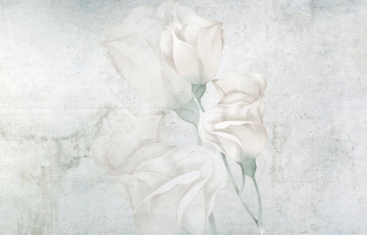 Fototapete: Weiße Rosenblüten auf Betonhintergrund