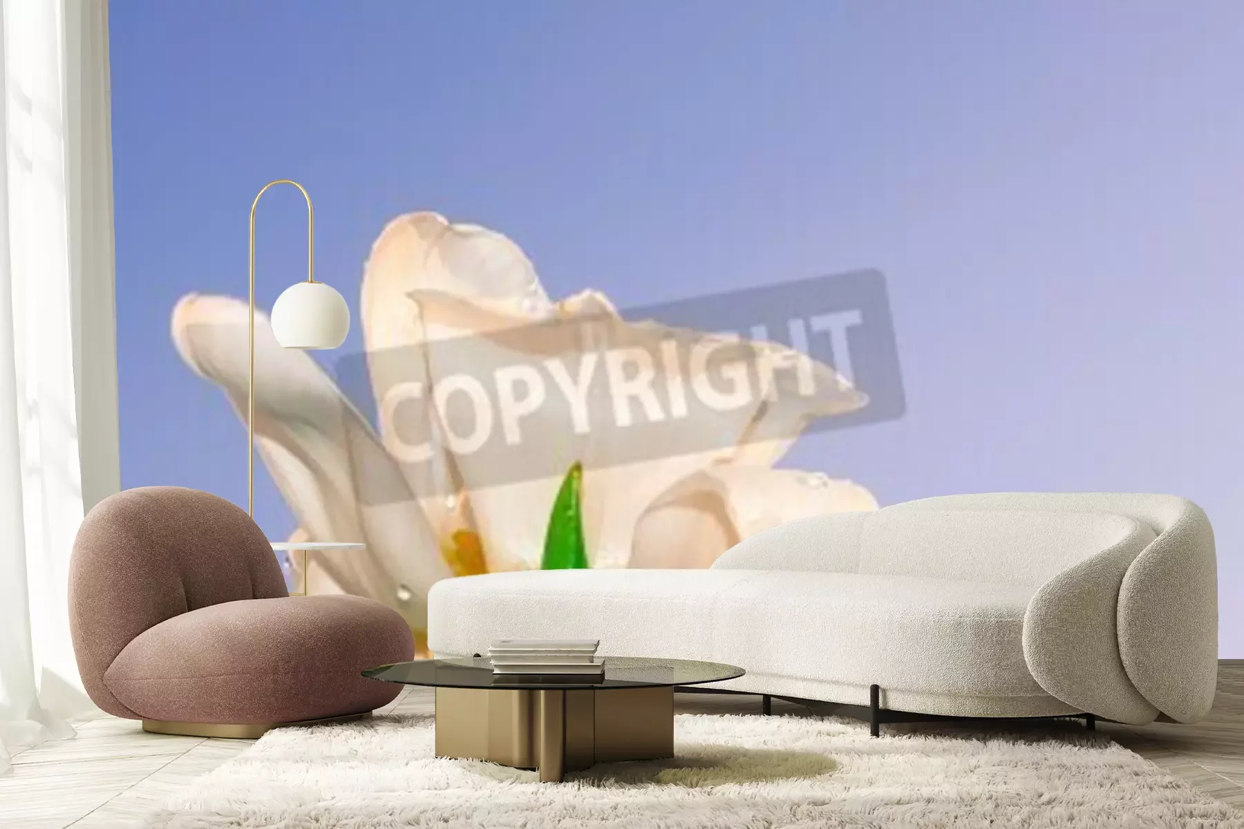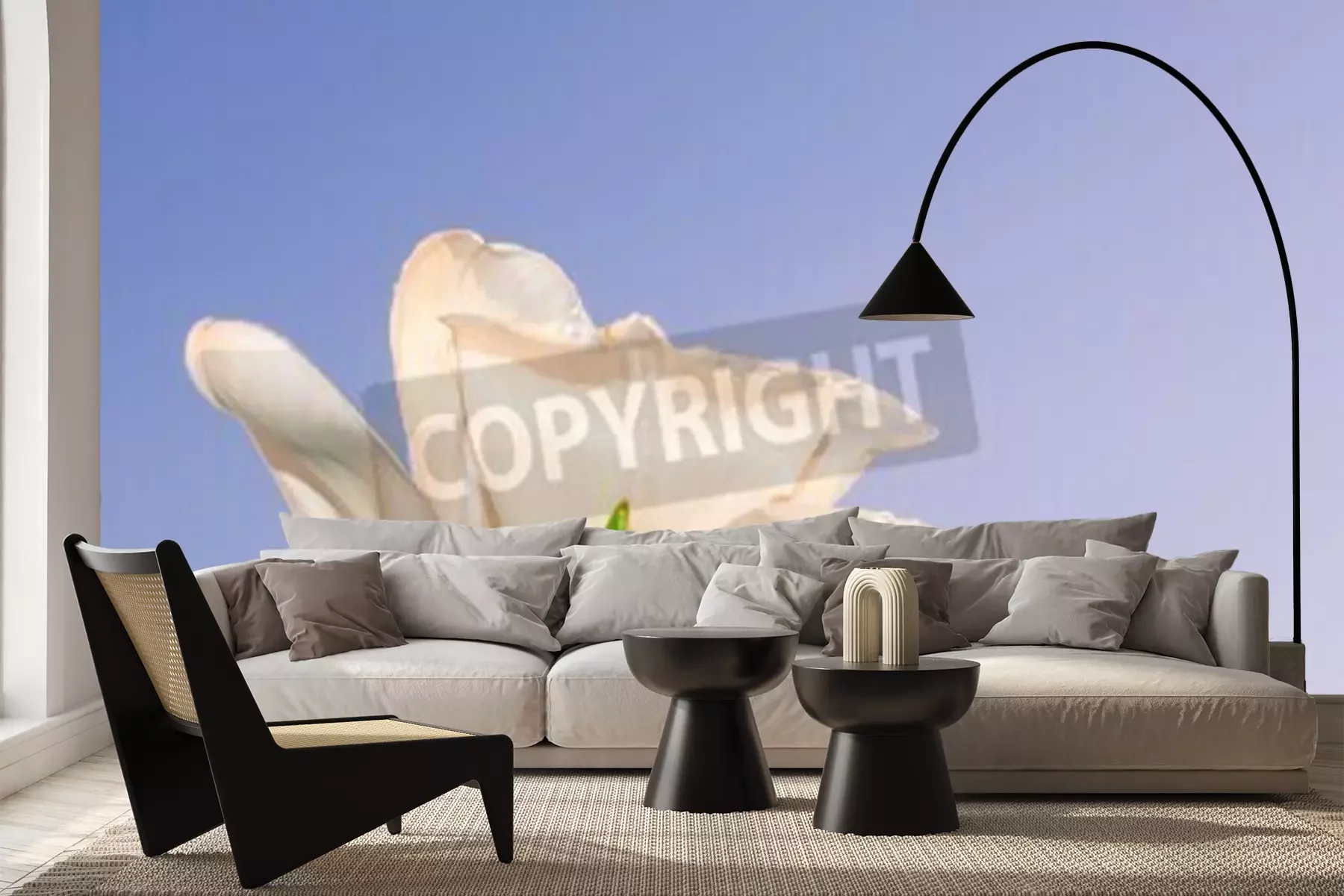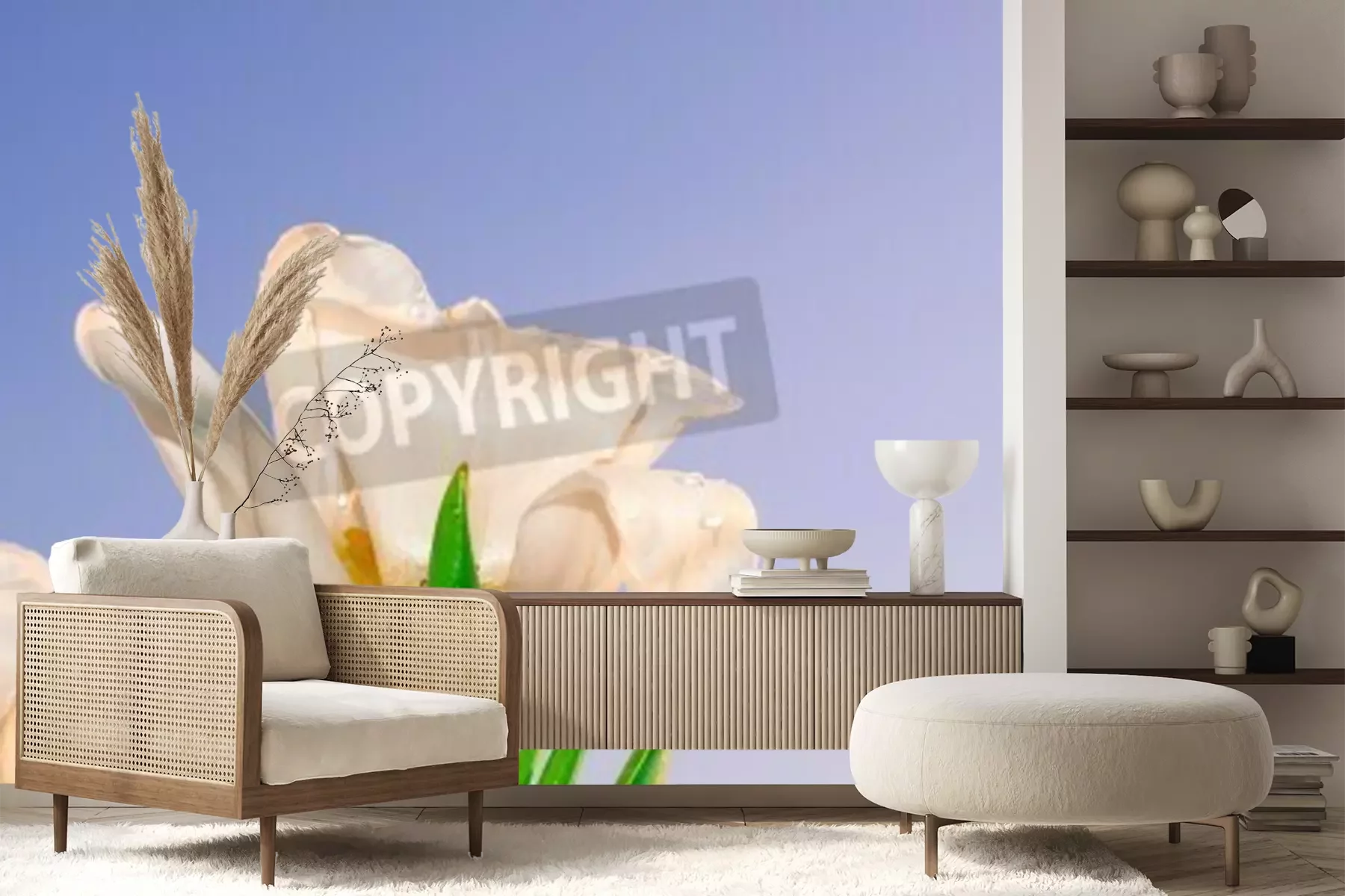 Fototapete Weiße Tulpen mit Himmel im Hintergrund
