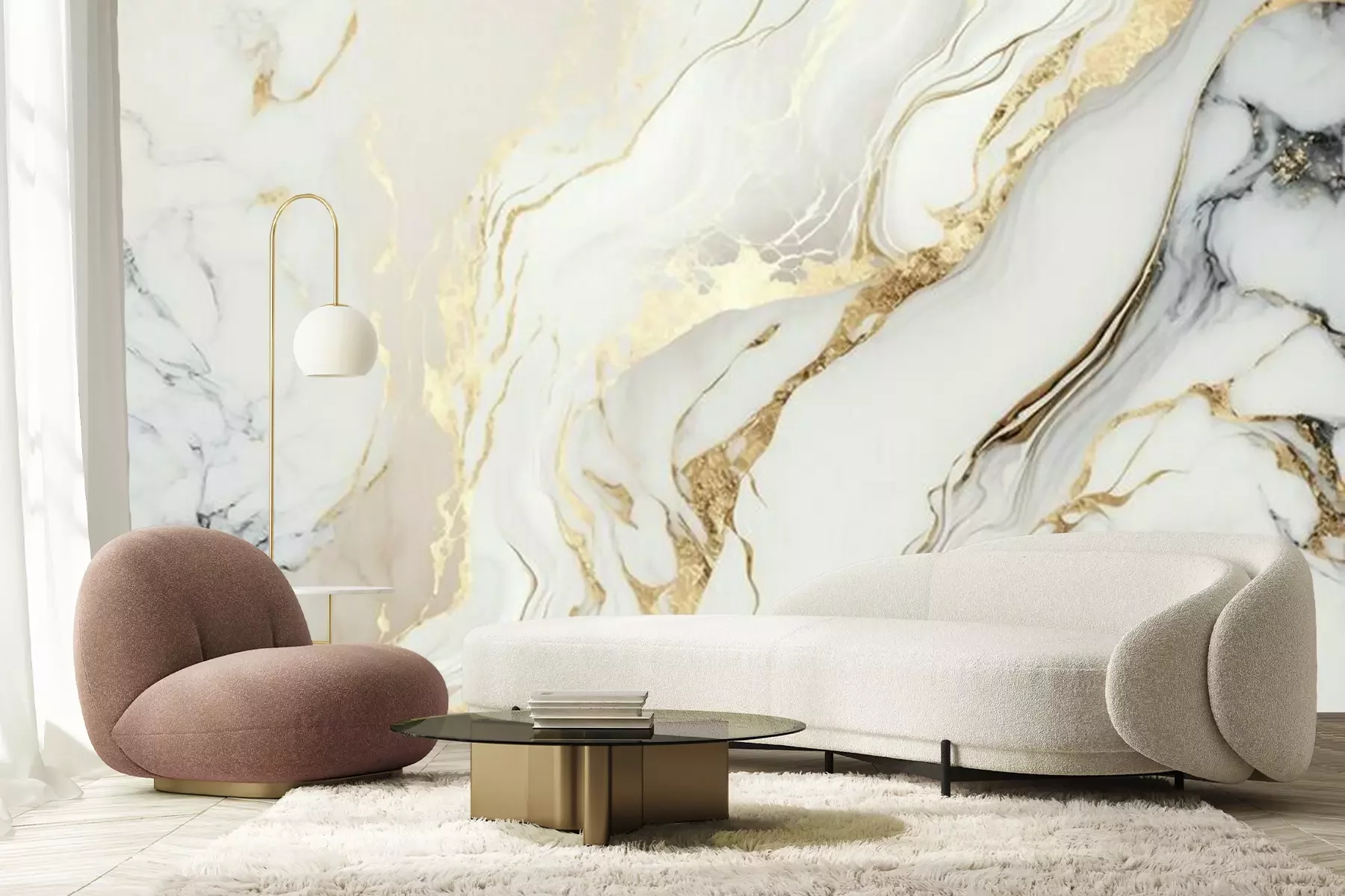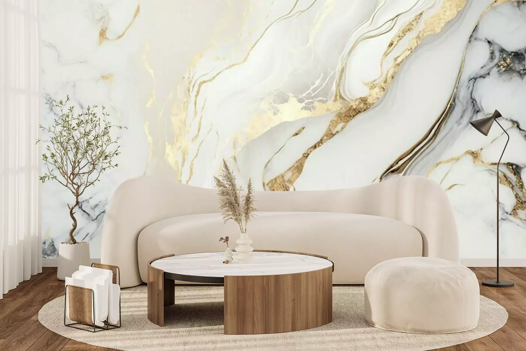 Weißer Marmor mit goldenen und grauen AdernEs ist gar nicht so schwer, Ihrem Wohn- oder Schlafzimmer einen neuen Look zu verpassen. Wählen Sie einfach das richtige Muster für Ihre Fototapete. Marmorimitation ist eine hervorragende Wahl für alle, die eine elegante Dekoration für moderne, stilvolle Innenräume suchen. Unsere Fototapete, die aus hochwertigen Materialien hergestellt wird, besticht durch ihre Detailtreue – goldene und schwarze Strukturen, die sanft in Grautöne übergehen. Dank dieser Präzision ist die Marmorimitation kaum von echtem Stein zu unterscheiden. Anstelle eines teuren Naturmaterials können Sie sich für eine ebenso beeindruckende Alternative entscheiden: eine Fototapete. Marmor Weiß, veredelt mit goldenen Details, verleiht dem Raum Eleganz und ein luxuriöses Ambiente. Dieses Motiv betont perfekt den Charakter eines modernistischen Schlafzimmers in gedämpften Grautönen. Es harmoniert ebenso gut mit Schwarz, Naturholz und goldenen Akzenten. Wenn dieser Stil auch zu Ihrem Arbeitszimmer passt, ergänzen Sie ihn stilvoll mit einer Fototapete. Weißer Marmor ist die ideale Wahl für ein edles, arbeitsfreundliches Ambiente. Eine helle Wandgestaltung überfordert auch kleine Räume nicht – im Gegenteil, sie hellt diese auf und lässt sie geräumiger und luftiger wirken. Um diesen Effekt zu erzielen, lohnt es sich, auf unser maßgefertigtes Produkt zu setzen. Die Fototapete lässt sich mühelos an der gewünschten Wand anbringen, ohne Blasenbildung – das verwendete Material gewährleistet eine einfache Installation und perfekte Haftung. Aus diesem Grunde können Sie unsere Dekoration bedenkenlos auch in repräsentativen Räumen wie dem Wohnzimmer einsetzen. Unsere Fototapete Marmorimitation ergänzt perfekt eine Einrichtung im Art-déco-Stil und verleiht dem Raum eine fast kunstvolle Wirkung. Das steinähnliche Muster kann verwendet werden, um eine harmonische, helle Umgebung zu schaffen oder als Kontrast zu schwarzen Möbeln. Der hochwertige Druck ist farbbeständig, so dass die Wanddekoration über lange Zeit eine eindrucksvolle Ausschmückung bleibt. Zudem lässt sich die Oberfläche leicht reinigen und ist kratz- und abriebfest. Der vorgeschlagene Stil fügt sich auch wunderbar in glamouröse Interieurs ein. Vor der dekorativen Wand kann eine dunkle Couchgarnitur eindrucksvoll in Szene gesetzt werden. Die weiße Marmoroptik harmoniert hervorragend mit Schwarz, Marineblau oder Flaschengrün. Auch eine helle Wohnlandschaft in Grau-, Cappuccino- oder Cremetönen passt perfekt zu diesem eleganten Muster der Fototapete. Marmor Weiß ist vielseitig einsetzbar und verleiht den unterschiedlichsten Räumen eine exklusive Note. Wenn Sie also nach einem Motiv suchen, das Eleganz mit Vielseitigkeit verbindet, ist eine Marmorimitation das ideale Motiv für Ihre Fototapete. Weißer Marmor eignet sich nicht nur für stilvolle Wohn-, Büro- und Schlafräume, sondern auch als edles Gestaltungselement für Badezimmer, Flure und Küchenwände.