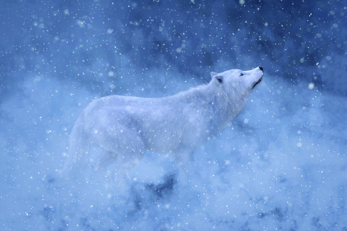Fototapete: Weißer Wolf umgeben von einer Winterlandschaft