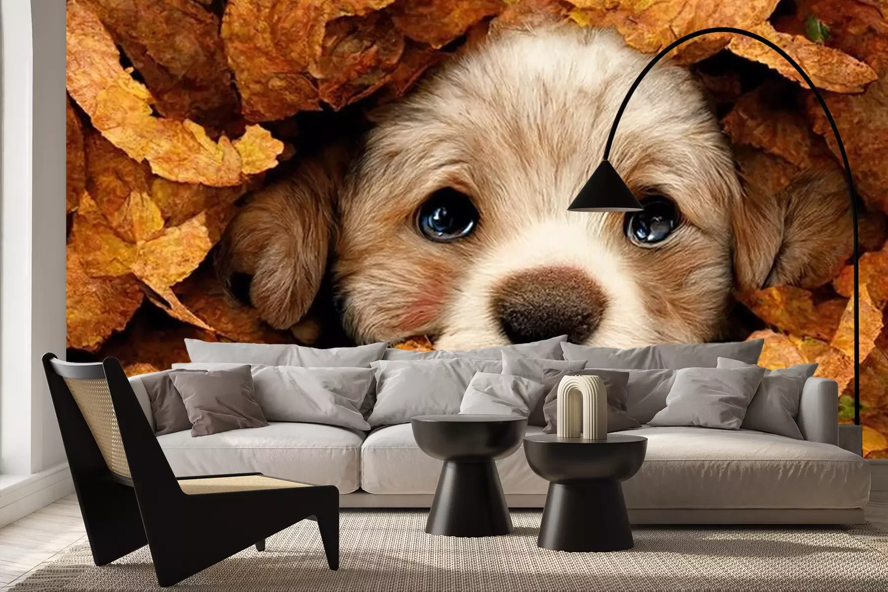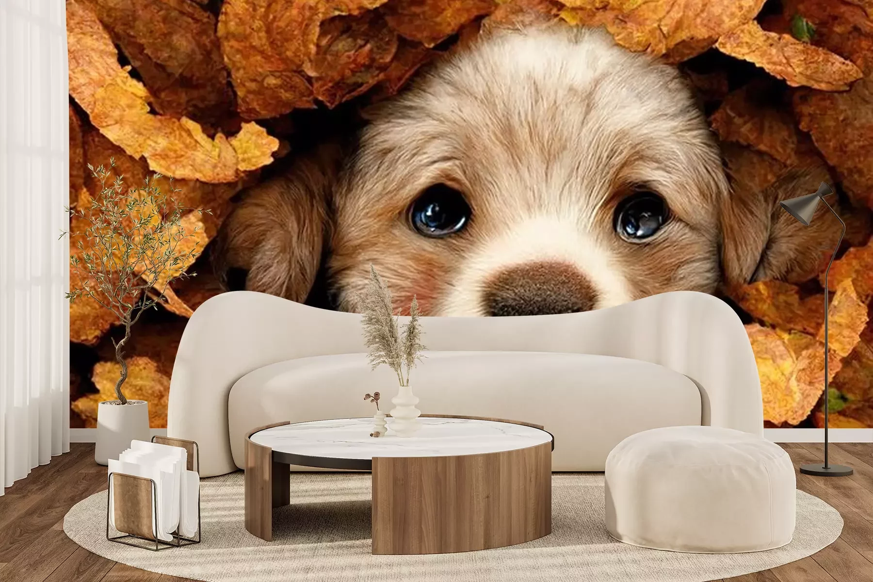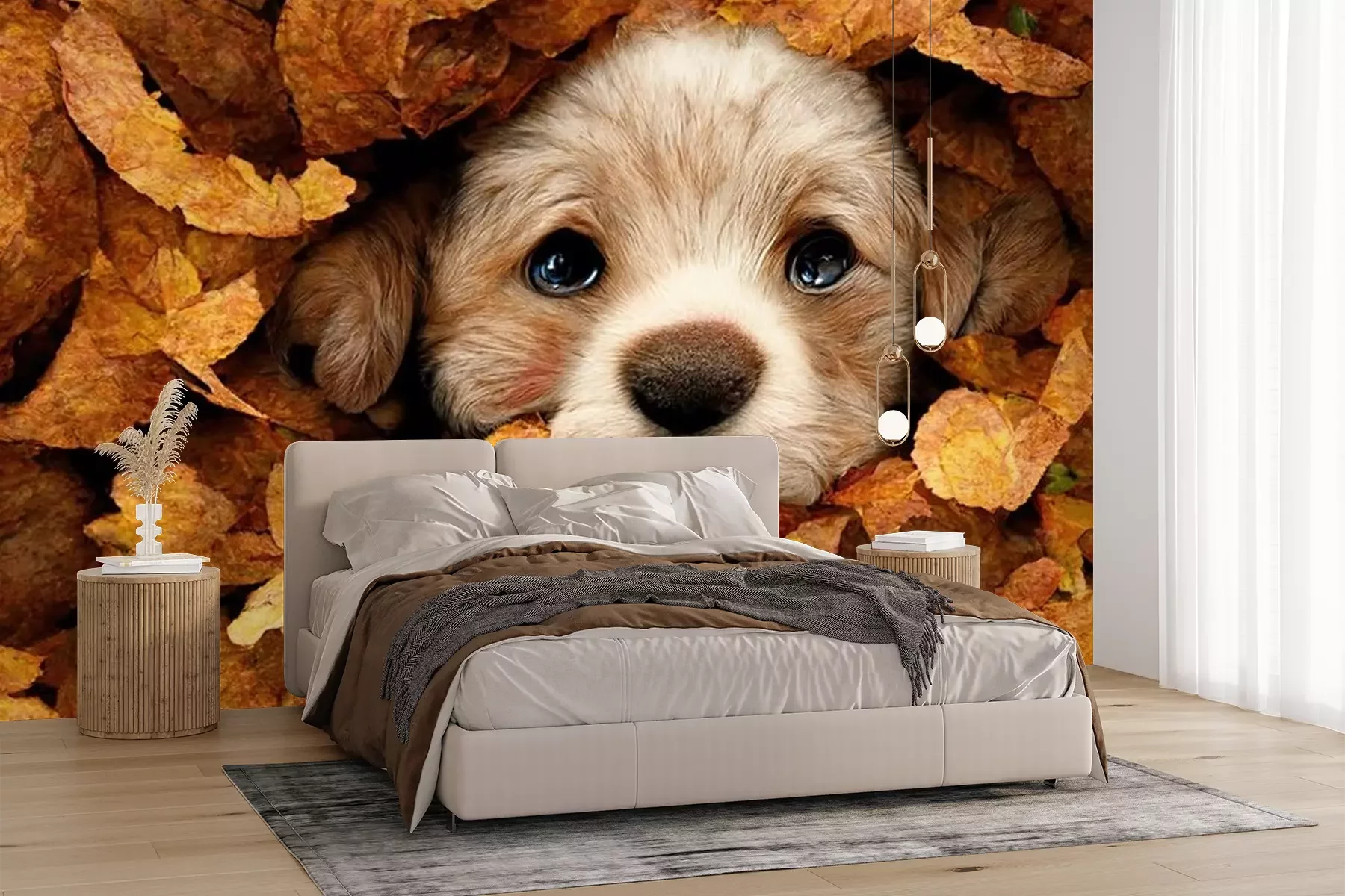 Fototapete Welpe spielt in einem Haufen Herbstblätter