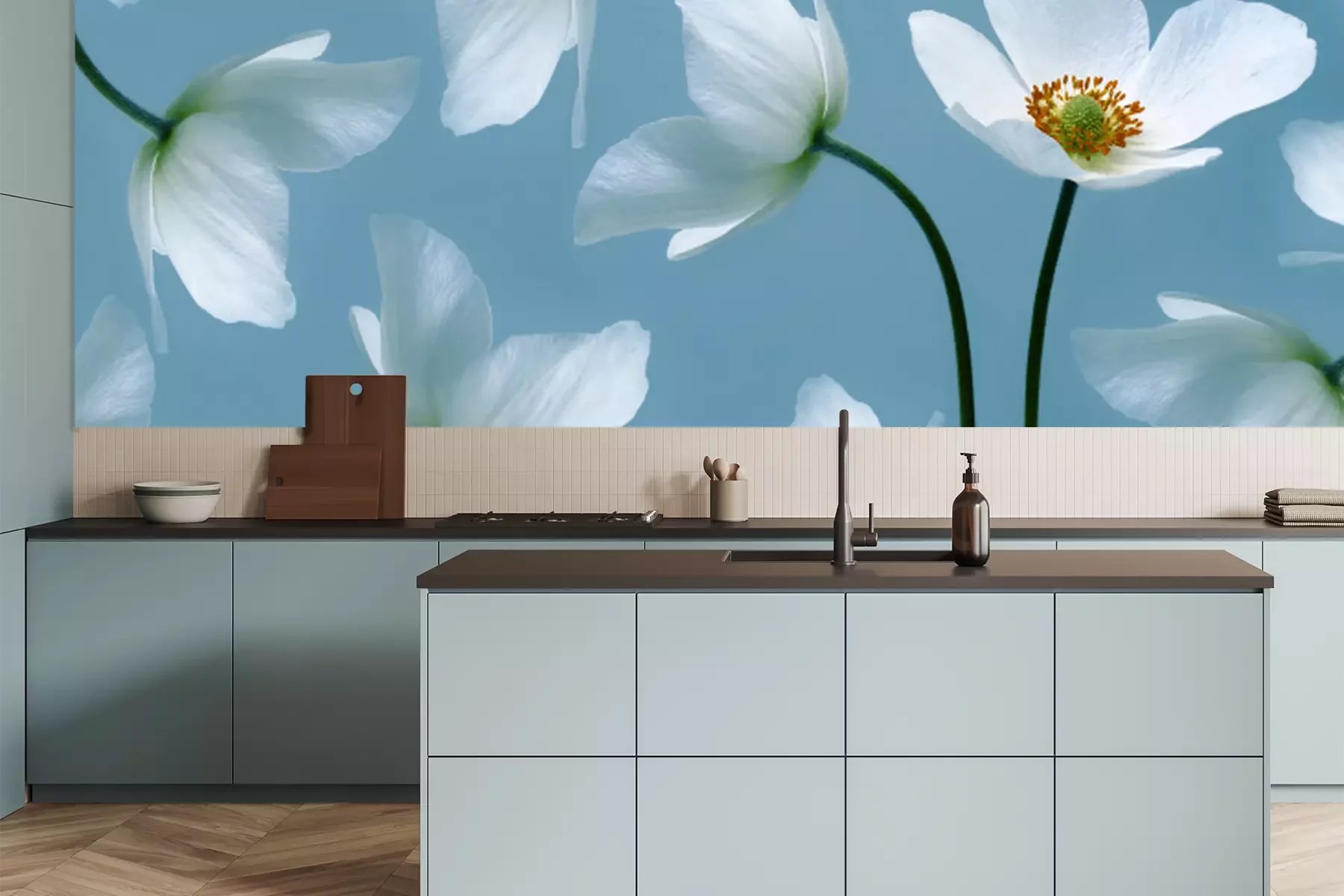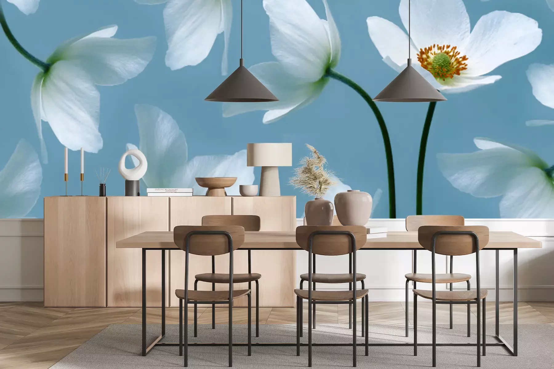 Fototapete White beautiful primrose. Flowers on a green stem. Studio shot. Nature.