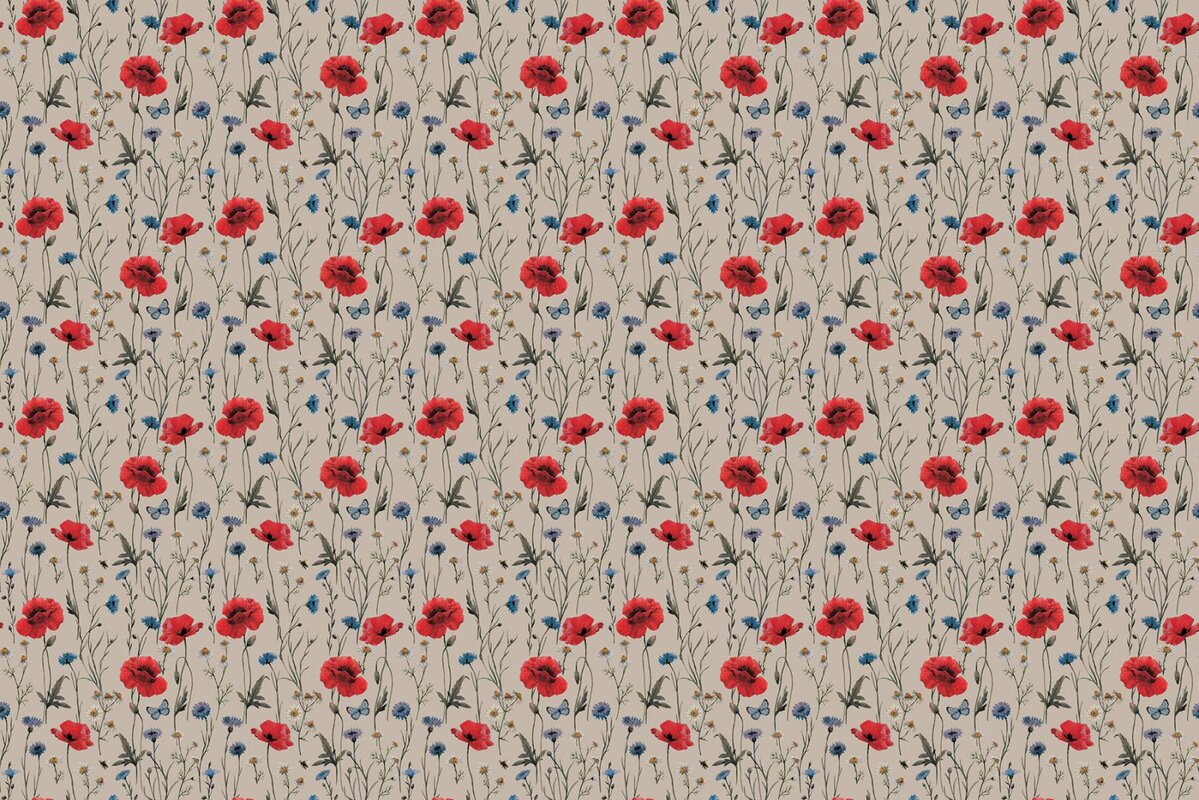Fototapete: Wildblumen, Mohnblumen, Kornblumen und blaue Schmetterlinge, natürliches botanisches Muster