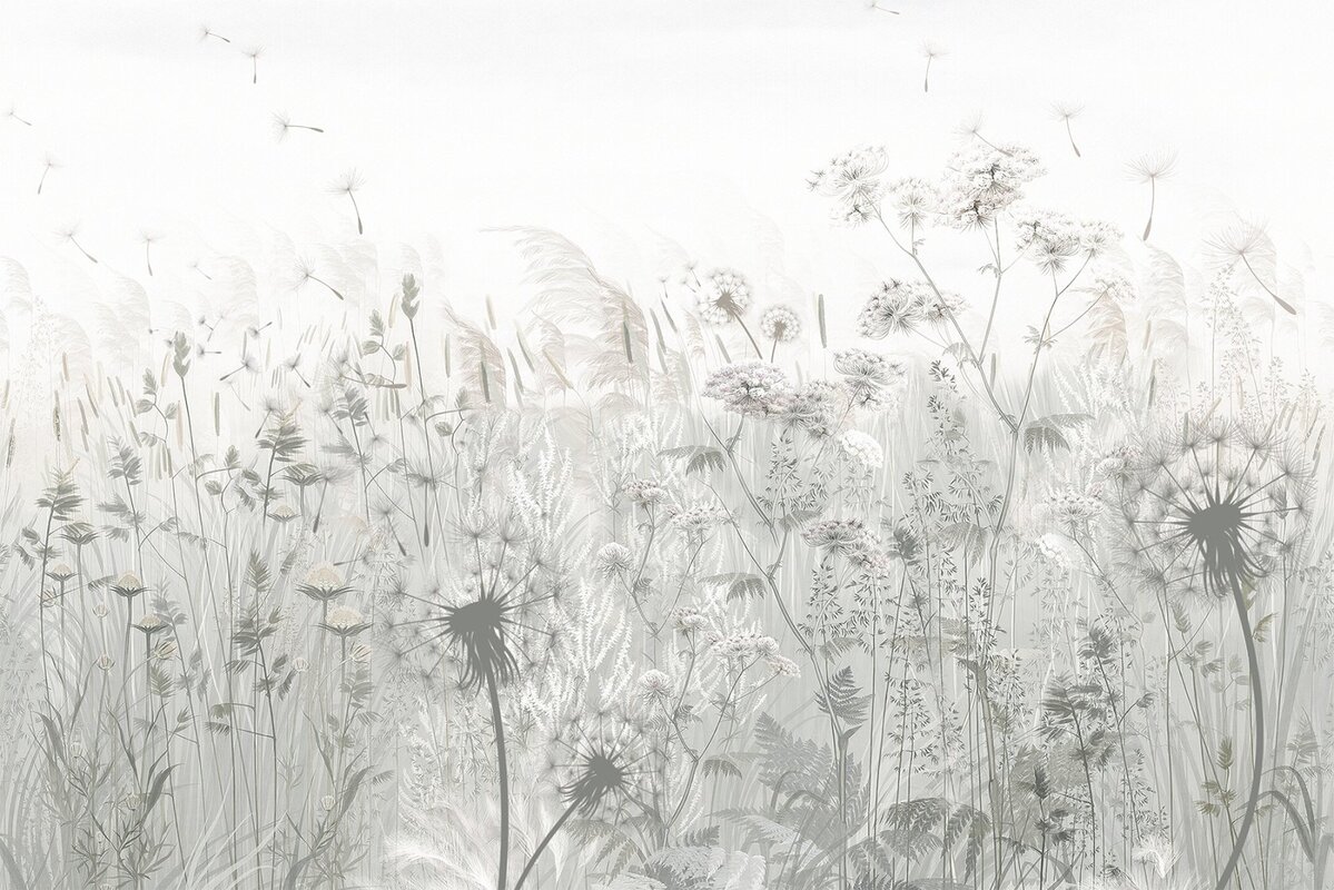 Fototapete: Wildblumen und Löwenzahn, botanisches Pflanzenmotiv in Grautönen