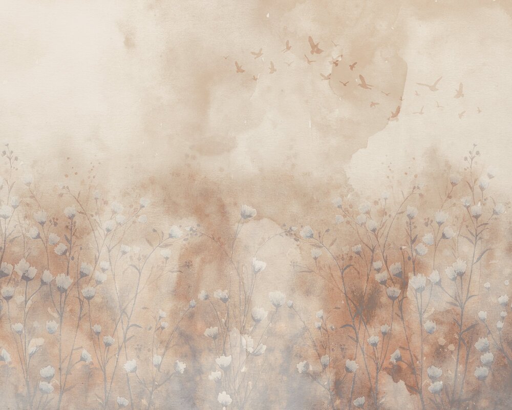 Fototapete: Wildblumen und Vögel Aquarell Landschaft
