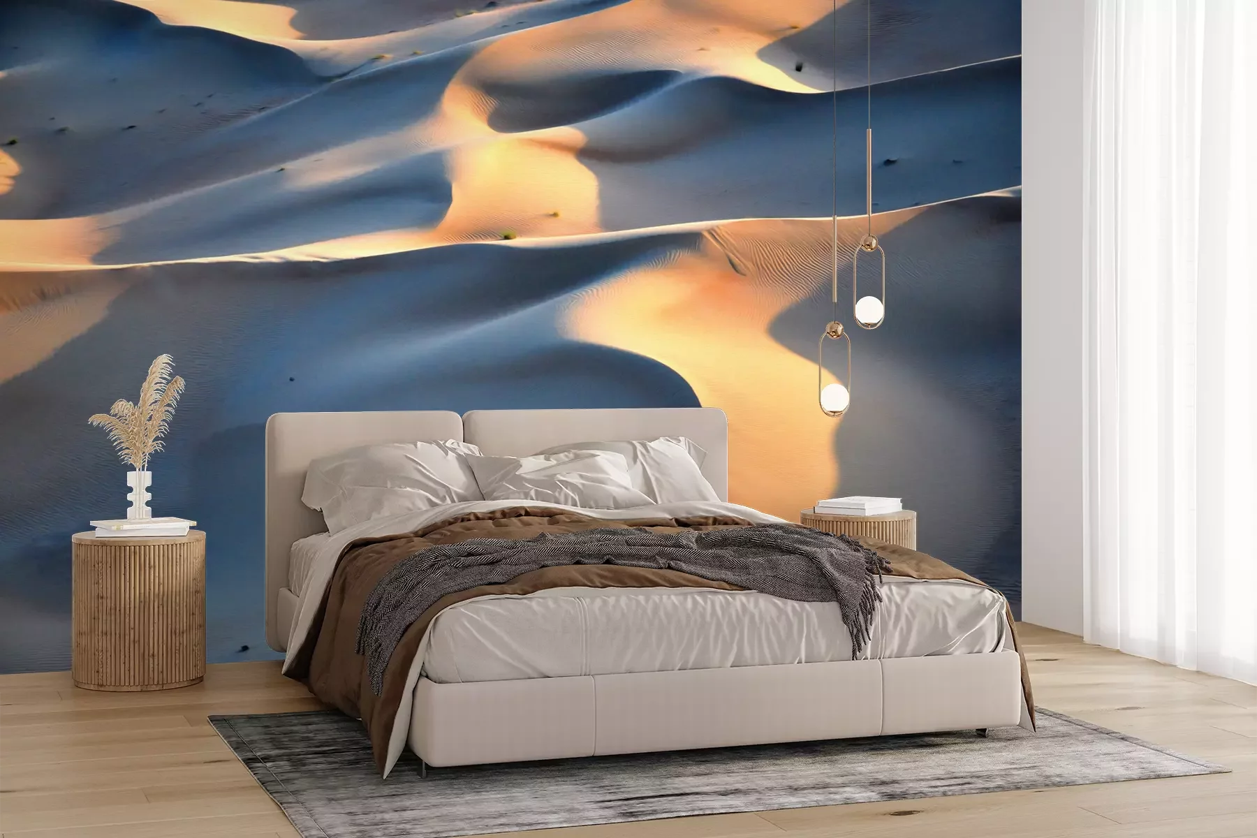 Das Material Premium+ besteht aus einer strukturierten Vinyl-Oberschicht und einem Trägermaterial (Vlies) mit einer Grammatur von 255 g/m², das kleine Unebenheiten der Wand zuverlässig kaschiert. Die feine Sandstruktur verleiht der Oberfläche eine luxuriöse Haptik, während das halbmatte Finish die Tiefe der Farben betont. Das Material ist dampfdurchlässig – so kann diese Fototapete auch in Küchen und Badezimmern eingesetzt werden. Die maximale Breite einer Tapetenbahn beträgt 100 cm. Bei größeren Abmessungen besteht die Fototapete aus mehreren gleich großen Bahnen. Der Kleber wird direkt auf die Wand aufgetragen, und die Fototapete wird auf Stoß angebracht, was für einen ästhetischen Effekt ohne sichtbare Fugen sorgt. Die Oberfläche ist pflegeleicht und kann bei Bedarf sanft mit einem feuchten Tuch abgewischt werden.