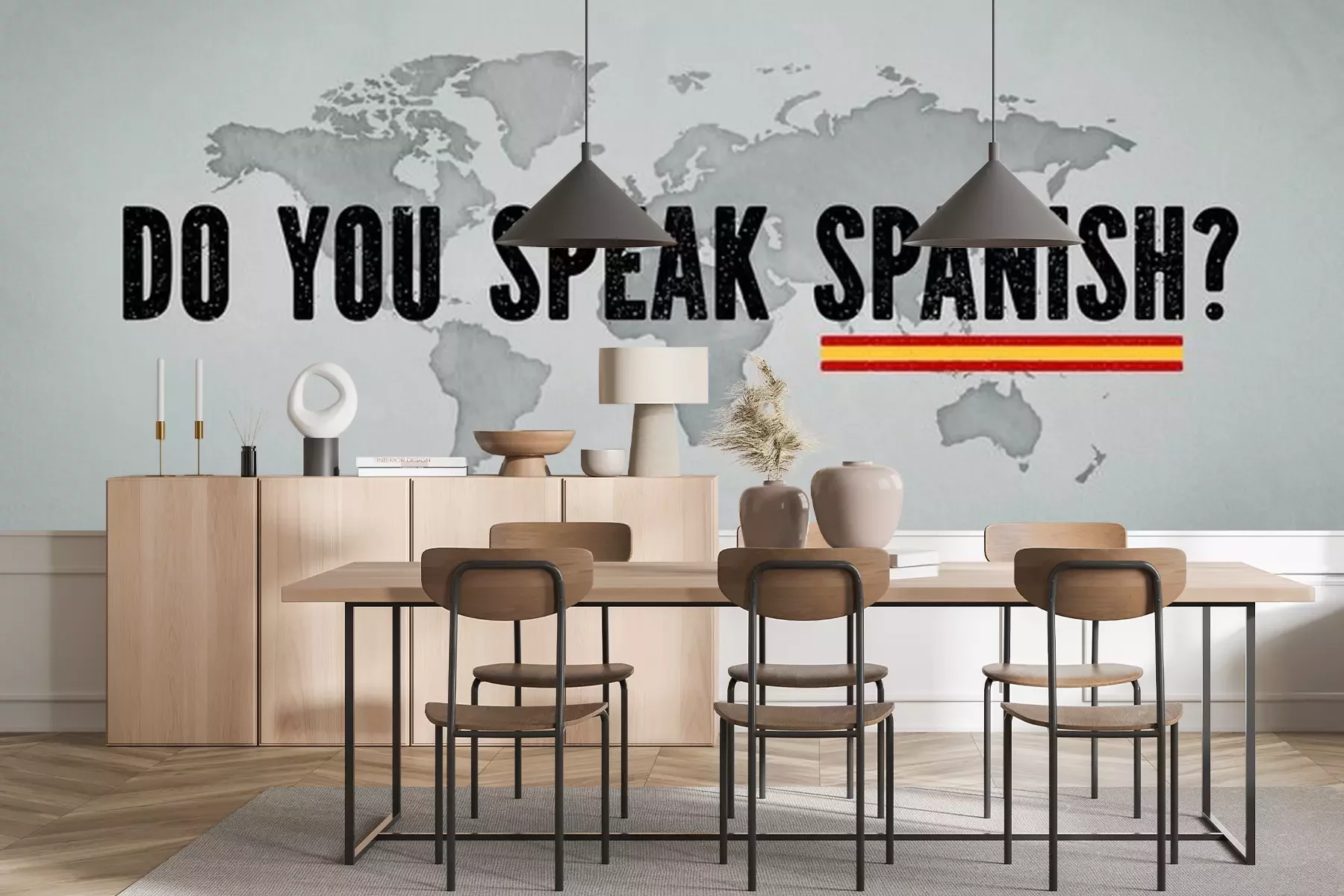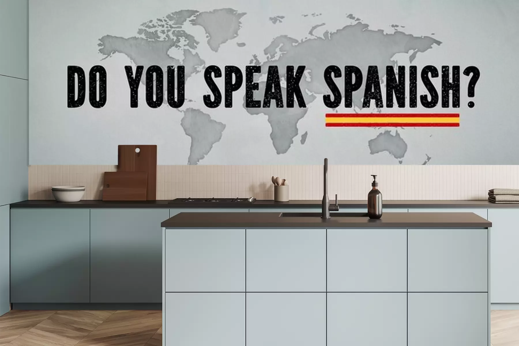 Fototapete Aufschrift „Sprechen Sie Spanisch?“ vor dem Hintergrund einer Weltkarte