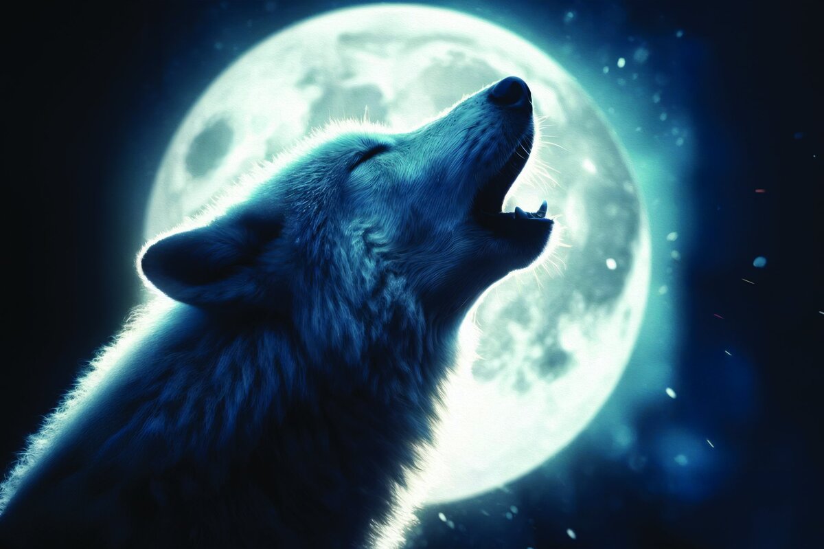 Fototapete: Nachtwolf heult unter dem hellen Mond