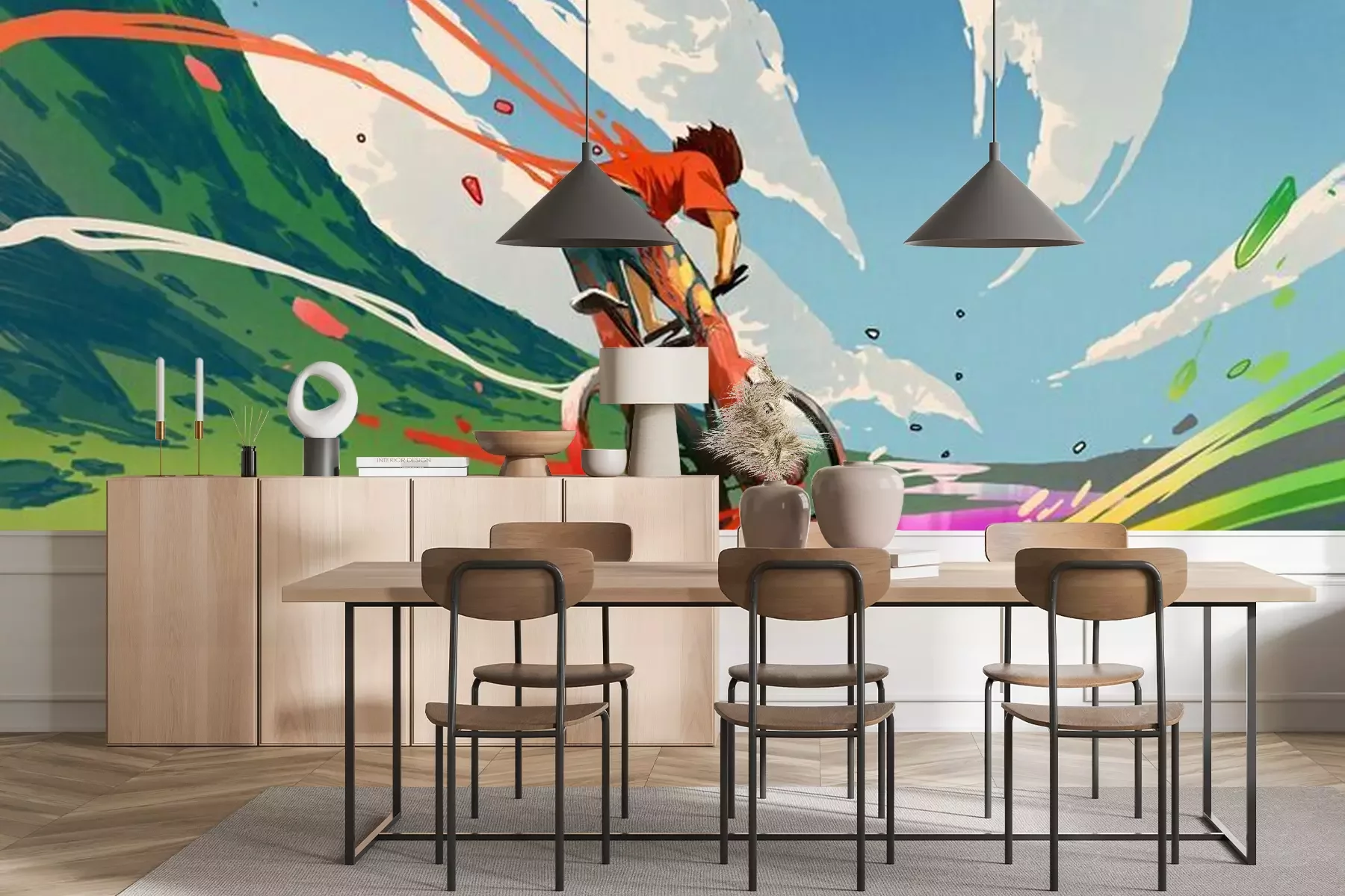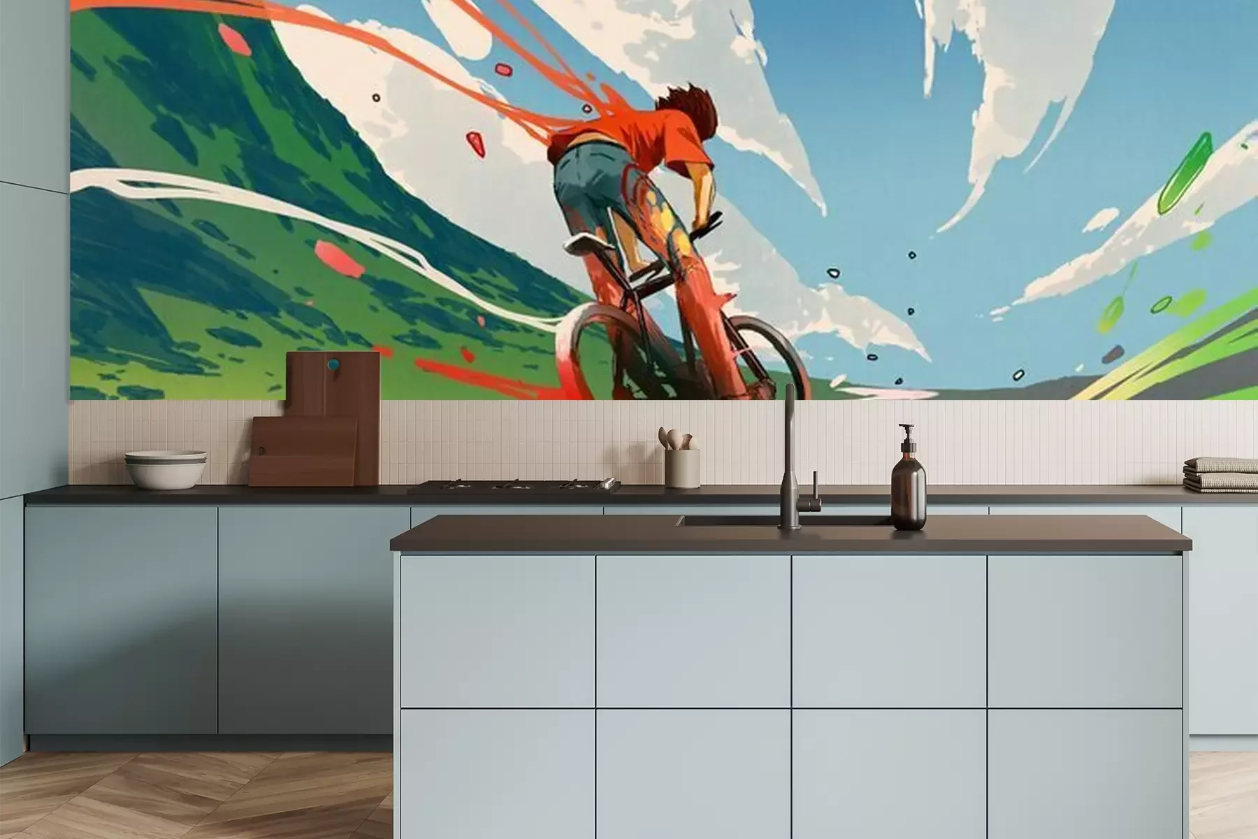 *Der Rabatt gilt nicht für Klebstoffe, Zubehör und Geschenkkarten.Die hier präsentierte Fototapete – Illustration eines Jungen, der Fahrrad fährt – ist nicht nur für Fahrradliebhaber, sondern auch für Fans von Anime, also japanischen Zeichentrickfilmen, die ideale Lösung. Das Besondere an der von uns vorgeschlagenen Dekoration ist ihr äußerst dynamischer Charakter. Die Komposition ist so gestaltet, dass durch die Anordnung der Wolken und die bunte Spur, die der Radfahrer hinterlässt, der Eindruck von Bewegung entsteht. So belebt eine solche bunte Fototapete nicht nur die Einrichtung, sondern verleiht auch dem Raum einen ausdrucksstarken Charakter. Da es sich um eine farbenfrohe Illustration handelt, findet diese Art von Grafik Anwendung in der Kinderzimmerdeko. Wenn das Kind gerne Fahrrad fährt, gefällt ihm eine solche Fototapete. Fahrrad wird vor einer Landschaft – einem Tal zwischen grünen Hügeln – dargestellt, wodurch gleichzeitig ein Hauch von Natur ins Haus geholt wird. Dies ist eine hervorragende Möglichkeit, die Einrichtung sofort viel freundlicher und gemütlicher zu gestalten. Es ist auch erwähnenswert, dass eine solche bunte Fototapete eine fröhliche Atmosphäre ins Kinderzimmer bringt. Dank der ausgewogenen Farbpalette wird der Eindruck von Chaos oder Überladung im Raumdesign vermieden. Die Wanddekoration kann jedoch nicht nur schmücken. Indem sie eine Sportart, in diesem Fall Radfahren, darstellt, regt sie das Kind dazu an, seine Freizeit aktiv zu verbringen. Dies ist auch eine gute Möglichkeit, seine Leidenschaft für das Radfahren zu zeigen. Auch in einer Jugendzimmergestaltung bewährt sich eine solche Fototapete. Fahrrad auf der Illustration im Anime-Stil spricht einen Teenager an, der sich für die japanische Popkultur interessiert. Obwohl es sich um ein cartoonartiges Muster handelt, muss es nicht unbedingt kindisch wirken, wie jeder Anime-Fan weiß. Wenn diese Fototapete Fahrrad zum dominierenden Element im Zimmer eines Teenagers wird, ermöglicht diese ausdrucksstarke Grafik eine 180-Grad-Metamorphose des bisherigen Interieurs, selbst wenn Möbel und andere Einrichtungselemente unverändert bleiben.