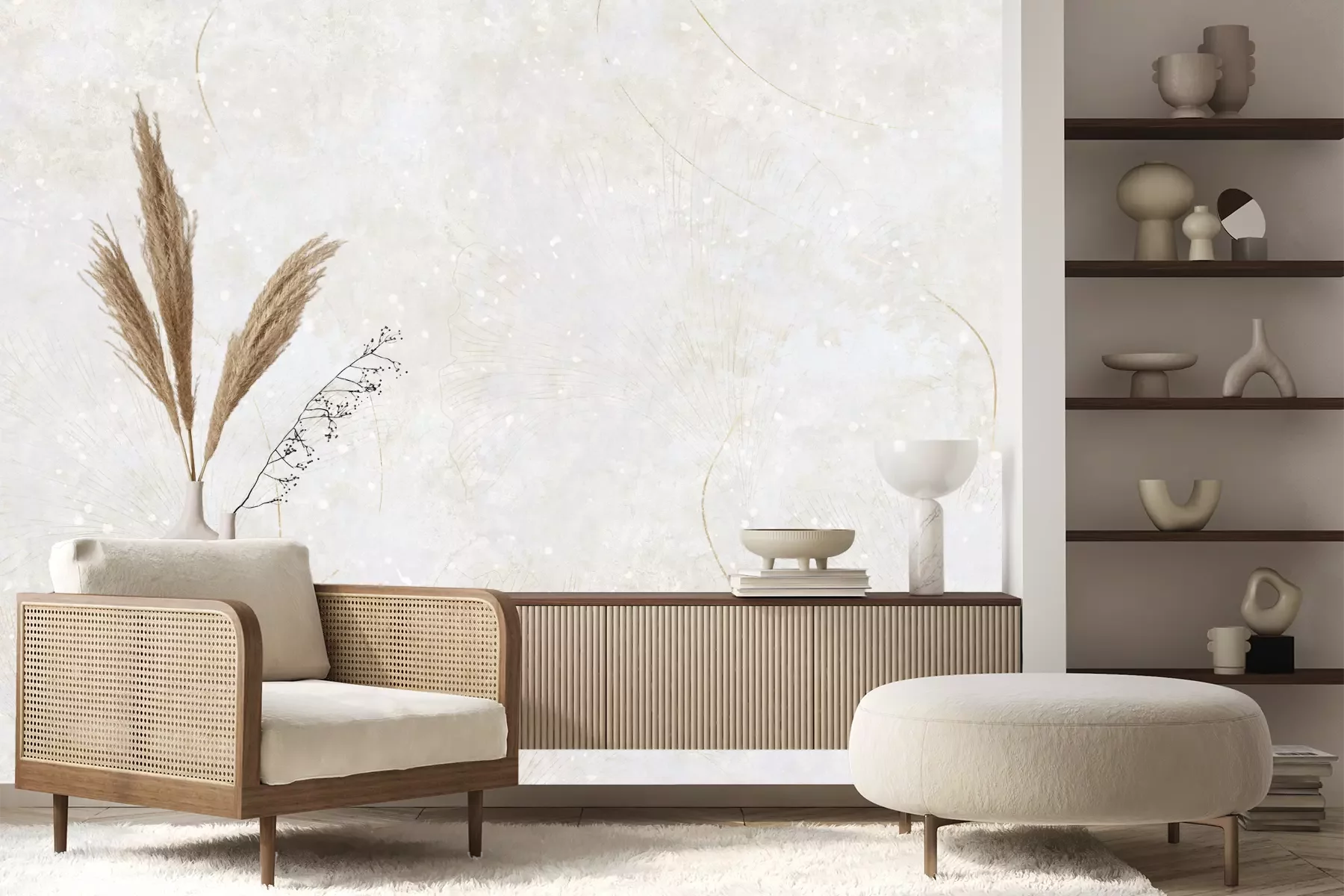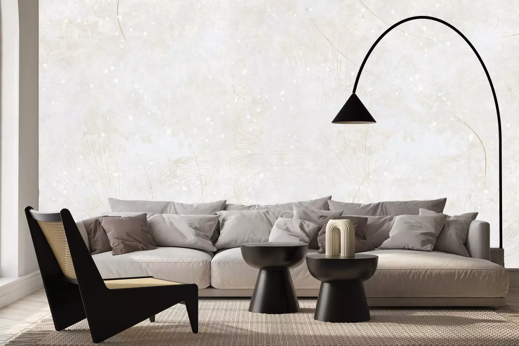 Das Material Premium+ besteht aus einer strukturierten Vinyl-Oberschicht und einem Trägermaterial (Vlies) mit einer Grammatur von 255 g/m², das kleine Unebenheiten der Wand zuverlässig kaschiert. Die feine Sandstruktur verleiht der Oberfläche eine luxuriöse Haptik, während das halbmatte Finish die Tiefe der Farben betont. Das Material ist dampfdurchlässig – so kann diese Fototapete auch in Küchen und Badezimmern eingesetzt werden. Die maximale Breite einer Tapetenbahn beträgt 100 cm. Bei größeren Abmessungen besteht die Fototapete aus mehreren gleich großen Bahnen. Der Kleber wird direkt auf die Wand aufgetragen, und die Fototapete wird auf Stoß angebracht, was für einen ästhetischen Effekt ohne sichtbare Fugen sorgt. Die Oberfläche ist pflegeleicht und kann bei Bedarf sanft mit einem feuchten Tuch abgewischt werden.