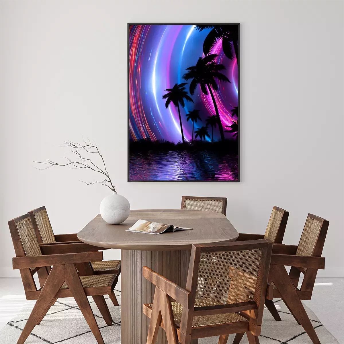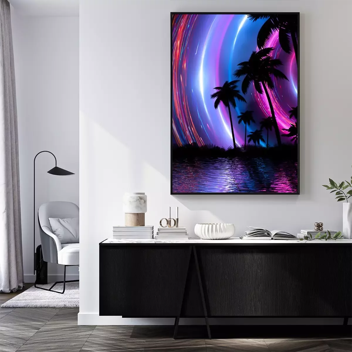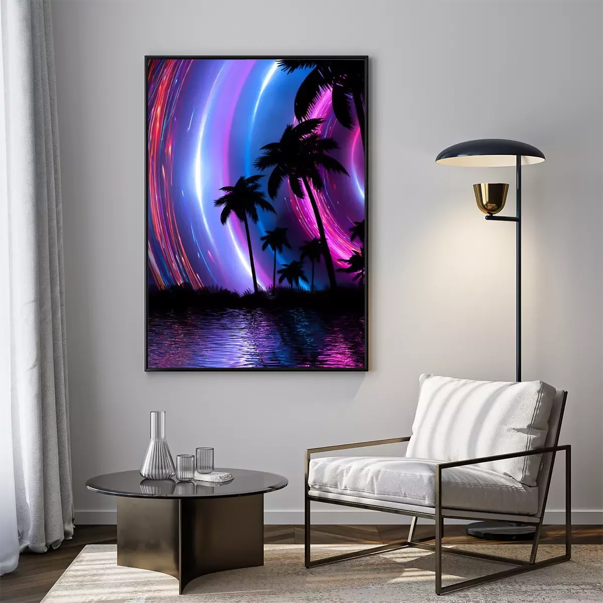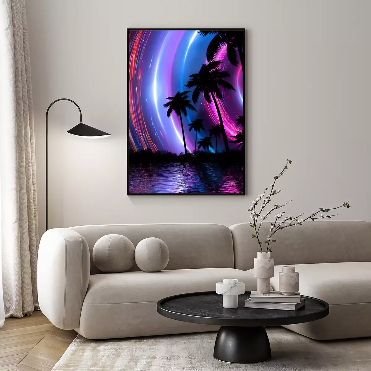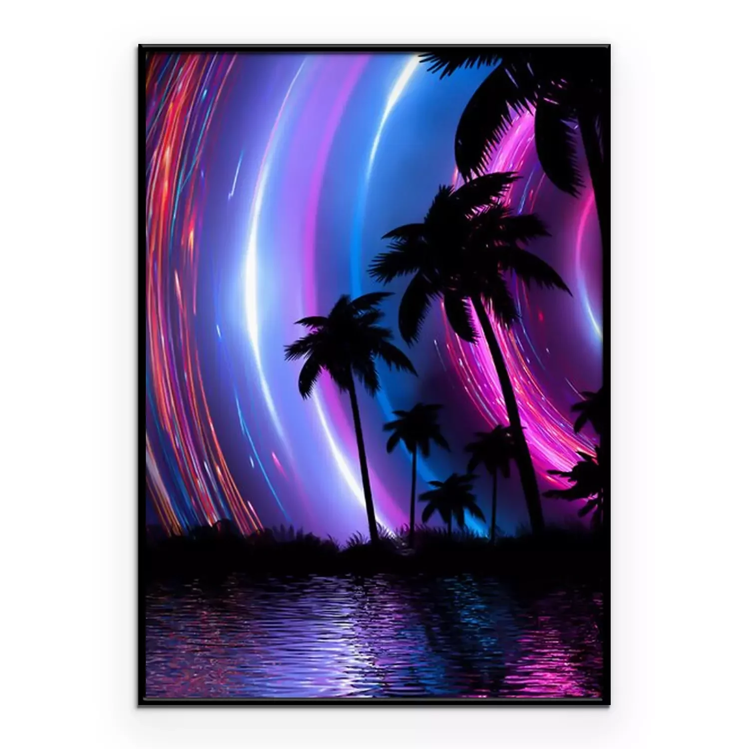 Poster 3d Palmen auf einem Hintergrund von glühenden Ringen