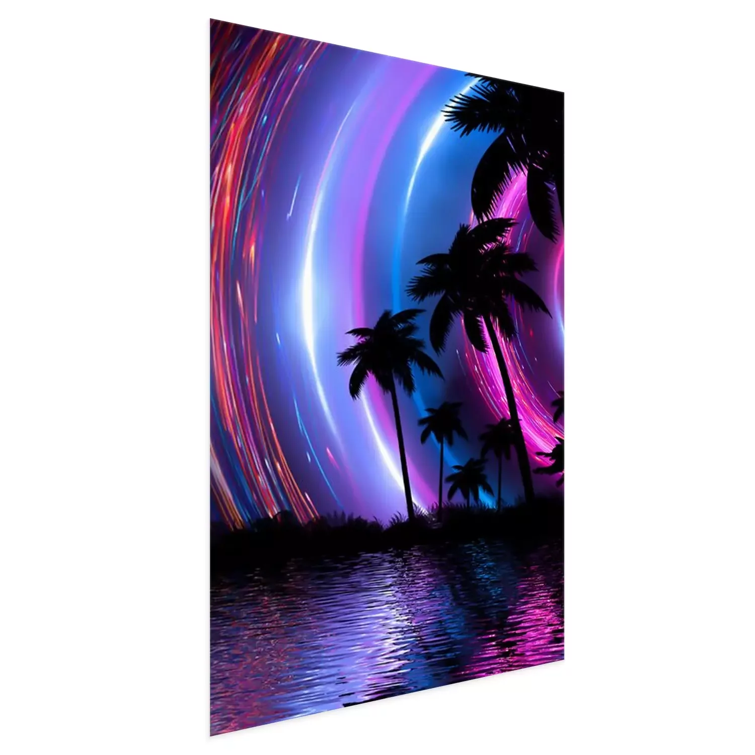 Poster: 3d Palmen auf einem Hintergrund von glühenden Ringen