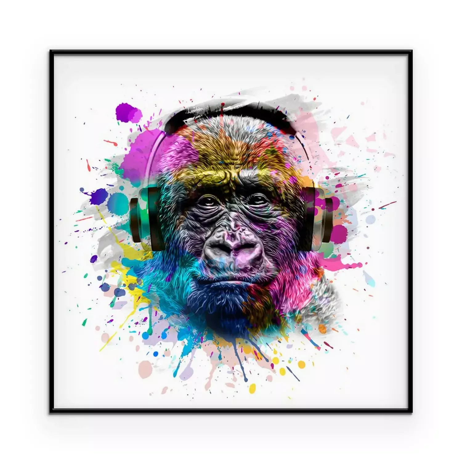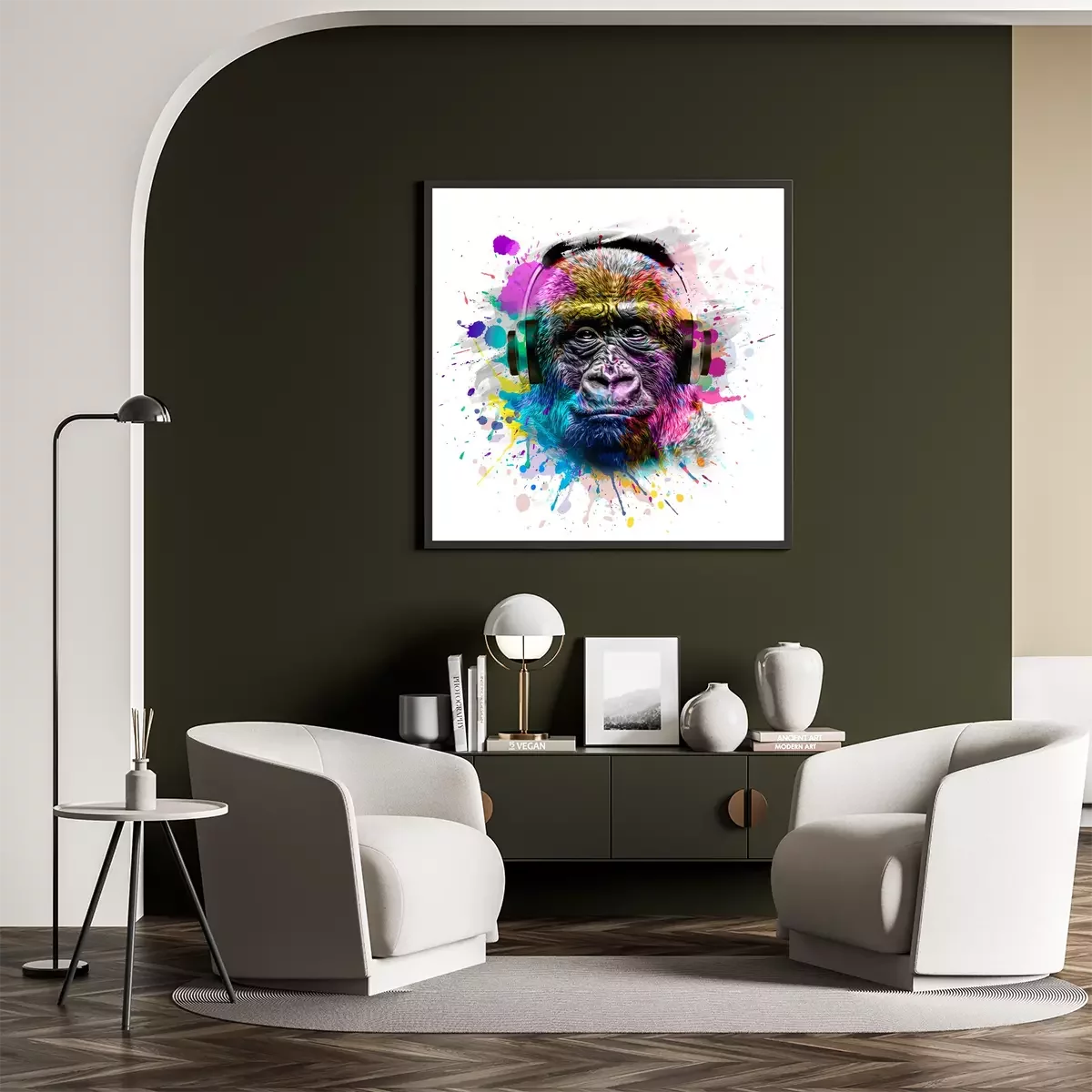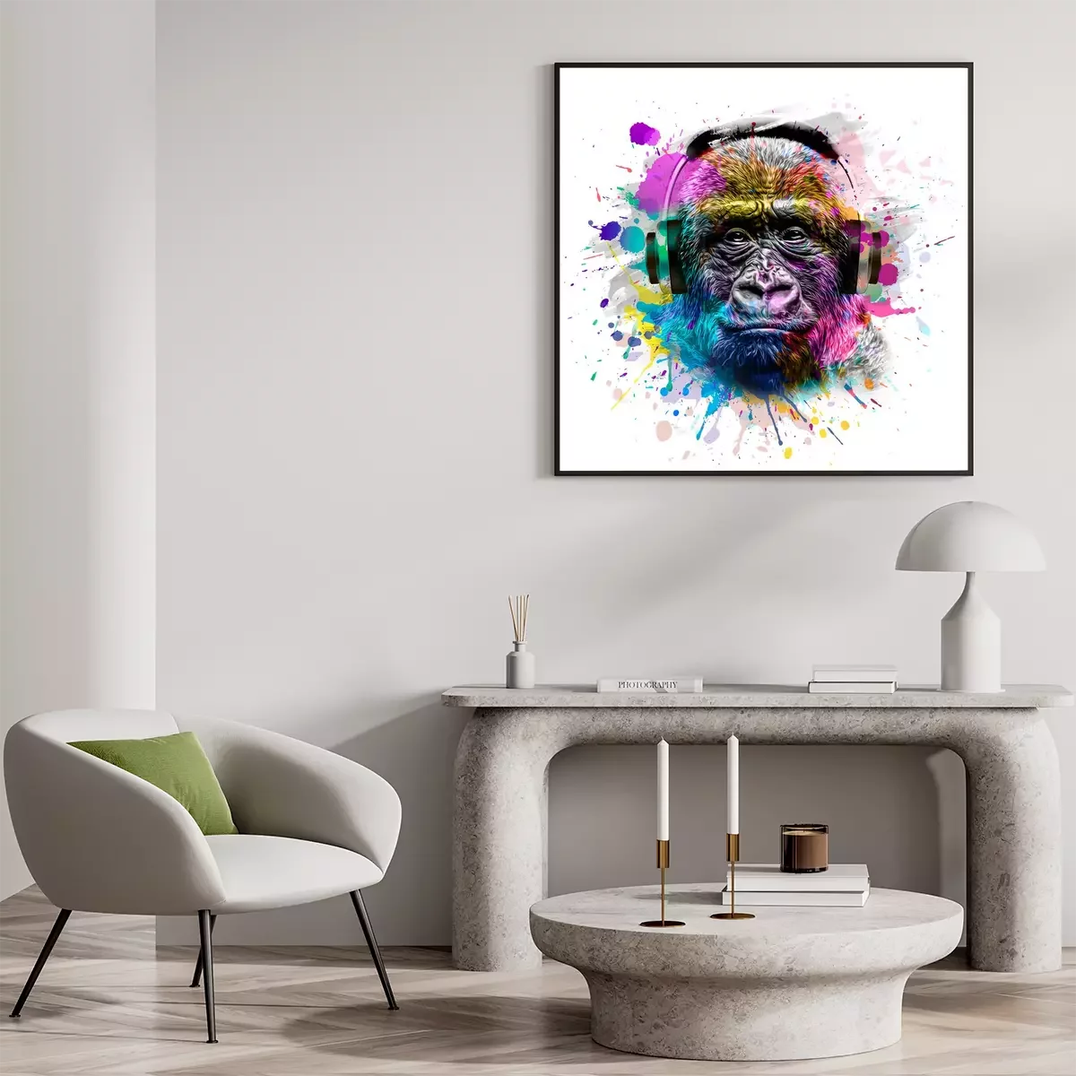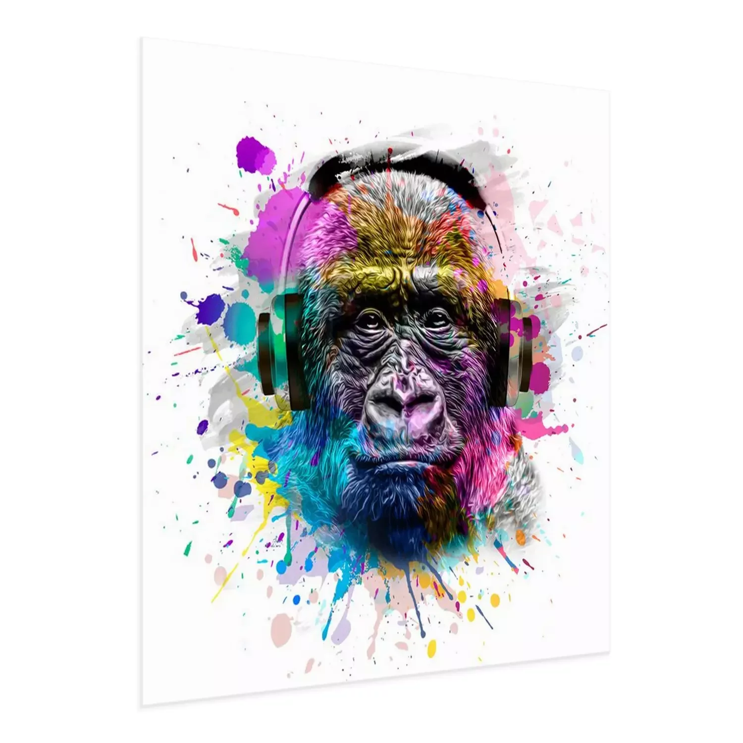 Poster: Affe mit Kopfhörern mit bunten Palmen auf weißem Hintergrund