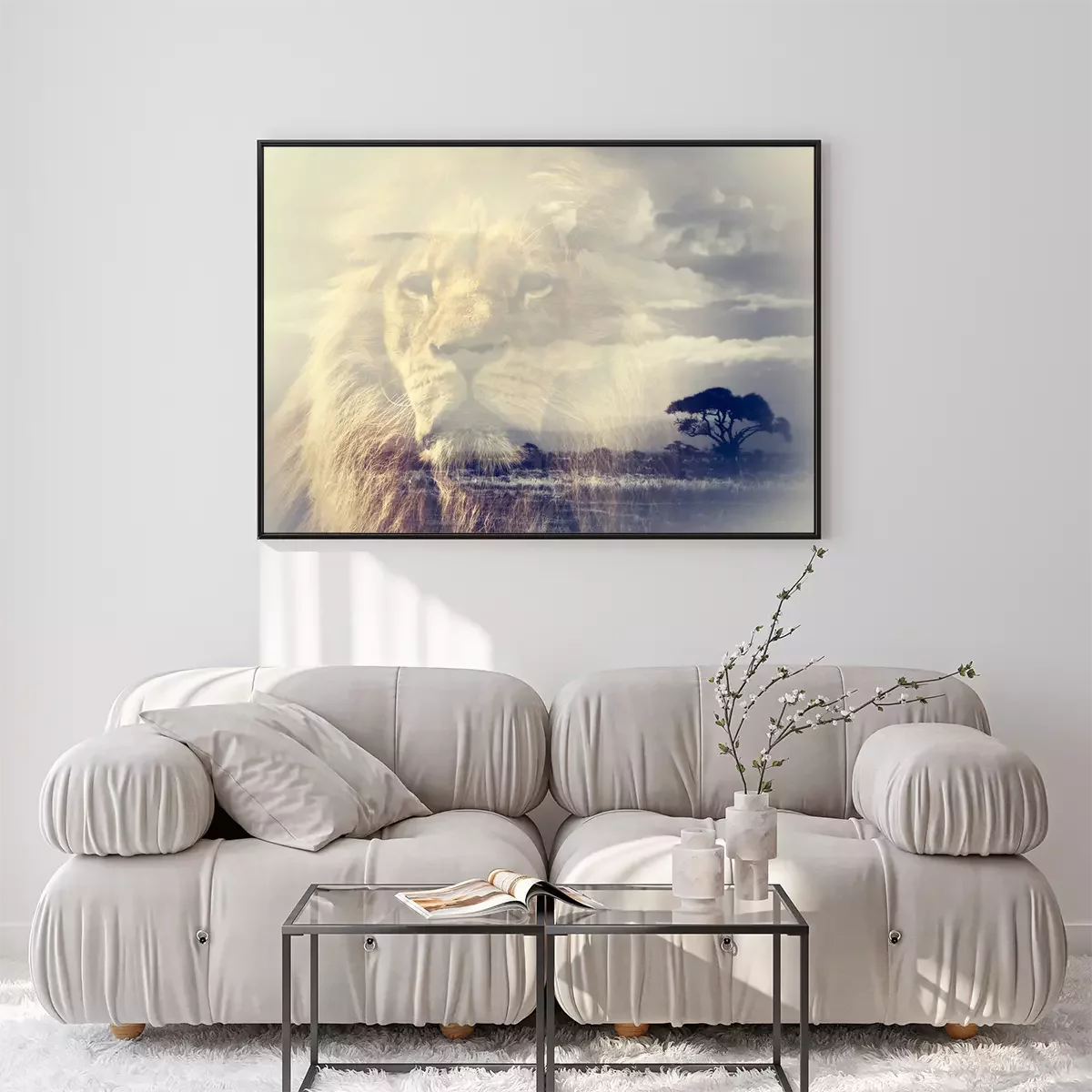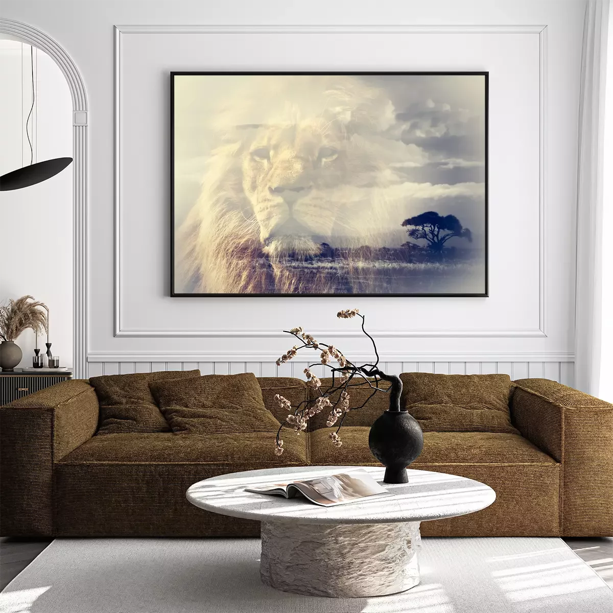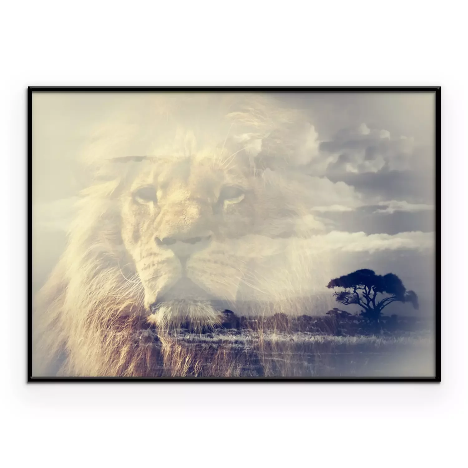 Poster: Afrikanischer Löwe mit Savanne im Hintergrund