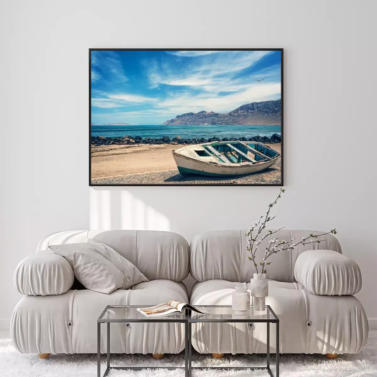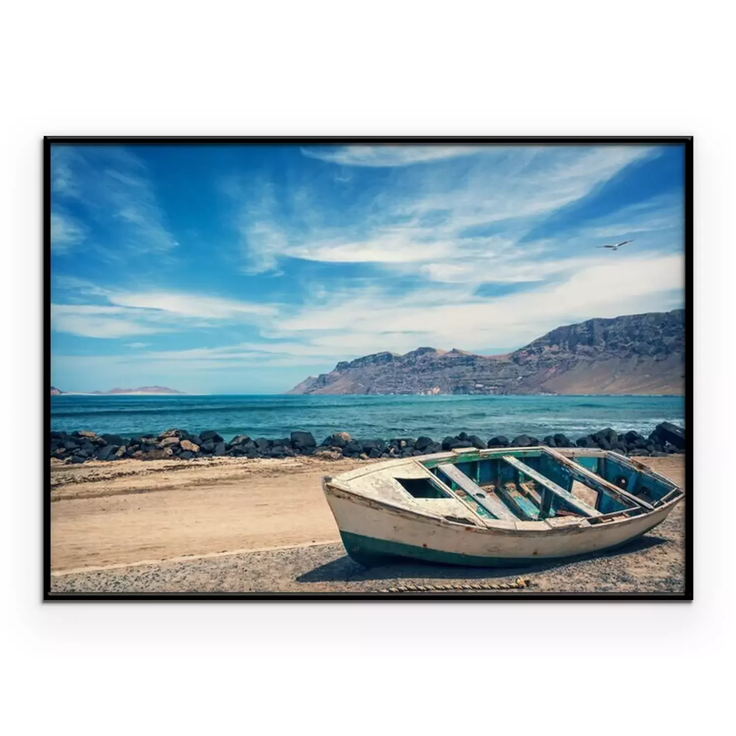 Poster: Altes buntes Fischerboot, Atlantik im Hintergrund, Lanzarote, Kanarische Inseln, Spanien
