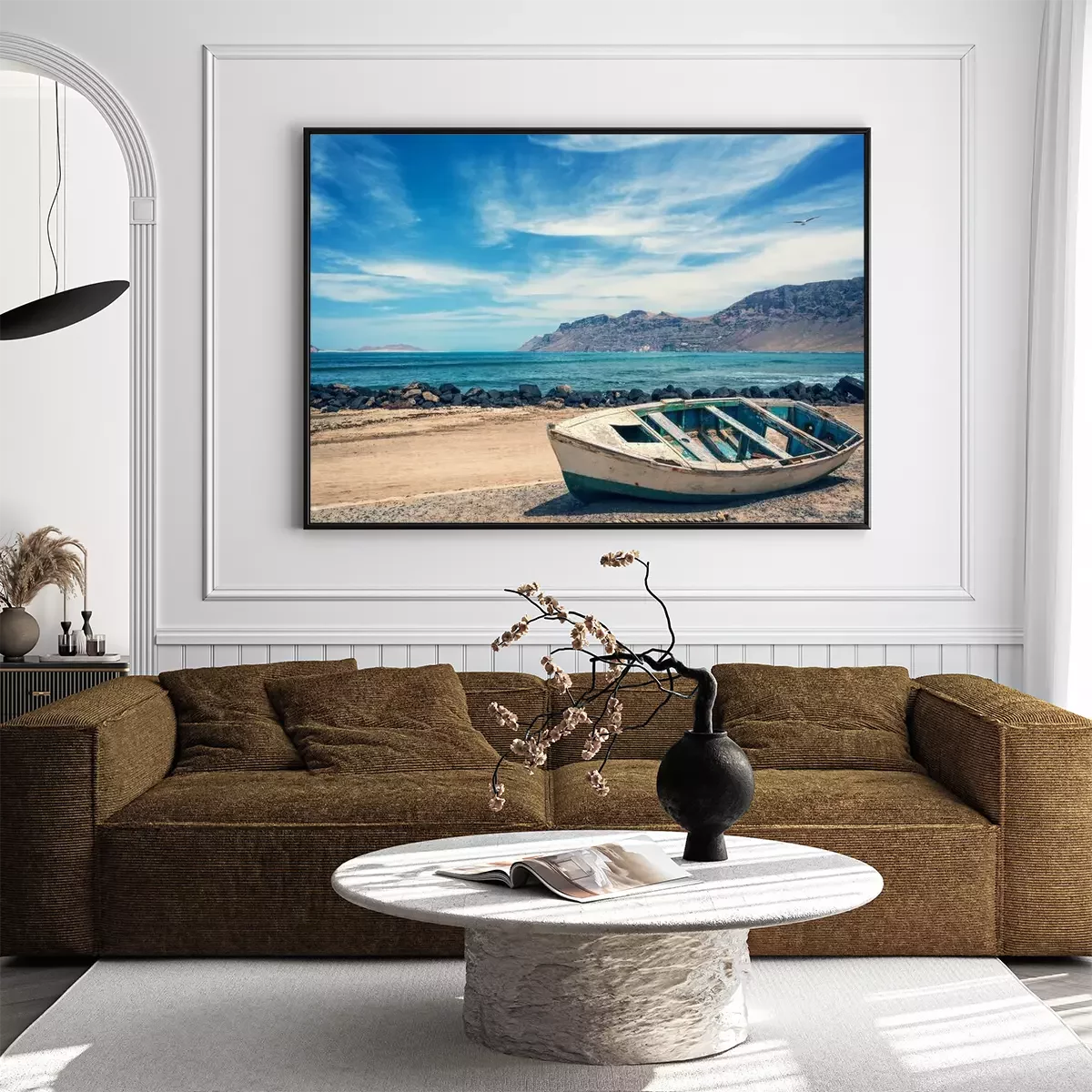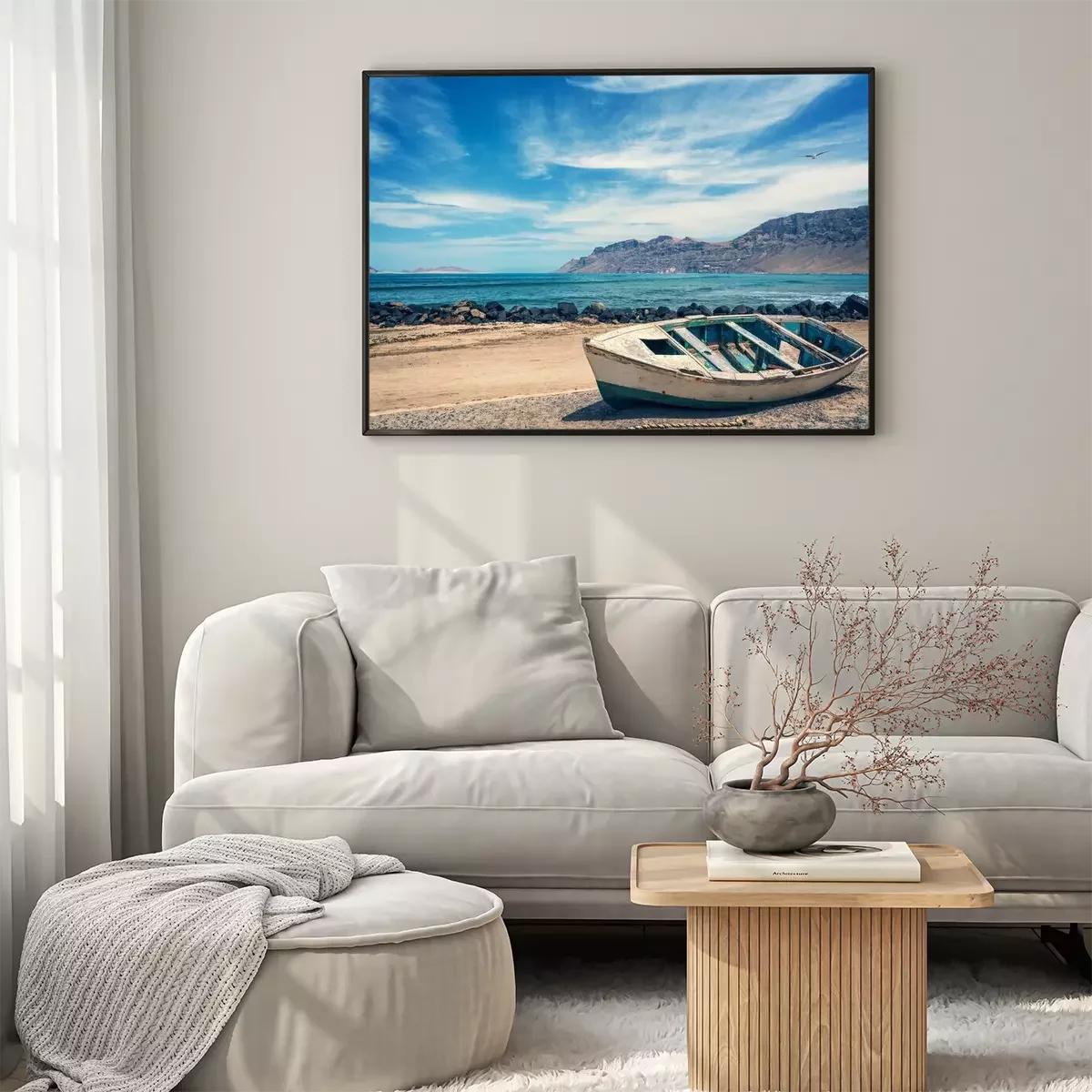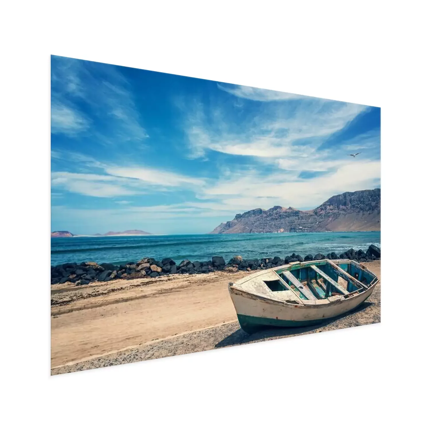Poster Altes buntes Fischerboot, Atlantik im Hintergrund, Lanzarote, Kanarische Inseln, Spanien