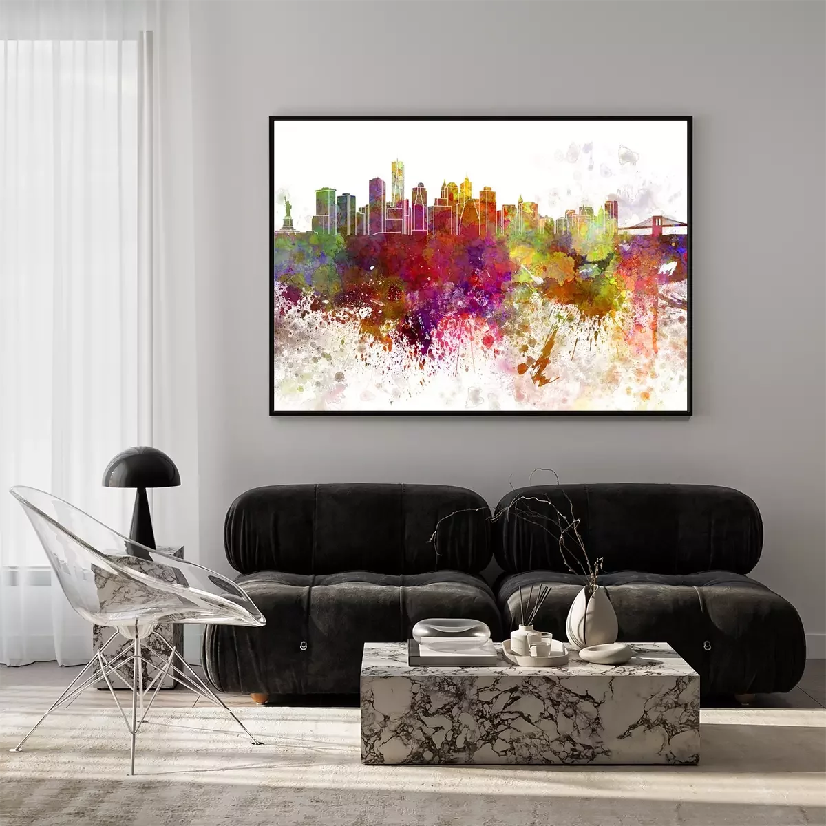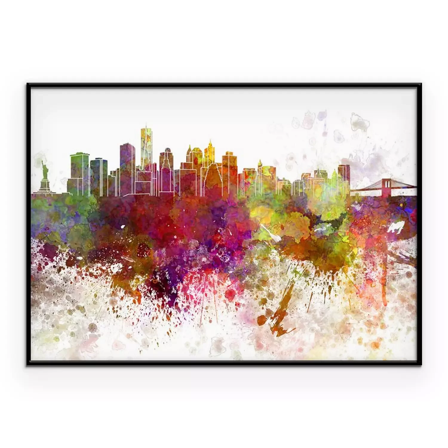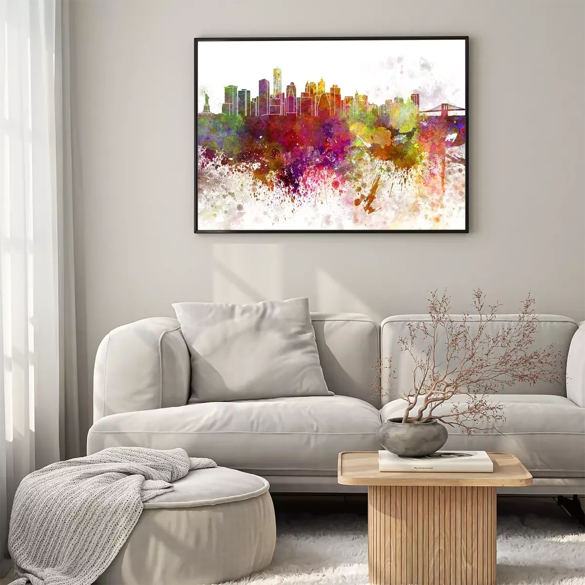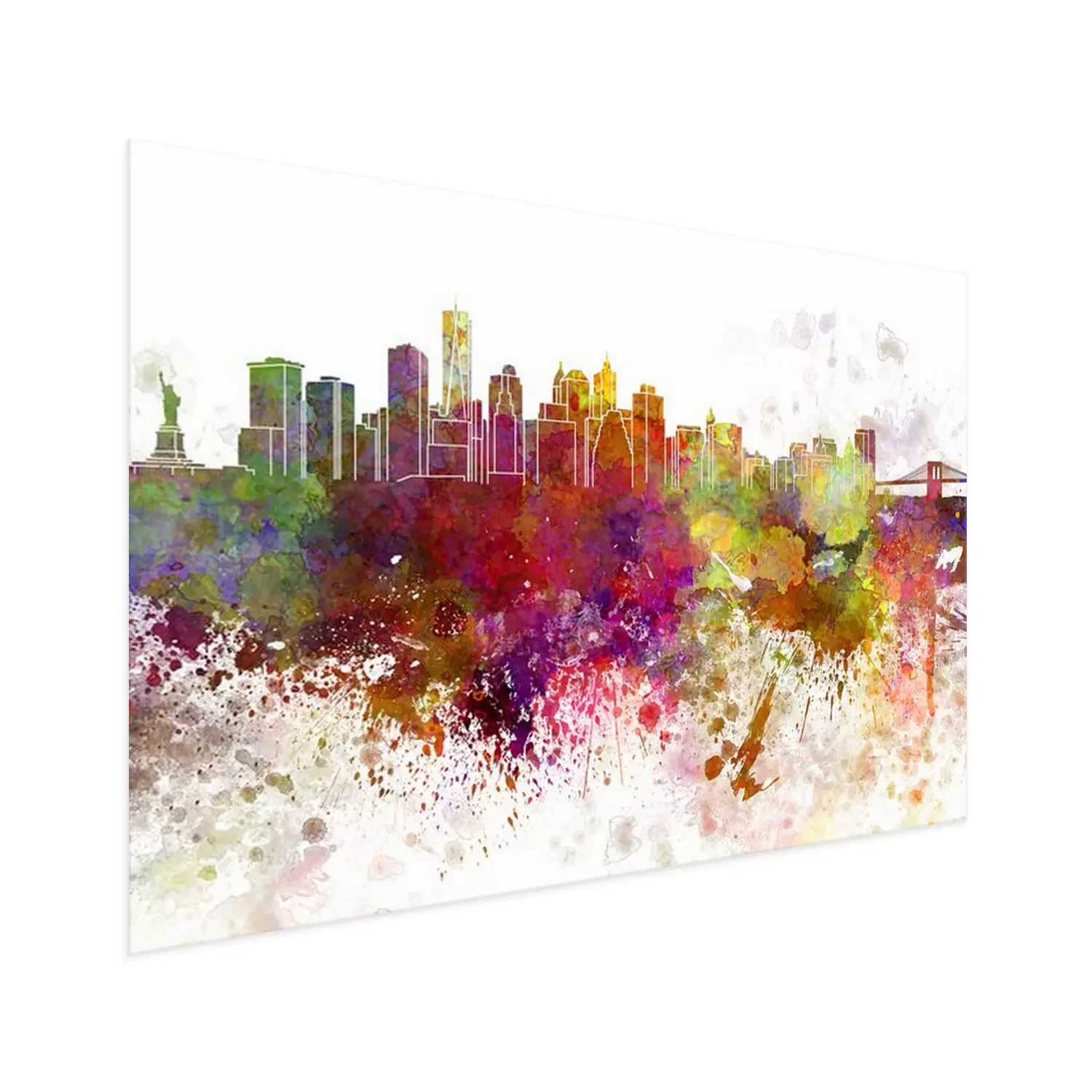 Poster: Amerika Regenbogengrafik mit Stadtpanorama