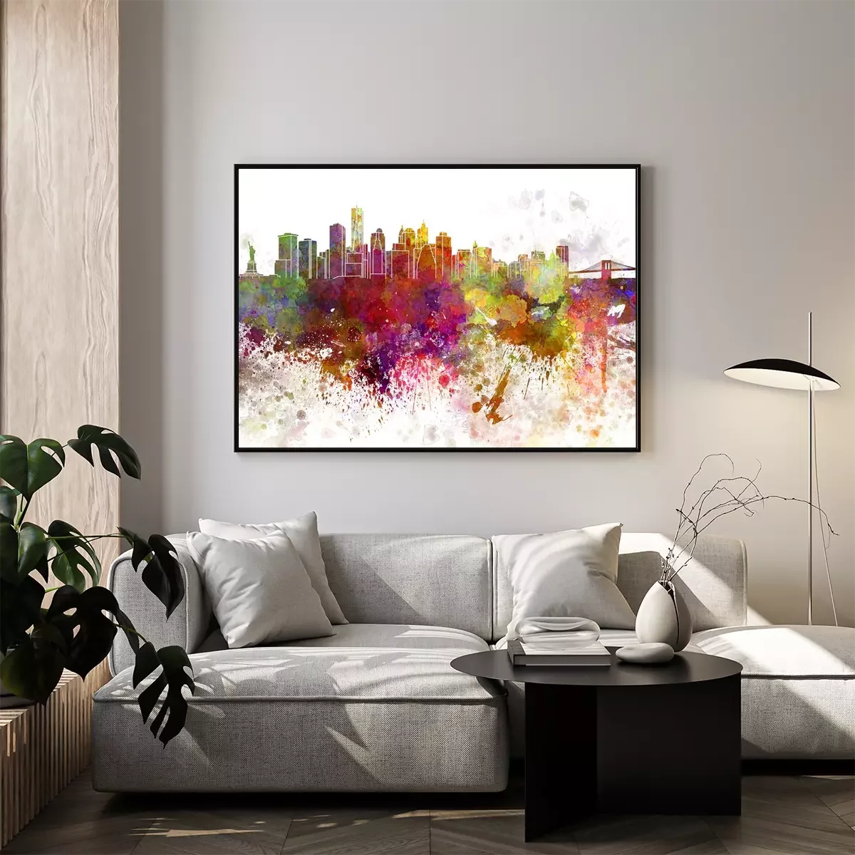Poster Amerika Regenbogengrafik mit Stadtpanorama