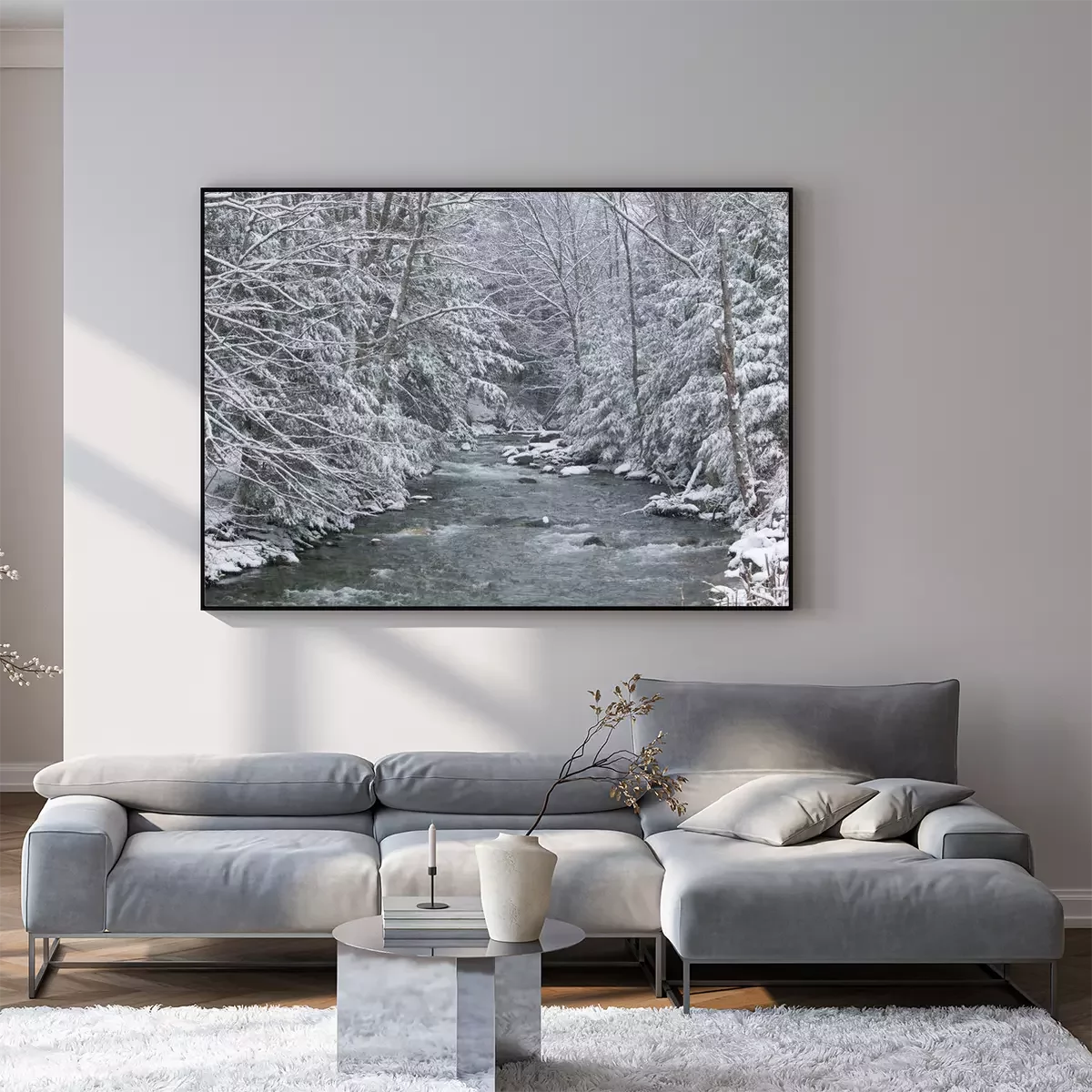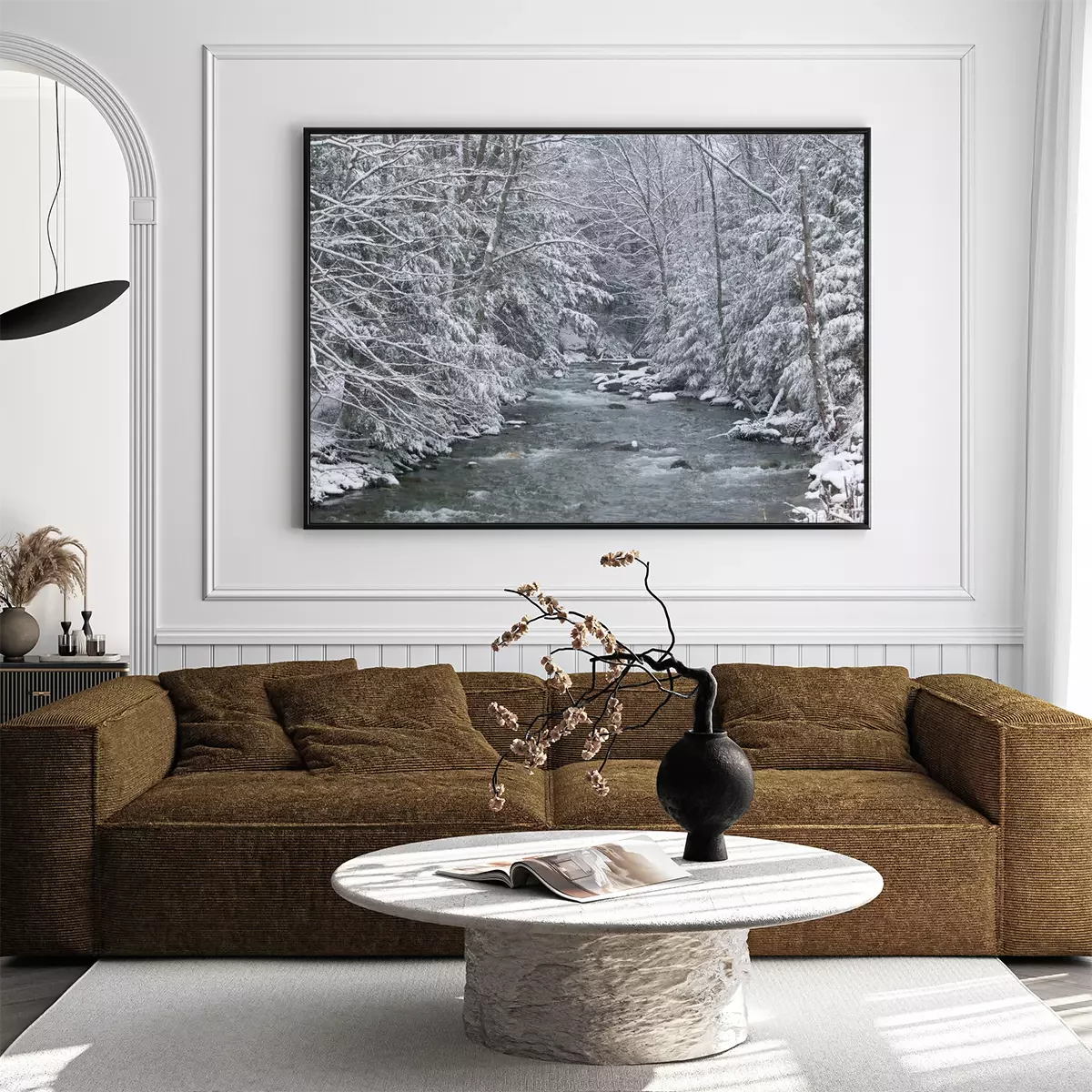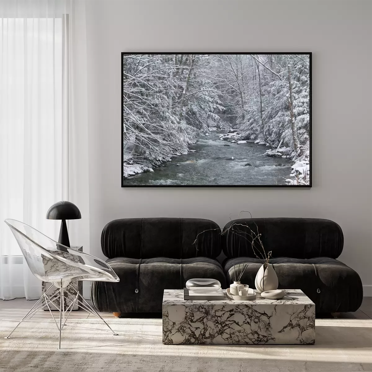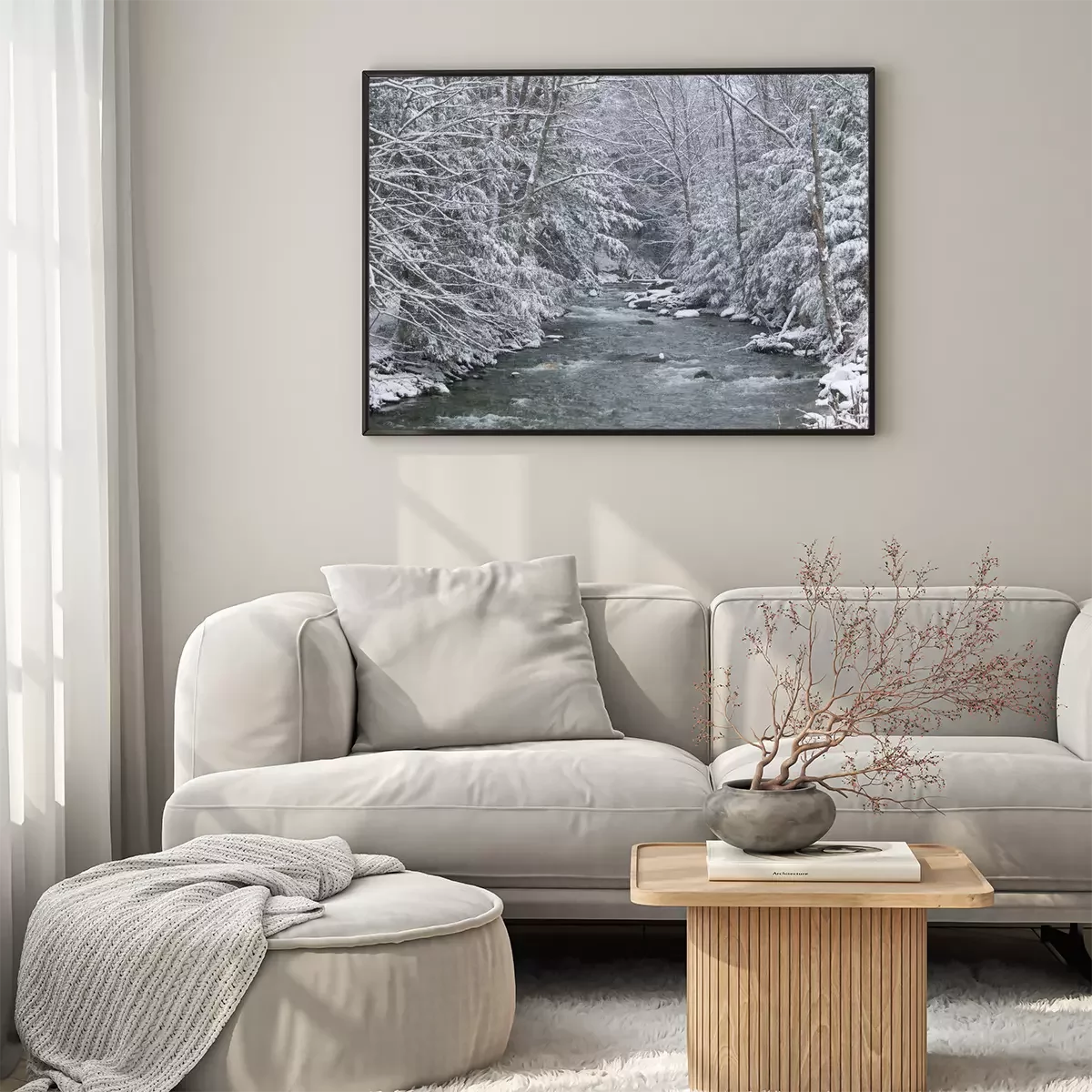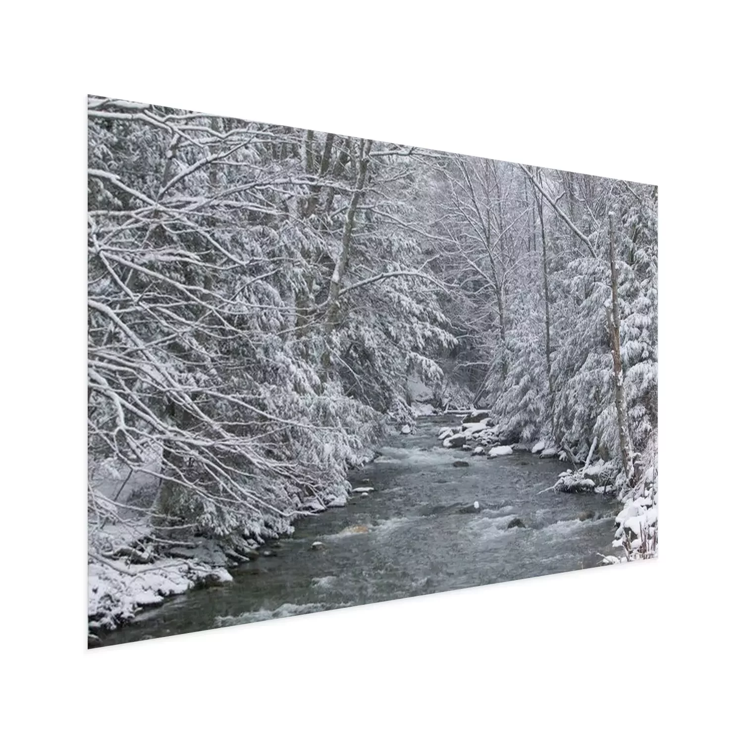 Poster Amerikas Fluss fließt zwischen schneebedeckten Bäumen