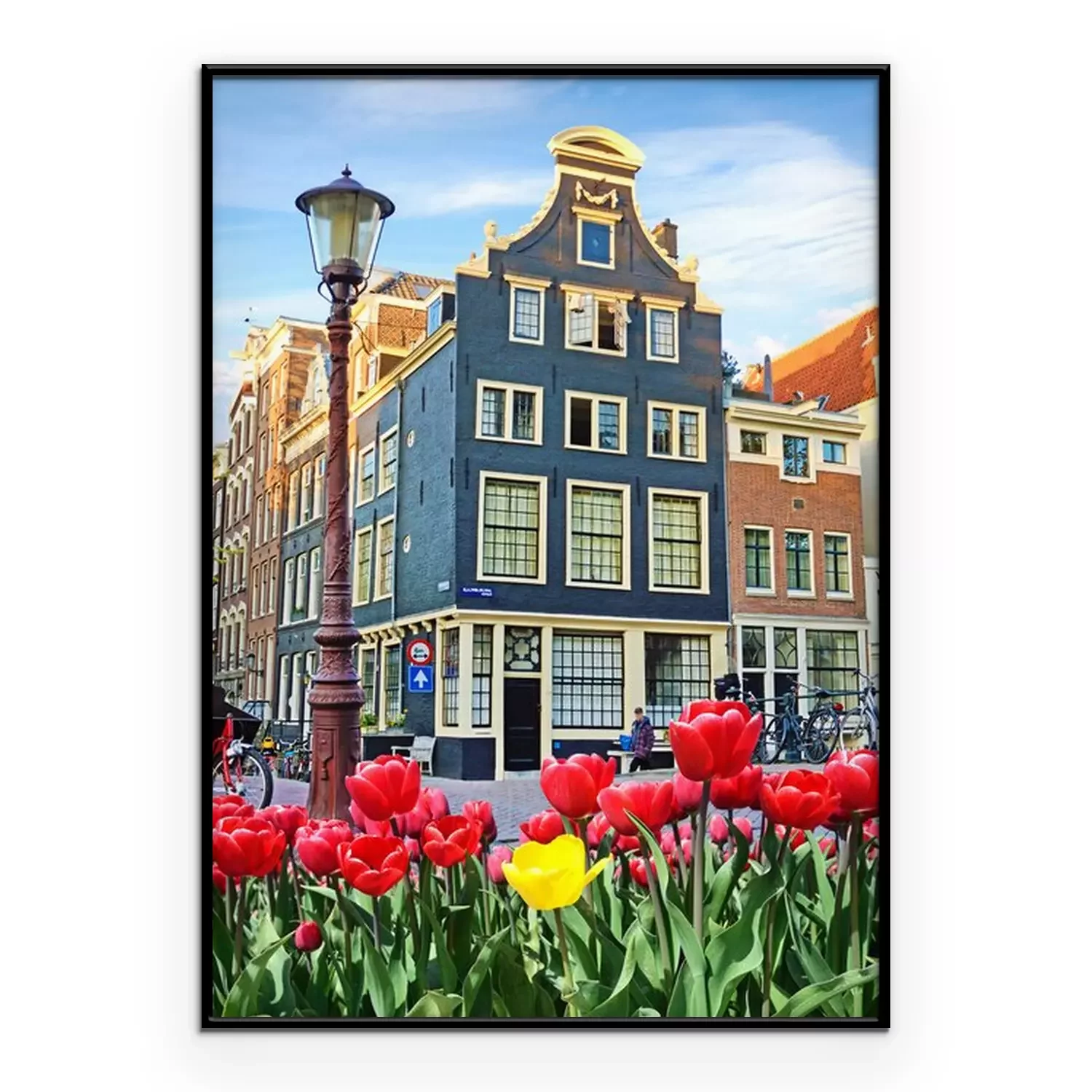 Poster Amsterdam rote Tulpen und Fahrräder auf einem Platz