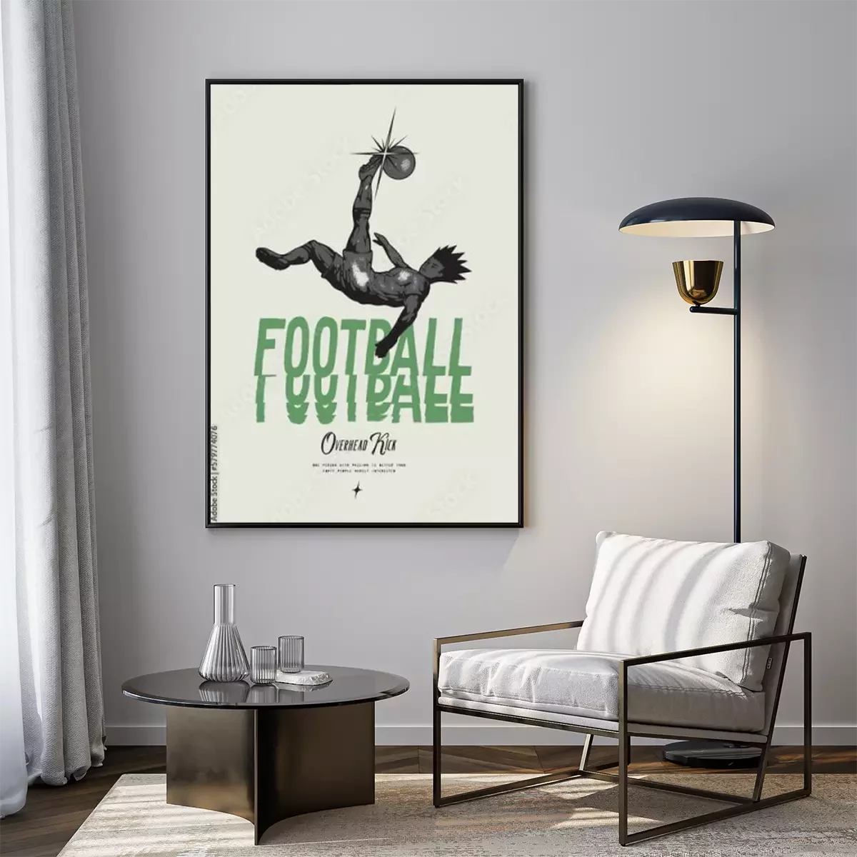 Poster Anime Football. Soccer player kicking ball overhead. Football vintage typography silkscreen t-shirt print vector illustration