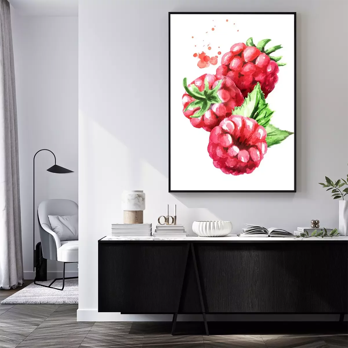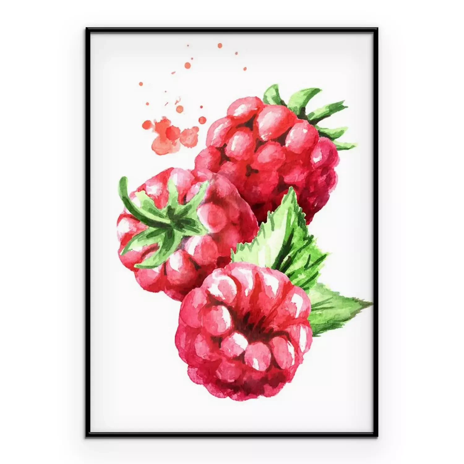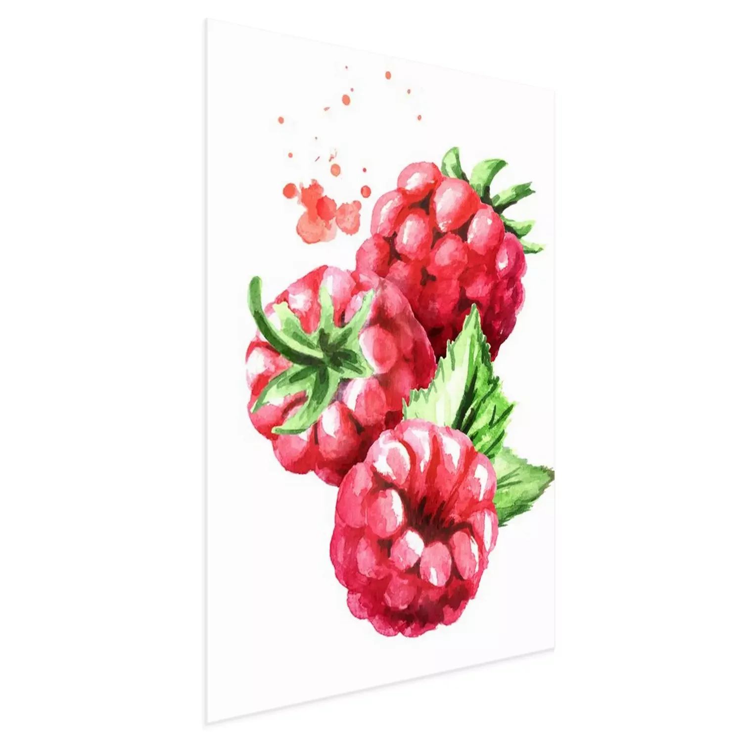 Poster: Aquarell-Himbeeren mit grünen Blättern