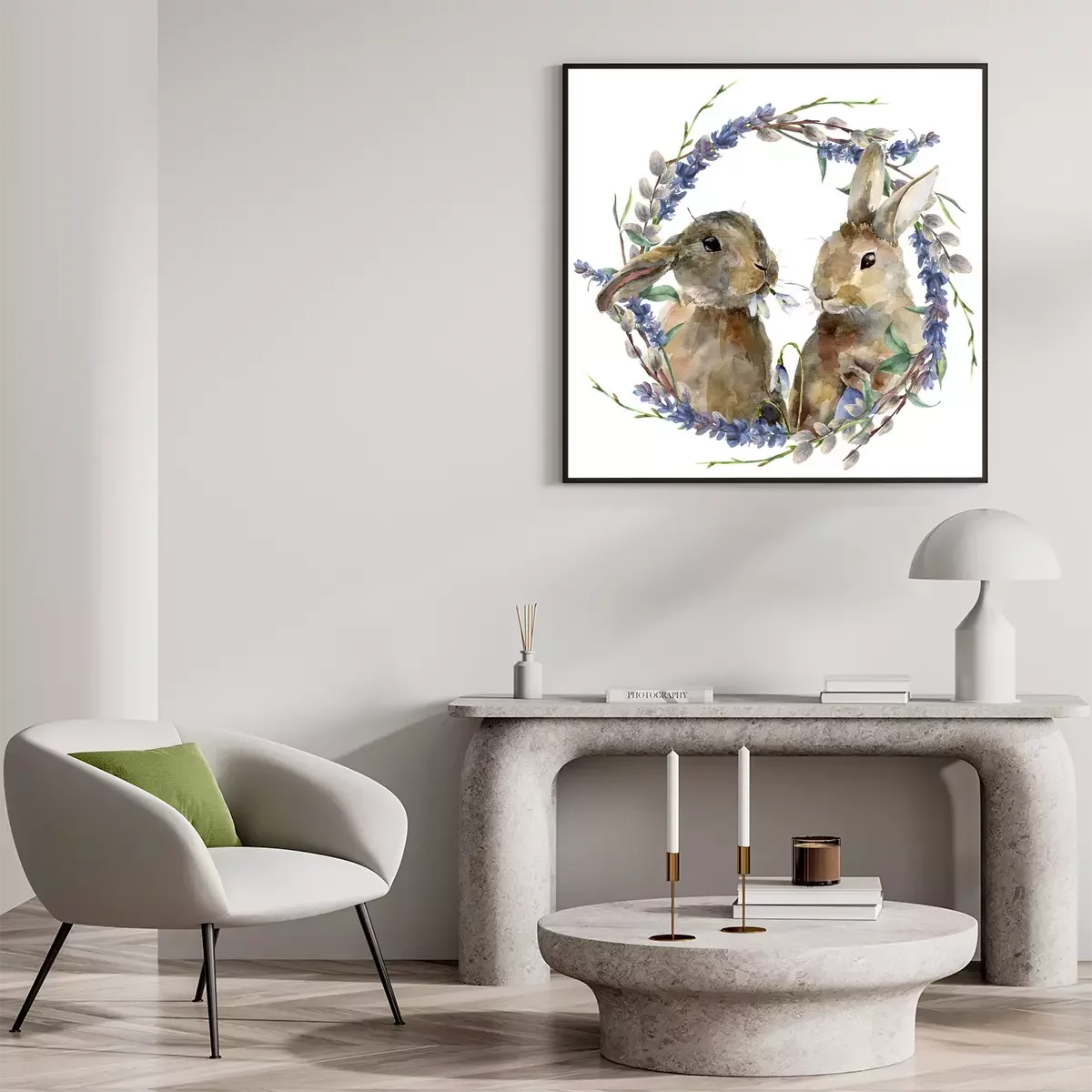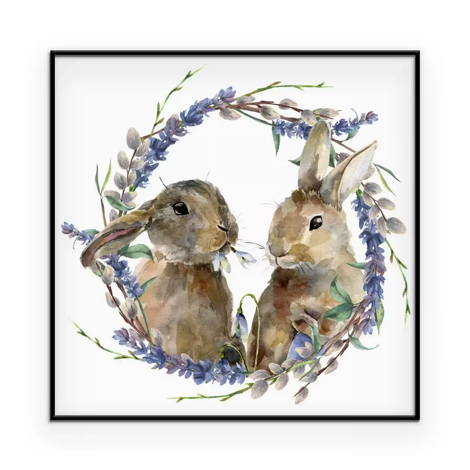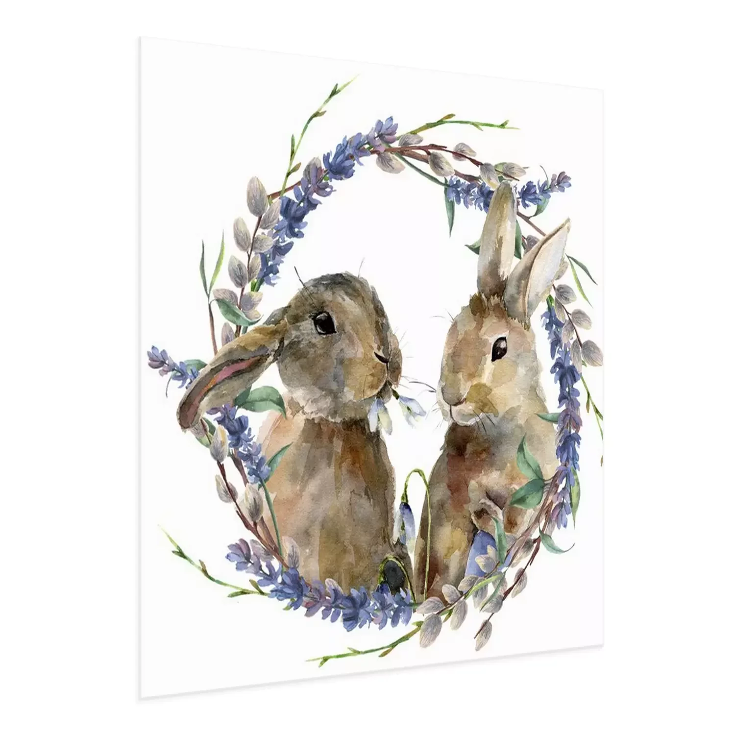 Poster: Aquarell-Kaninchen inmitten von Lavendel- und Weidenzweigen