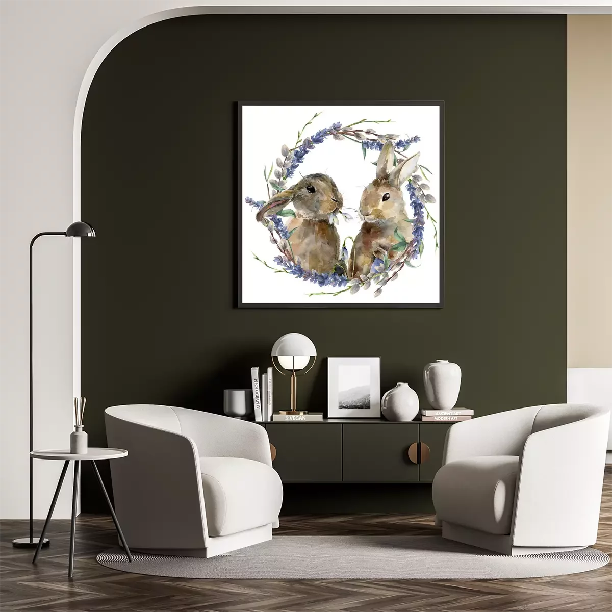 Poster Aquarell-Kaninchen inmitten von Lavendel- und Weidenzweigen