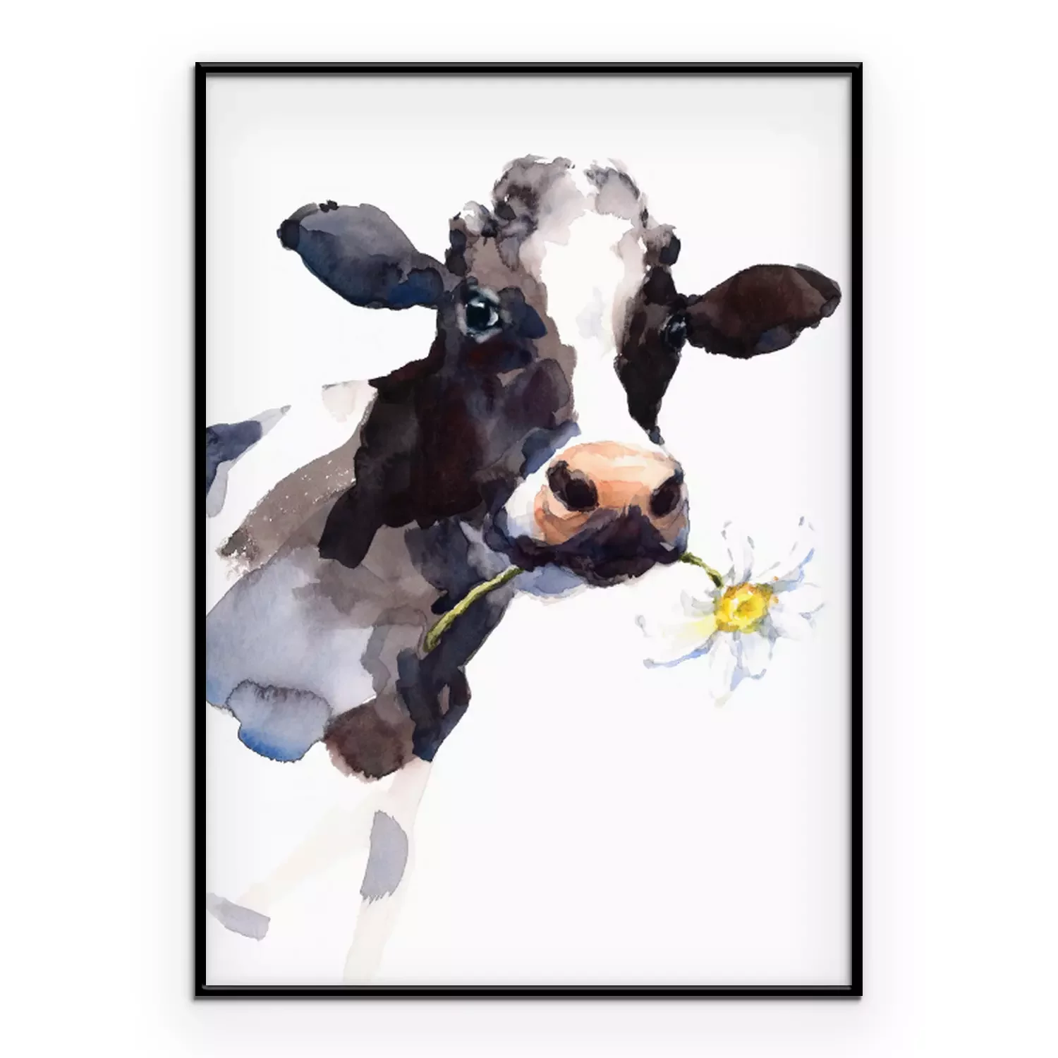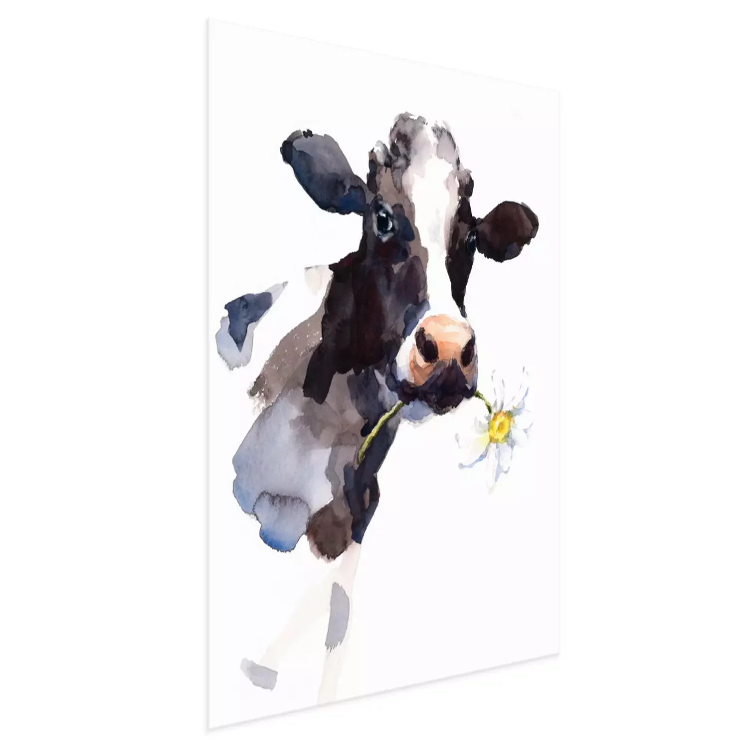 Poster: Aquarell-Kuh mit Gänseblümchen auf weißem Hintergrund