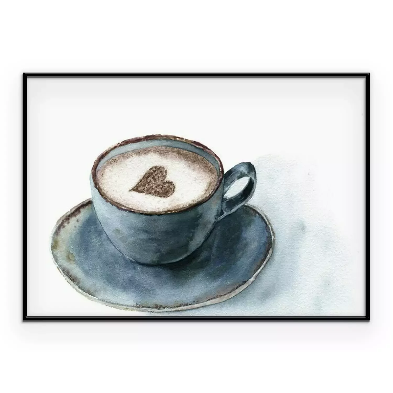 Poster: Aquarell Tasse Cappuccino mit Zimt Herzdekor. Essen Illustration mit blauen Tasse Kaffee auf weißem Hintergrund. Handgemalter Druck für Design oder Druck.