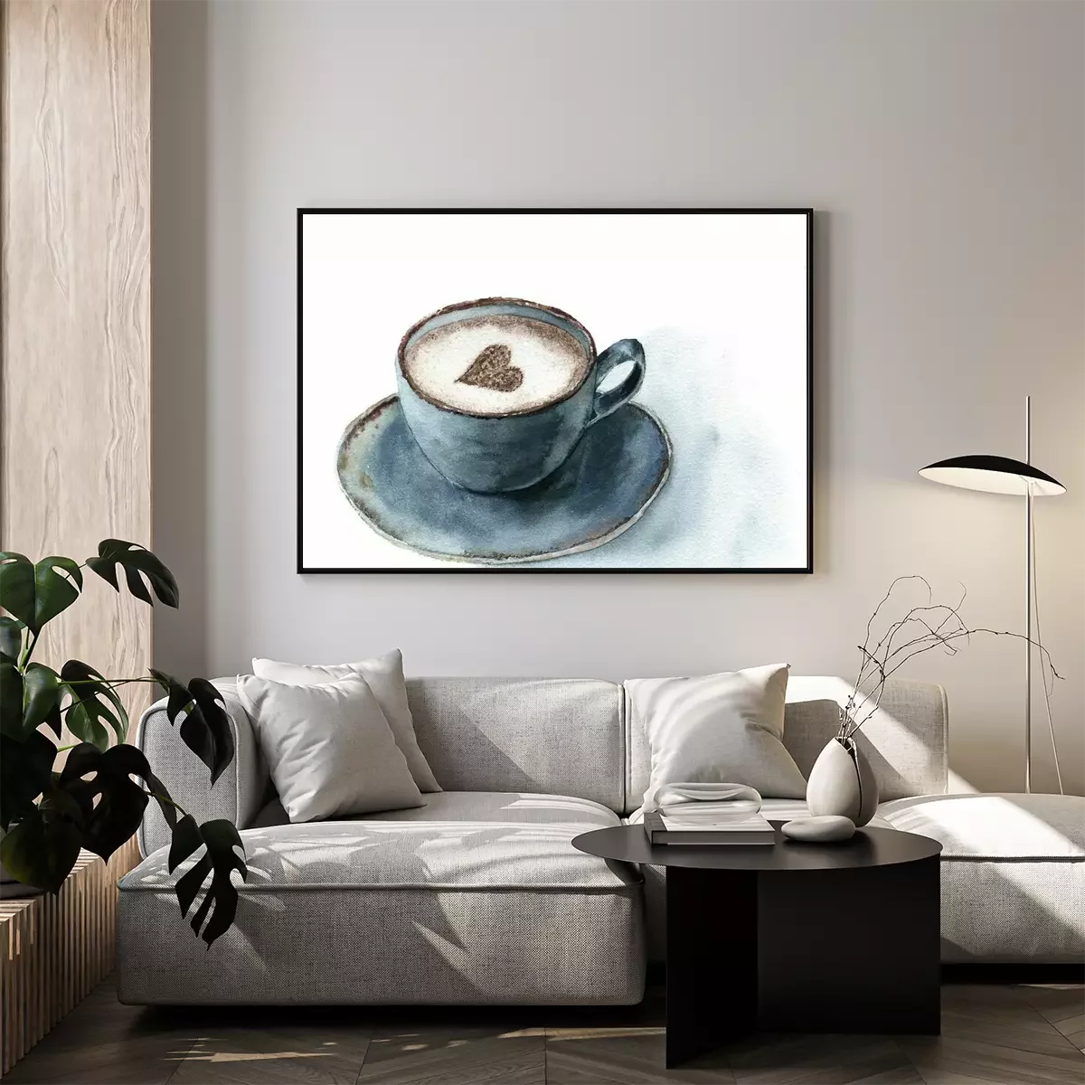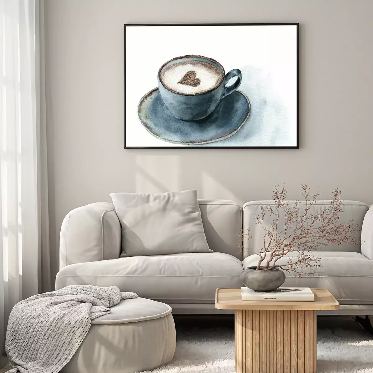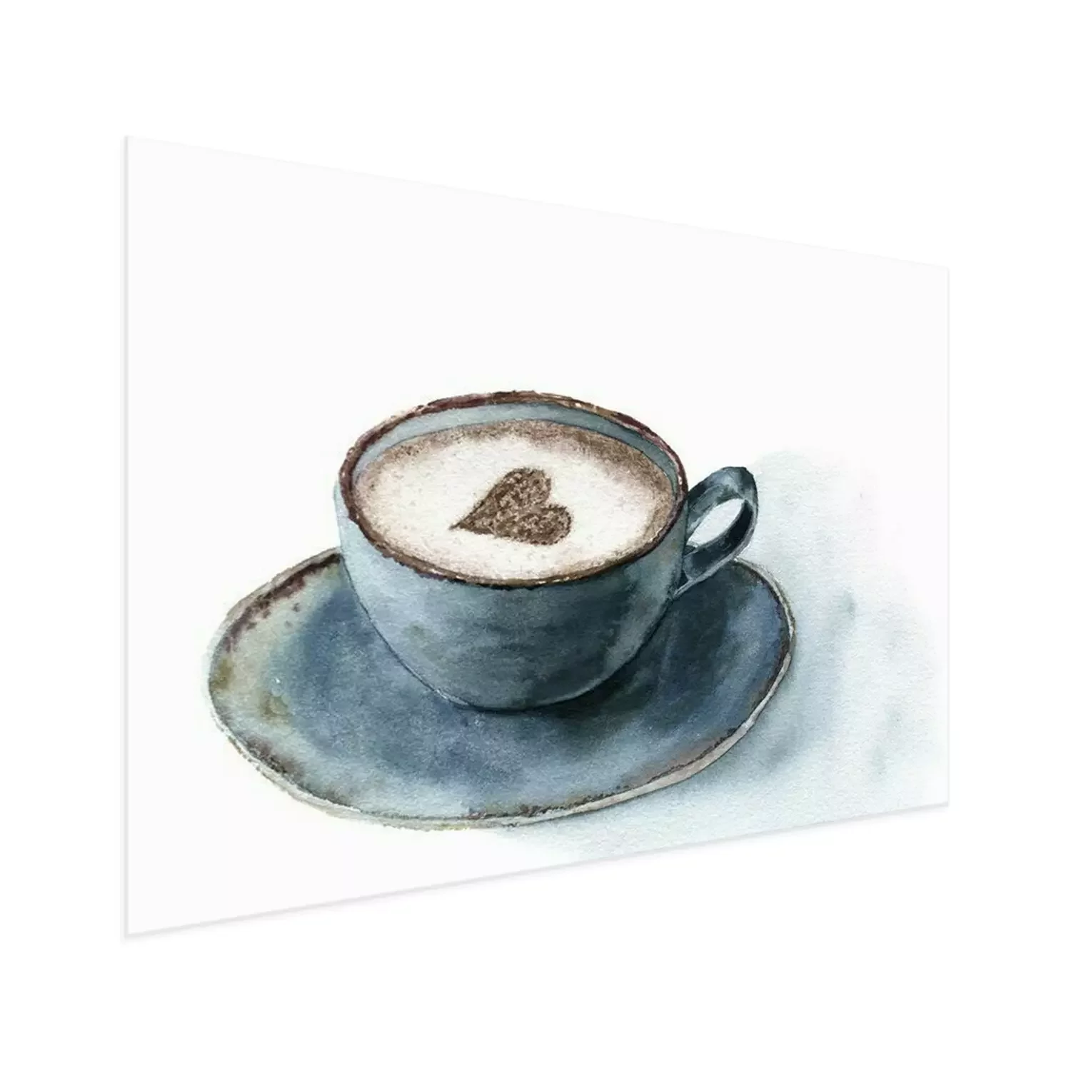 Poster Aquarell Tasse Cappuccino mit Zimt Herzdekor. Essen Illustration mit blauen Tasse Kaffee auf weißem Hintergrund. Handgemalter Druck für Design oder Druck.